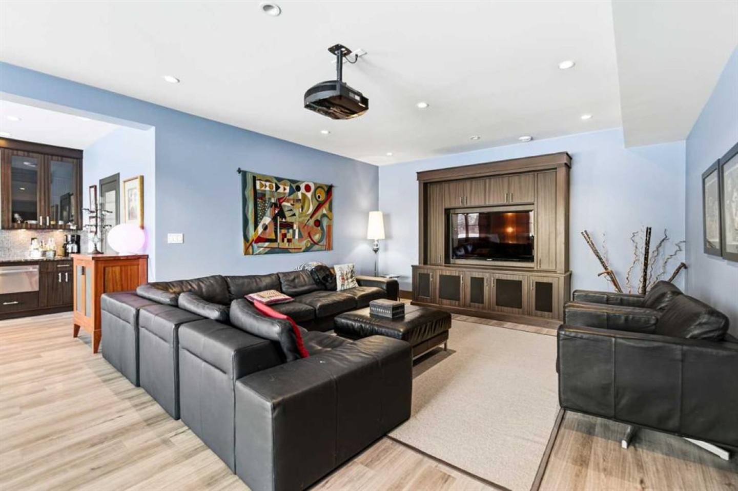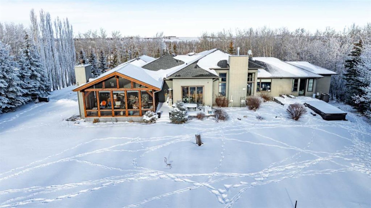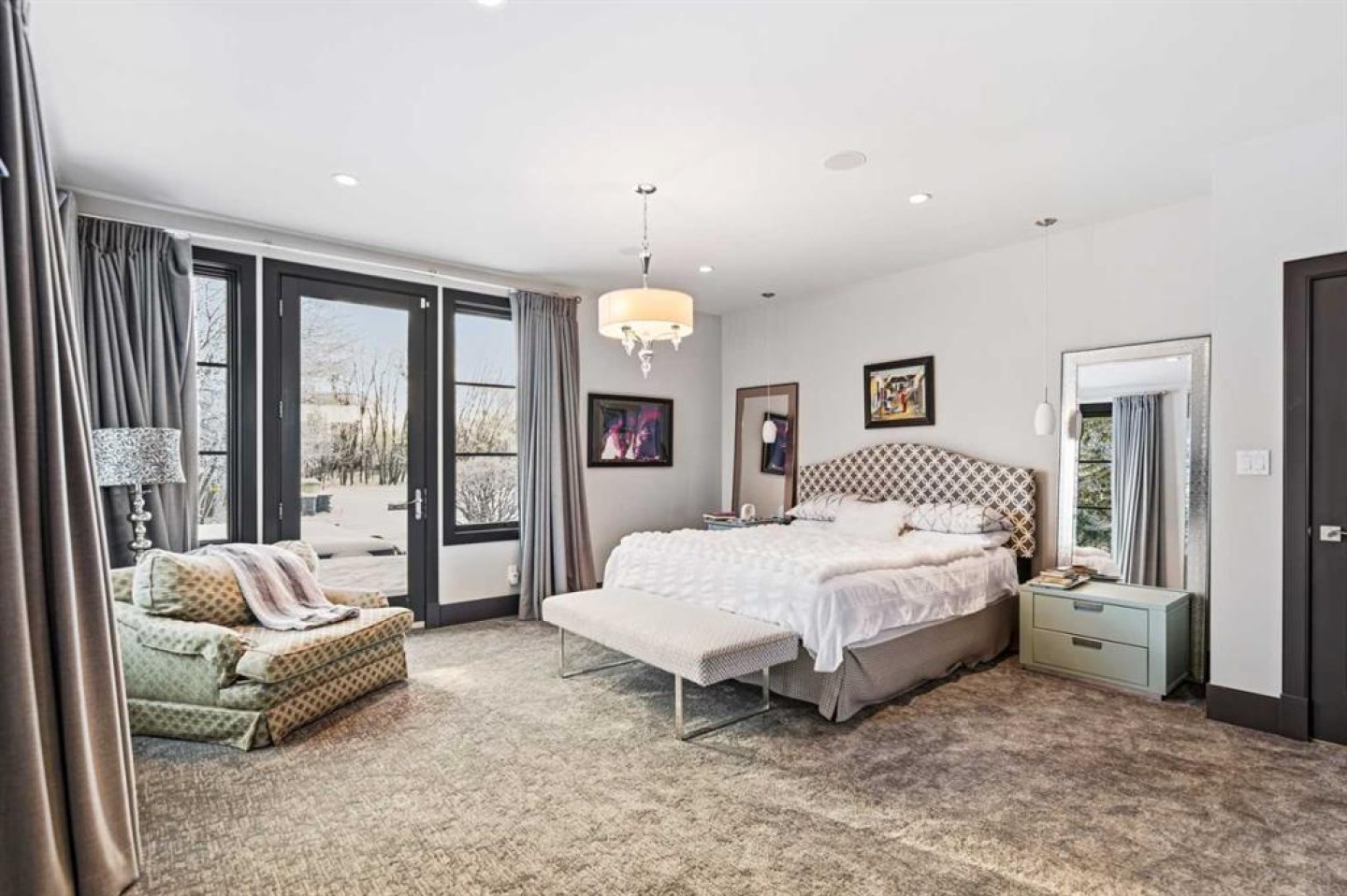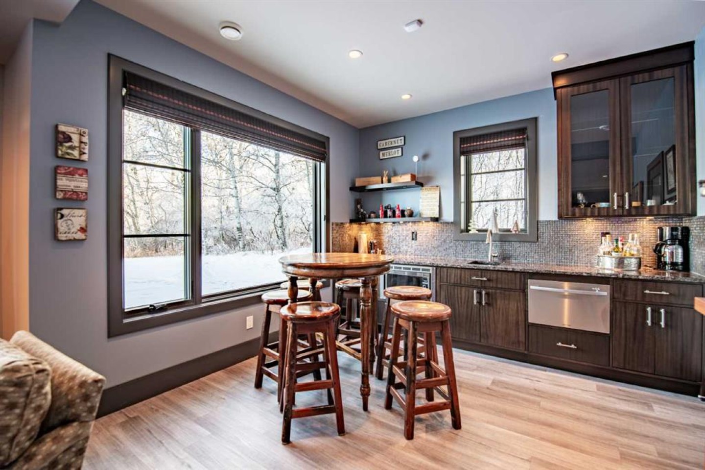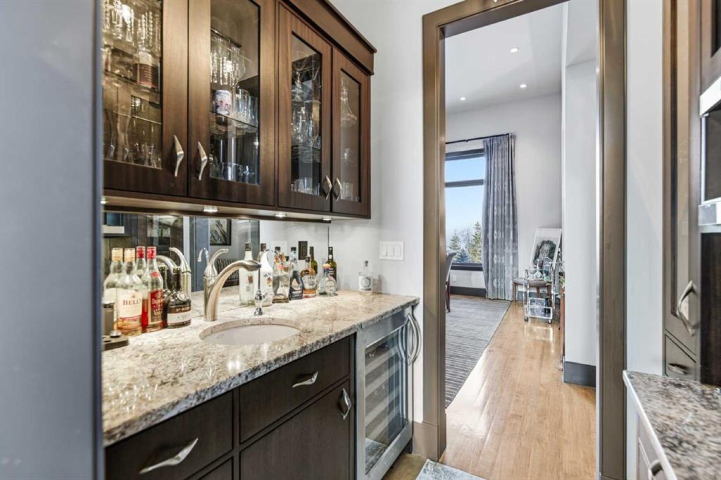 A sophisticated contemporary estate nestled on 1.93 acres, just minutes from the City. Built by Bowood, this exceptional bungalow offers approximately 6,000 sq. ft. of refined luxury living, thoughtfully designed with extraordinary attention to detail throughout. A grand entrance welcomes you into the stunning great room, highlighted by a floor-to-ceiling gas fireplace framed by expansive corner windows, creating a bright and inviting space that sets the tone for this four-bedroom, five-bathroom residence. The open-concept layout seamlessly connects to a chef’s kitchen designed for the most discerning culinary enthusiast. Anchored by an impressive 11-foot granite island with prep sink and built-in dishwasher, the kitchen also features custom cherry wood cabinetry, a built-in refrigerator with designer hardware, induction cooktop, wall oven, steam oven, and a striking glass tile feature wall complemented by a sleek stainless-steel hood fan. A spacious butler’s pantry with a second dishwasher provides abundant storage and functionality. Off the great room, a walk-through coffee and tea bar leads into the elegant dining room, complete with floor-to-ceiling built-in cabinetry and a large picture window that floods the space with natural light. This bright and airy ambiance extends into the expansive three-season room featuring vaulted wood-clad ceilings, west-facing windows, a wood-burning fireplace, and a built-in BBQ with hood fan—perfect for entertaining while overlooking the fully landscaped grounds. The luxurious primary suite is conveniently located on the main level and offers a spa-inspired ensuite with a deep soaker tub, fully tiled shower, double vanity, and a generous walk-in dressing room with built-in features. Completing the main floor is a private office or additional bedroom, an oversized mudroom and laundry area, and a rare three-car attached garage with additional space for motorcycles or yard equipment. The lower level is designed for entertainment and relaxation, featuring a large TV and games room, wet bar, wine cellar, and dedicated home gym. This level also includes a bedroom with private ensuite, two additional spacious bedrooms, and a full bathroom. Additional highlights include a multi-zone Sonos sound system, whole-home water filtration, main-floor air conditioning, multi-zone in-floor heating, outdoor water feature, pizza oven, and RV parking. This architectural masterpiece is designed to impress, offering an exceptional lifestyle that will captivate guests and inspire everyday living.