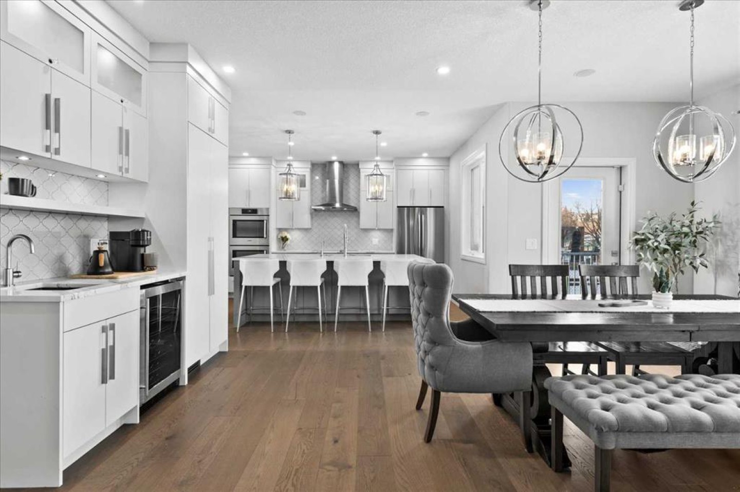 Upstairs, retreat to the breathtaking primary bedroom with gas fireplace and access to a private balcony—the ideal place to enjoy your coffee at sunrise or take in the mountain views at sunset. The ensuite is a stunning 7 pce spa-like retreat with underfloor heating. Two additional bedrooms, a beautifully renovated 4-piece bath, over sized family/media room and convenient upper-level laundry complete this level. The fully developed lower level offers additional living space including a fourth bedroom, generous family room, work out area and a renovated 3-piece bathroom—ideal for guests or growing families.