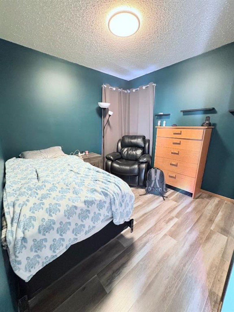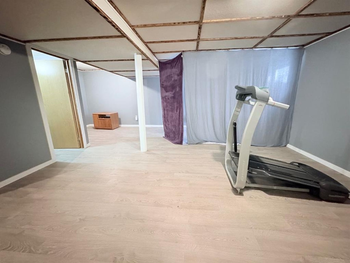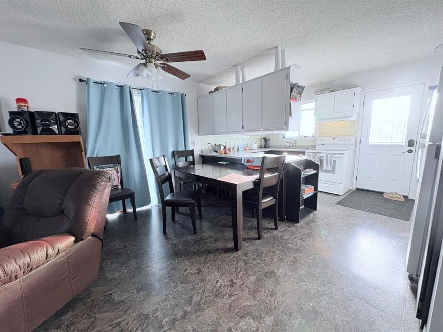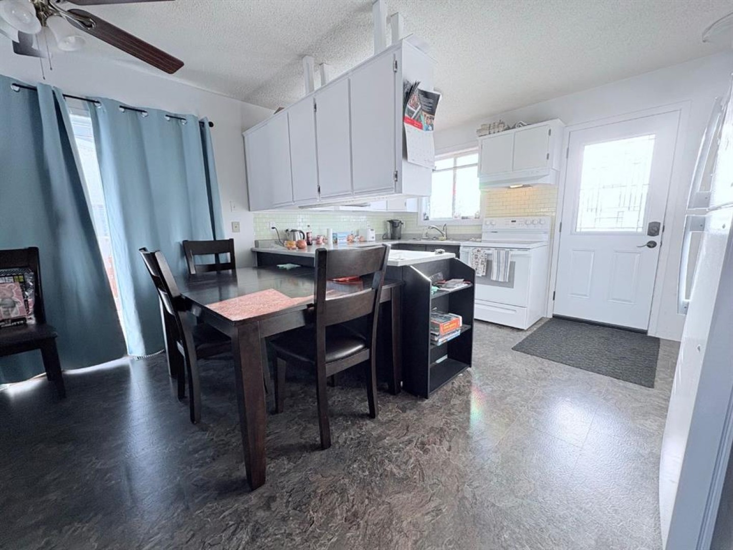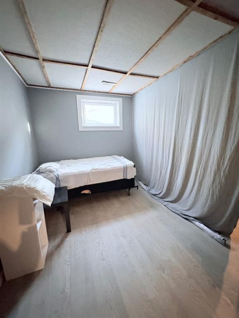 The main level features two bedrooms, a four-piece bathroom, and a functional kitchen with painted cabinetry, laminate countertops, and updated refrigerator, stove, and hood vent. The finished basement adds valuable living space with a large family room, office area, and a convenient two piece bathroom. Basement improvements include updated drywall, subflooring, flooring, trim, and paint.