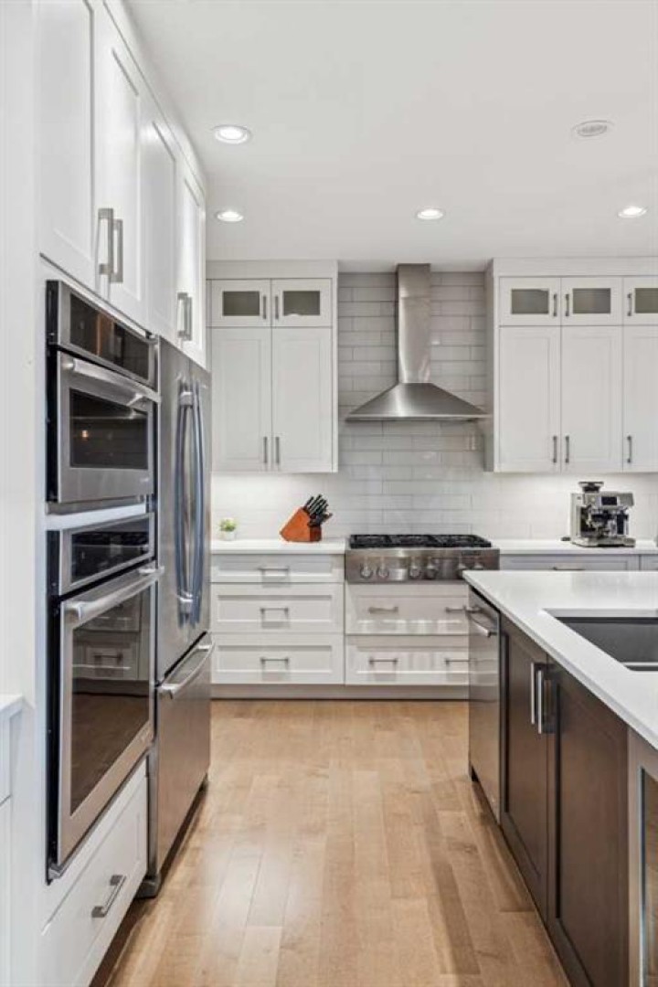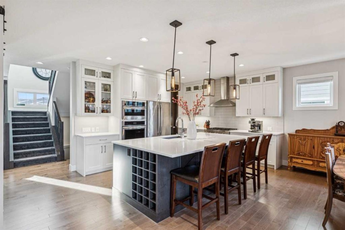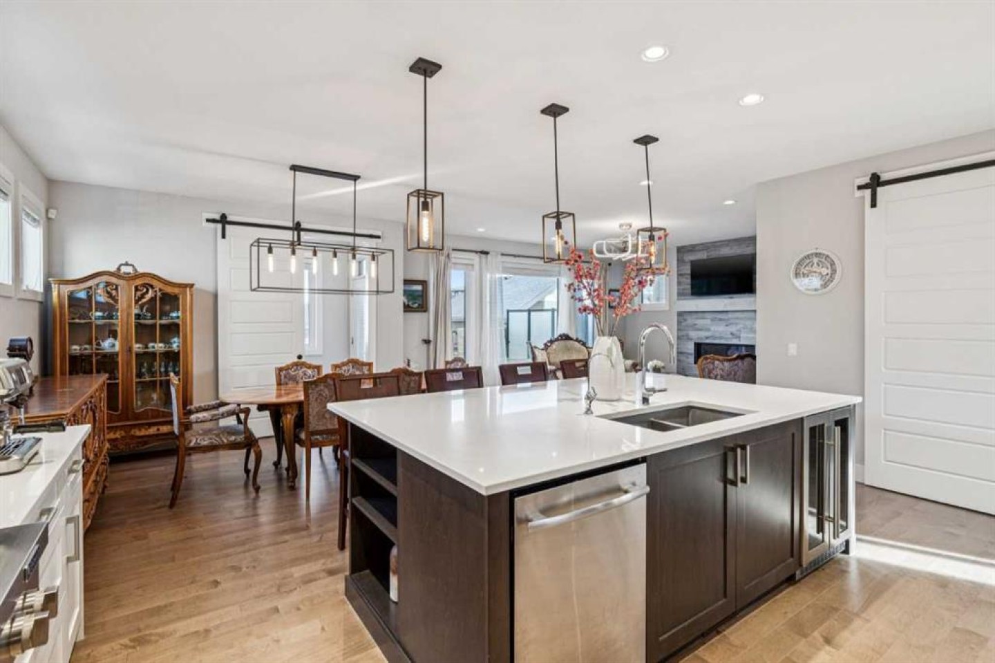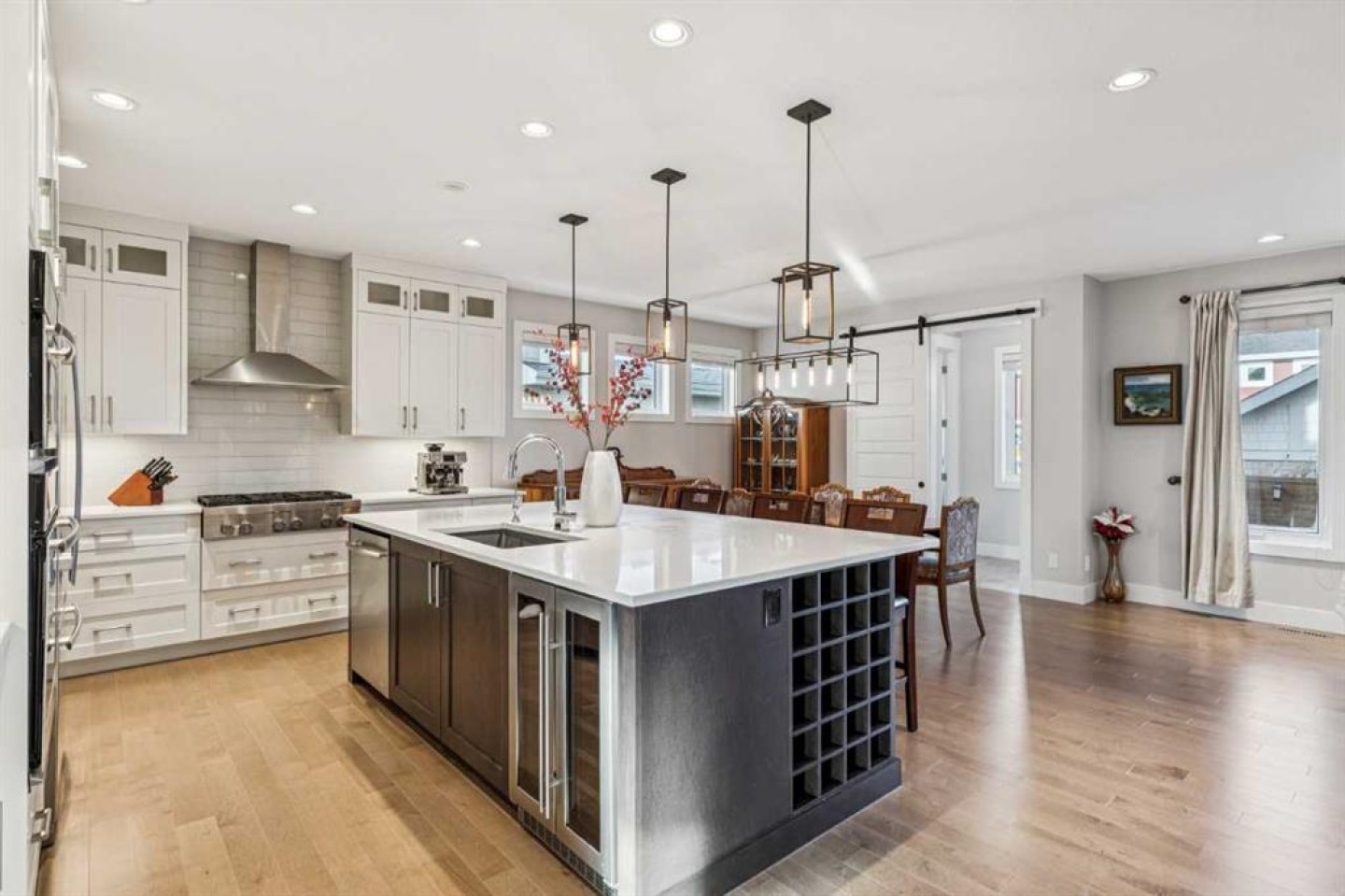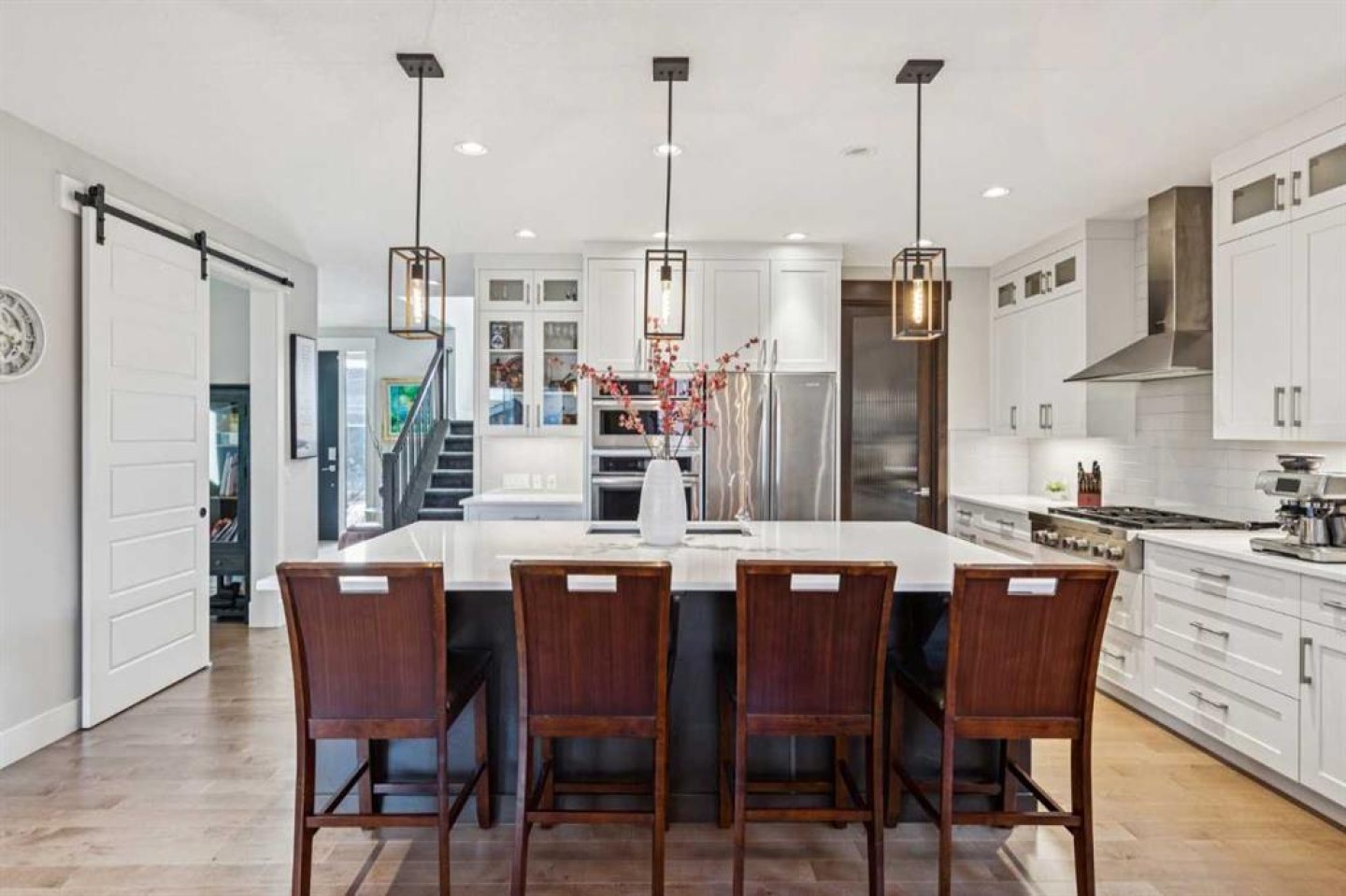 The open-concept main floor features hardwood flooring, a kitchen with full-height cabinetry, quartz countertops, gas cooktop, walk-in pantry, large island with wine fridge, and a dedicated main-floor office with sliding barn door.