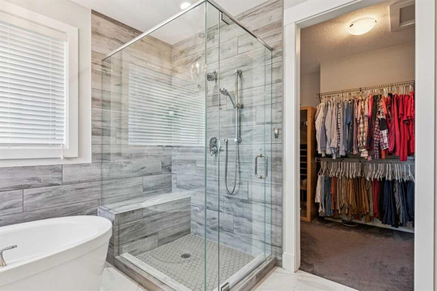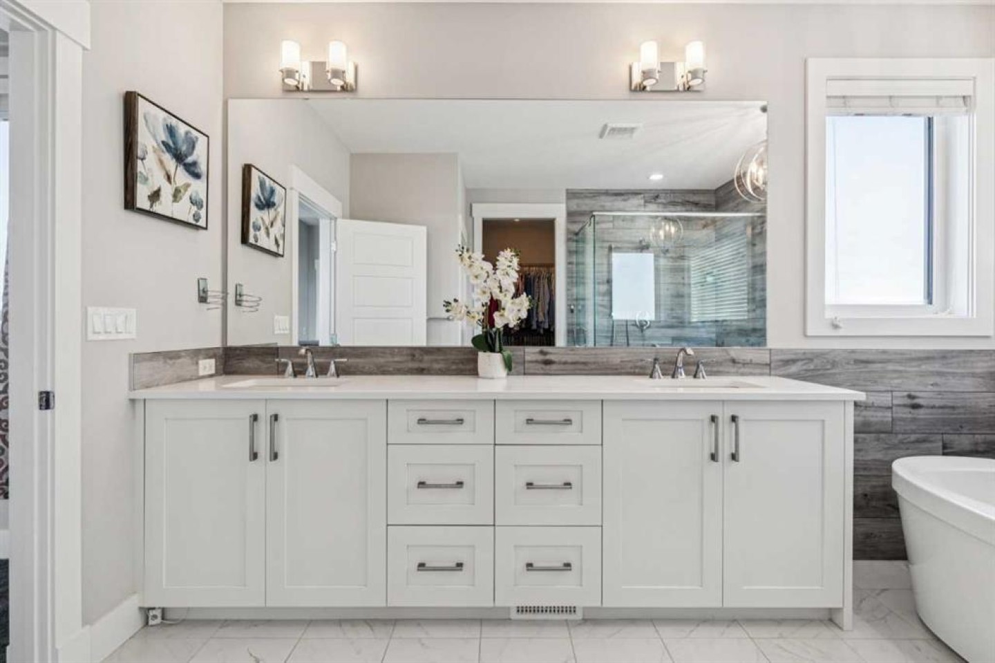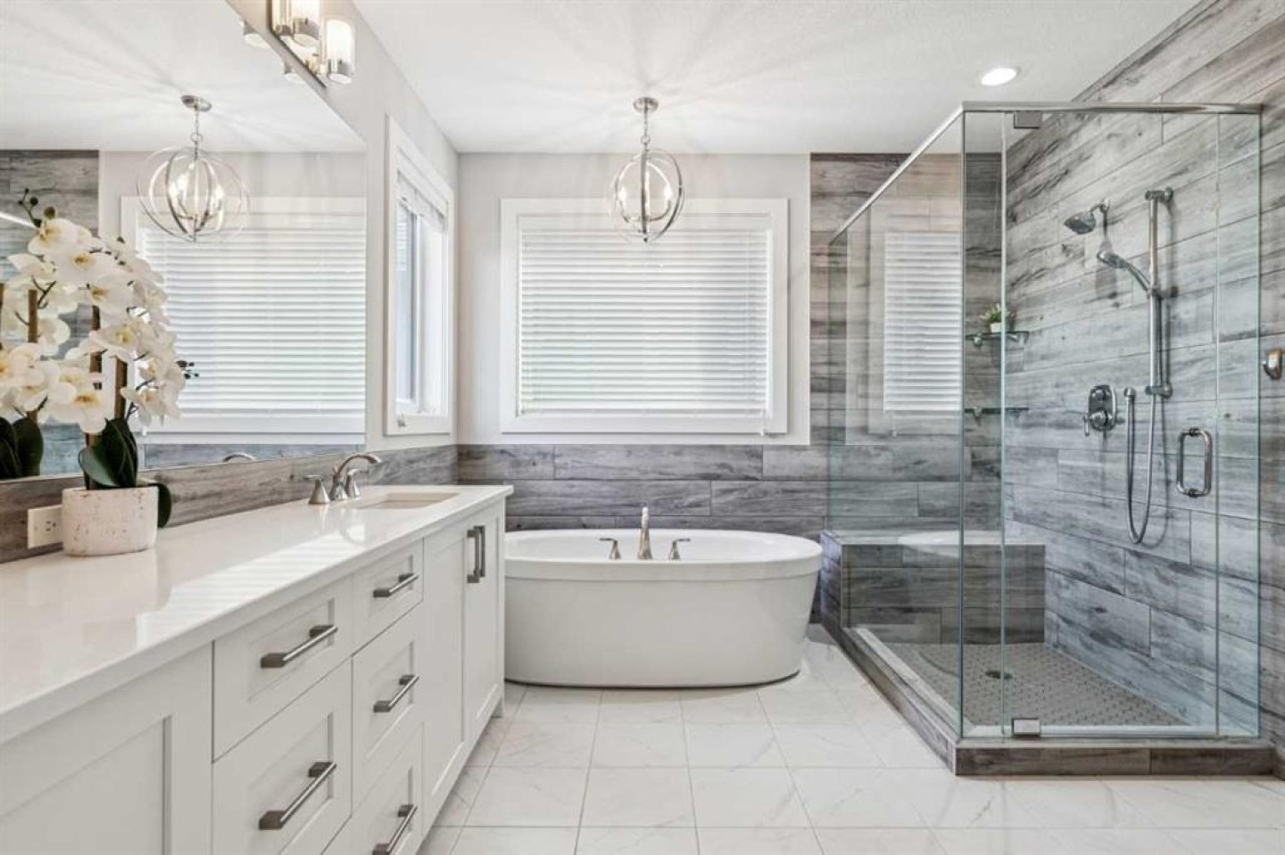 Upstairs, the primary bedroom includes vaulted ceilings and an ensuite with heated floors, soaker tub, glass shower, and walk-in closet with private sauna.
