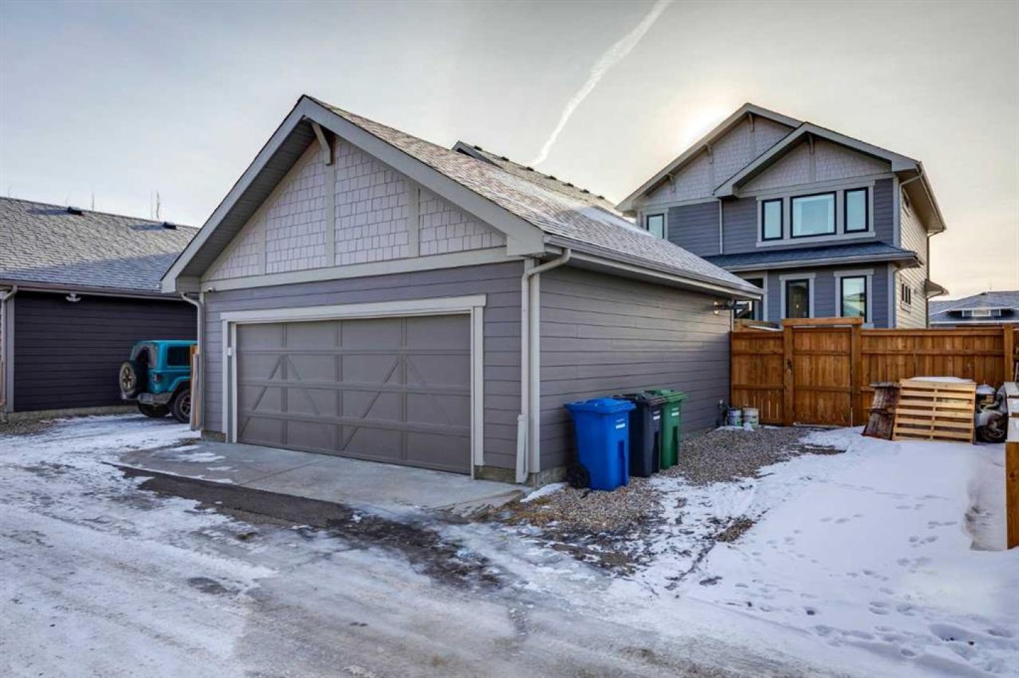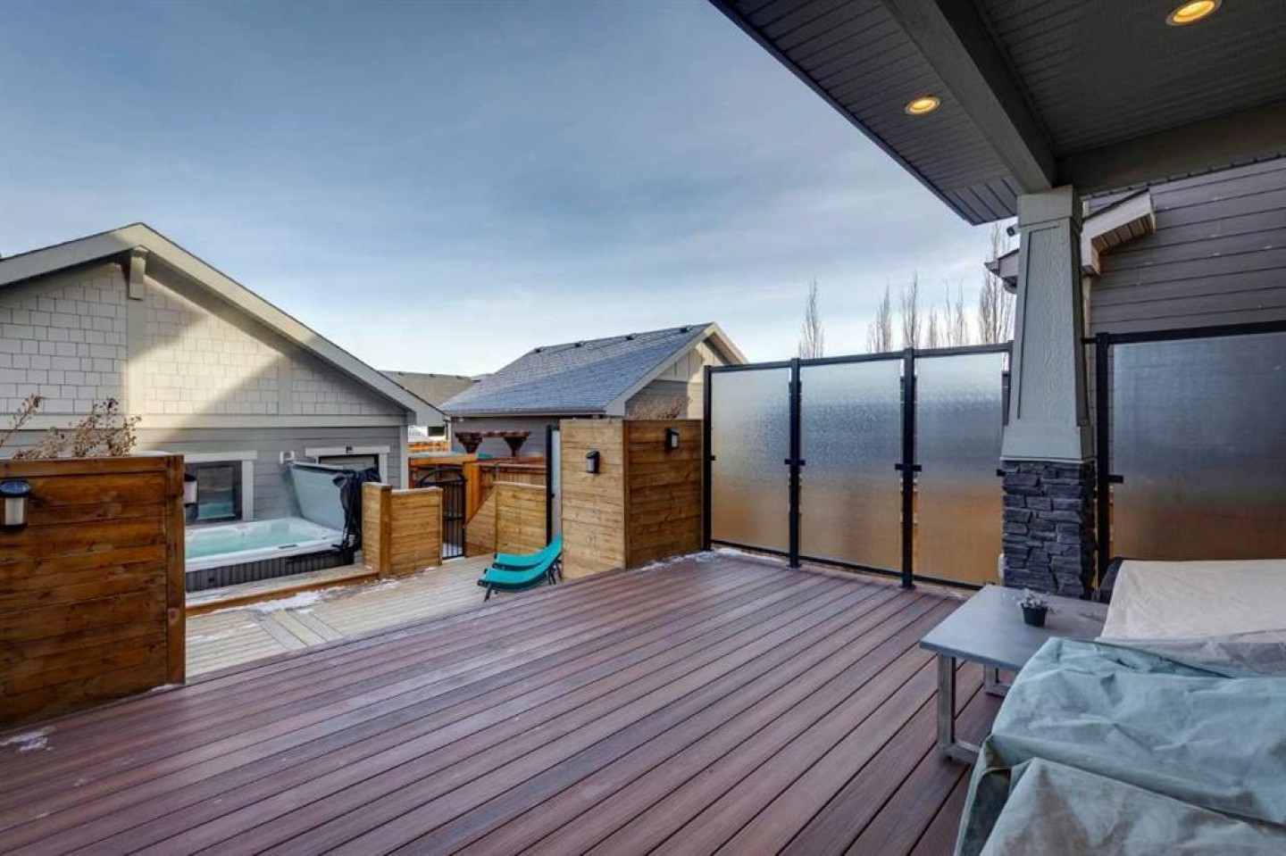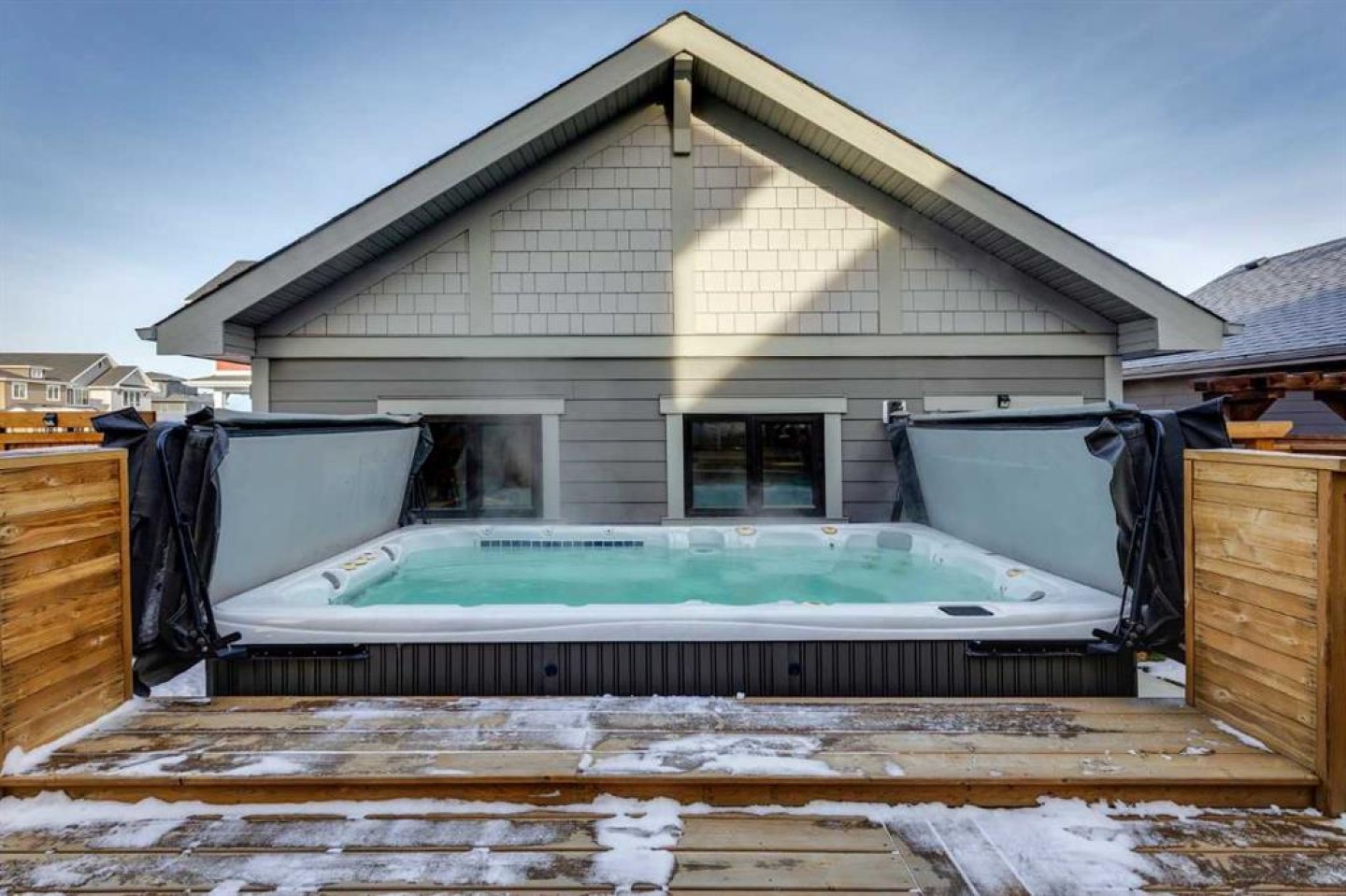 The fenced backyard includes a swim spa, deck, patio, and professional landscaping. The heated and insulated garage features epoxy flooring and 220V power.