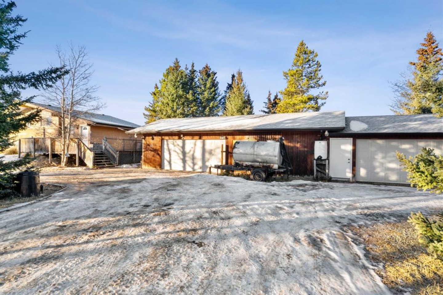 Immediate possession available! Welcome to 17 Gibson Road, a rare opportunity to own a peaceful 1.25-acre property surrounded by rolling hills, mature trees, and mountain views. This charming acreage offers the perfect blend of privacy, space, and convenience, set in a quiet community of Benchlands just minutes from Cochrane and within easy reach of Calgary. The home is warm and inviting, highlighted by a striking floor-to-ceiling stone fireplace that anchors the main living area and creates a cozy focal point. Vaulted ceilings, exposed wood beams, hardwood flooring, and large windows fill the space with natural light while framing picturesque views of the surrounding landscape. The updated kitchen features crisp white cabinetry, new stainless steel appliances, dark countertops, a farmhouse sink, and a modern tile backsplash, flowing into a bright dining area ideal for everyday living or hosting family and friends. The main level offers a comfortable primary bedroom, a full bathroom, and a welcoming foyer, providing a functional layout for both families and those seeking main-floor living. The fully developed lower level expands the home’s versatility with an additional bedroom, a dedicated office, a full bathroom, and generous storage, along with a large utility and laundry area. The roof to the home and both detached garages was redone in 2025. Outdoors, the expansive deck invites you to relax, entertain, and take in the peaceful surroundings. The 1.25-acre parcel offers open space, mature evergreens, fenced areas, and mountain views creating a true country-living atmosphere. The property is exceptionally well-suited for hobbyists and outdoor enthusiasts, featuring a heated triple detached garage, an additional double detached garage, and ample room for RV parking, trailers, and equipment. The roof on the house, the triple detached garage, and the double detached garage was new in 2025. New Septic system.