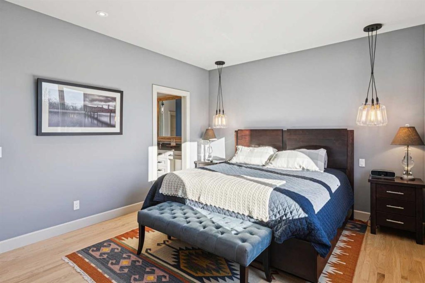 The French countryside awaits you in this spectacular 2,900 square foot one and one-half storey bungalow on a two-acre lot in the three-time award-winning “Canada Community of the Year”, Elbow Valley. Nestled in the Elbow River Valley, just west of Calgary, this prestigious community offers genuine estate living alongside unrivalled amenities. This beautifully upgraded and renovated home offers a dramatic open staircase, two storey foyer and great room ceilings, refinished quality hardwood floors throughout the main floor, staircases, and upper level. The professionally renovated kitchen was expanded and features shaker-style cabinets with soft- close doors, quality Wolf and JennAir stainless steel appliances, a feature center island with a special one-piece curved leather-finished granite cooktop. The formal dining room, warm and inviting with its coffered ceilings and hardwood floors, is perfect for entertaining. The main floor primary bedroom features a walk-through closet with custom built-ins and a luxurious ensuite bathroom that has heated porcelain tile floors, 10-mil glass shower, quartz vanity countertops, and double sinks. Overlooking the great room below, the upstairs boasts two large bedrooms, each with a full ensuite bath, walk-in closets, and incredible views. Professional walkout basement development is perfect for the mature family with a billiards/games room, a family room with a built-in entertainment center, a custom bar, a second fireplace, a full bath, two more bedrooms with new flooring, and multiple storage spaces to utilize by design. No-maintenance landscaping designed to blend into the natural surroundings features an exposed aggregate patio, a dry creek bed, a continuous curb, a natural Rundlestone exterior, and total privacy. Oversized triple attached heated garage with a developed 300 sq. ft. bonus room, perfect for a man cave, home office, or storage. Walk-up staircase to the garage, slab heating in the basement, upgraded mechanical, and 200-amp service. A blend of smooth-finished and knocked down stipple ceilings, renovated baths, upgraded lighting, solid core doors, nine-foot ceilings, laundry on the main and upper levels, clad windows in good condition, with three new triple pane windows added. From its sweeping views and prime location to its thoughtful design and upgrades, this beautiful Elbow Valley home is an absolute must-see!
