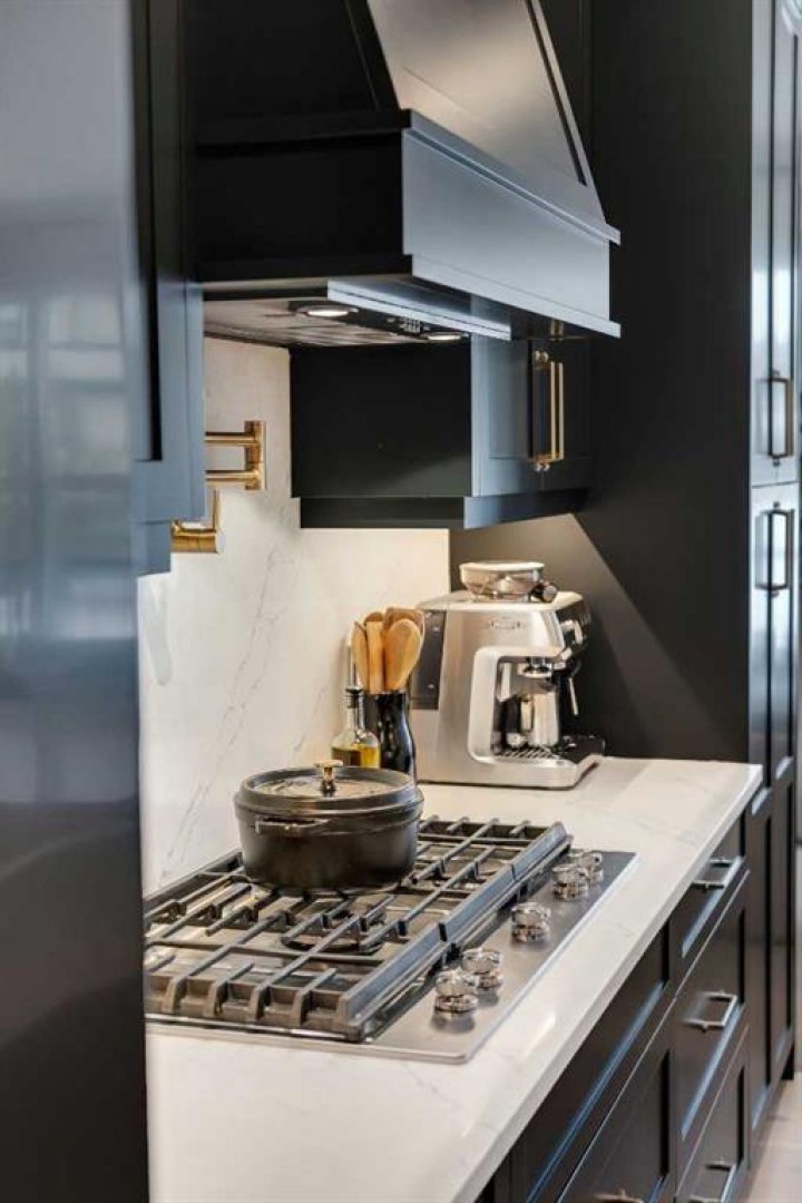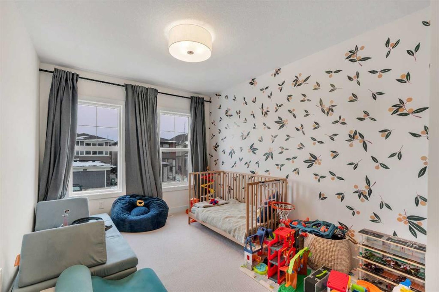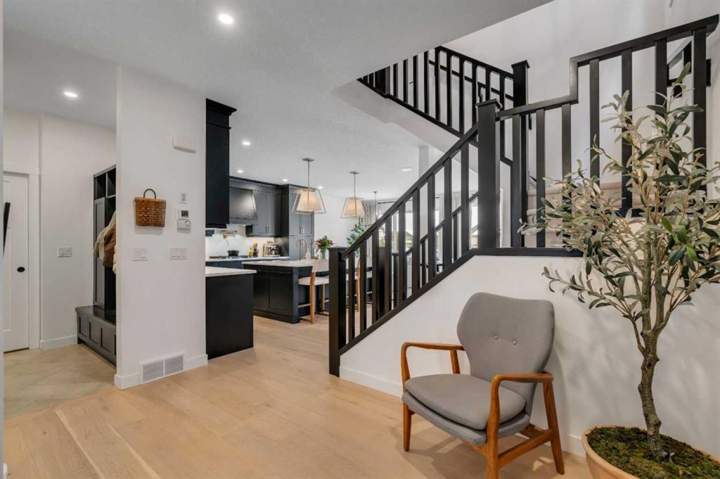Welcome to this stunning, fully upgraded 4 bedroom, 3.5 bath home in the highly sought after community of Cranston’s Riverstone. Perfectly positioned backing onto green space and just steps from the river, walking paths and the pond, this 2,402 sq.ft home blends luxury finishes with thoughtful design. The main floor offers an elongated entryway leading to an open concept living area flooded with natural light, a beautiful gas fireplace surrounded by custom built ins, a gourmet kitchen with quartz counters and backsplash, upgraded KitchenAid black stainless steel appliances, gas range with pot filler, custom hood fan, farmhouse sink, dining room, large walk in pantry and designer lighting. A custom mudroom with built in lockers adds everyday convenience. Upstairs features three bedrooms and two full baths, including a secondary bath with double vanities - perfect for sharing. The primary bedroom impresses with vaulted ceilings, a spa like ensuite, complete with a freestanding tub, rain shower with marble and zellige style tile, separate vanities and a large walk in closet connected to a convenient laundry room. A spacious vaulted bonus room completes the upper level. Downstairs, the fully finished basement includes a fourth bedroom, office space, full bath, wet bar with quartz counters/sconces and a cozy living area with an electric fireplace - ideal for entertaining. With over 100k in premium upgrades, including heated floors, custom cabinetry, built in speakers, smart lighting and rough ins for A/C and central vac, this home offers modern comfort and timeless style in a beautiful natural setting.