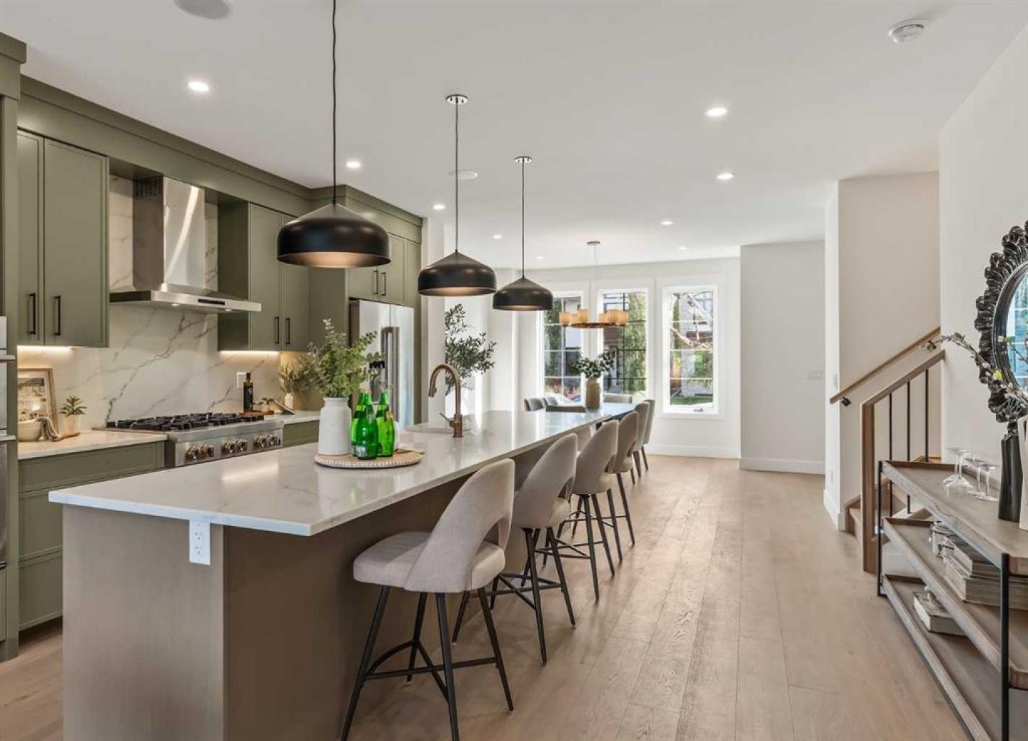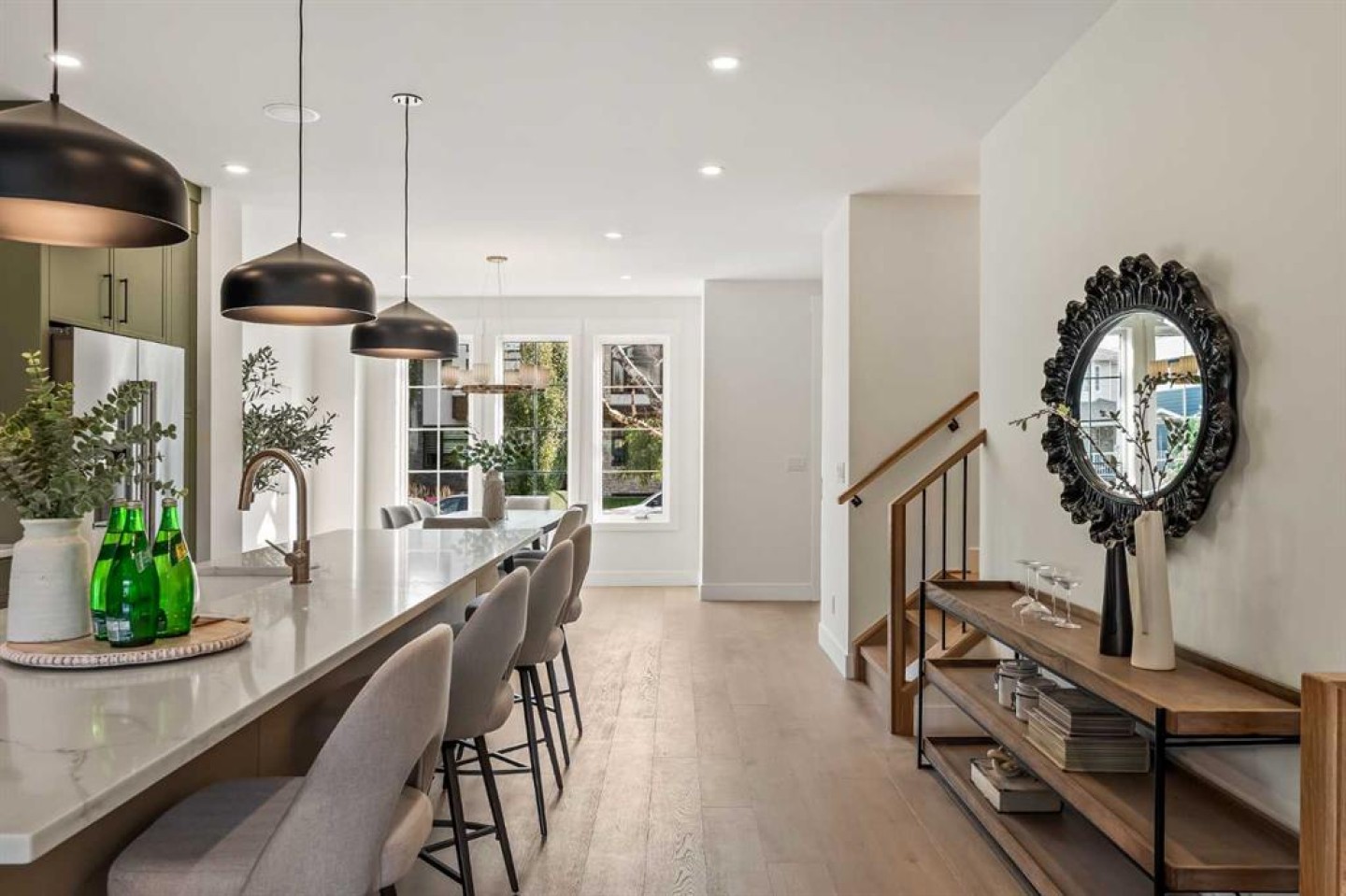 Proudly presenting a stunning urban-inspired masterpiece in coveted Killarney. Thoughtfully designed & impeccably crafted, this three-story residence offers nearly 3650 SF of refined living space. The open-concept main floor showcases striking architectural details, including white oak hardwood floors, custom-milled cabinetry, oak & metal railings, & expansive windows that bathe the interior in natural light. The kitchen stands as a true showpiece featuring bespoke cabinetry with undermount lighting, exquisite quartz slab countertops & backsplash, premium JennAir appliances, Silgranit sink, & a impressive 12-foot island with seating for five. In the living area, a handsome floor-to-ceiling fireplace surround, & 8-foot garden doors make a bold yet sophisticated statement while white oak hardwood, mullioned windows, & an inviting dining area further elevate the curated, light-filled main floor. Completing the level is a convenient mudroom with built-ins & a pretty powder room. The gorgeous oak hardwood continues to the second level where the centrally situated bonus room is flanked by two distinguished bedrooms, each boasting its own ensuite with custom vanities, quartz counters, & beautifully tiled showers with glass doors while spacious walk-in closets with built-ins & large windows enhance the comfort & appeal of these inviting retreats. The third level is a sanctuary of elegance and comfort. The airy primary suite is flooded with natural light & features expansive sliding doors to a private balcony perfect for enjoying quiet morning coffee from the convenient beverage centre. The stunning ensuite exudes spa-like luxury with double custom oak vanities & refined quartz countertops, a dramatic steam shower, in-floor heating, & an opulent stand-alone waterfall tub. Completing this exceptional level is a considerable walk-in closet with extensive custom millwork. The professionally developed lower level delivers 900 SF of living space built with the same attention to detail. Providing a spacious family room, wet bar, fitness area, 4th bedroom with walk-in closet, & 5th bathroom this additional level makes an ideal area for entertaining or accommodating family members & guests. Equally impressive is the extraordinary curb appeal displaying genuine brick accents, James Hardie board cladding, acrylic stucco, mullioned windows, & an aggregate patio. The quiet West-facing backyard offers a tranquil setting perfect for children at play, summer barbecues, or simply unwinding at the end of the day. Other notable highlights of this remarkable residence include a double insulated & drywalled garage, Ply Gem windows with 2-year warranty, Delta fixtures, & 200-amp electrical panel. Situated close to parks, shopping, schools, transit, & the vibrant amenities of 17th Ave, this extraordinary property delivers a beautiful lifestyle in an excellent Killarney location. Welcome home to 2013–34 St SW where exceptional design meets timeless luxury.