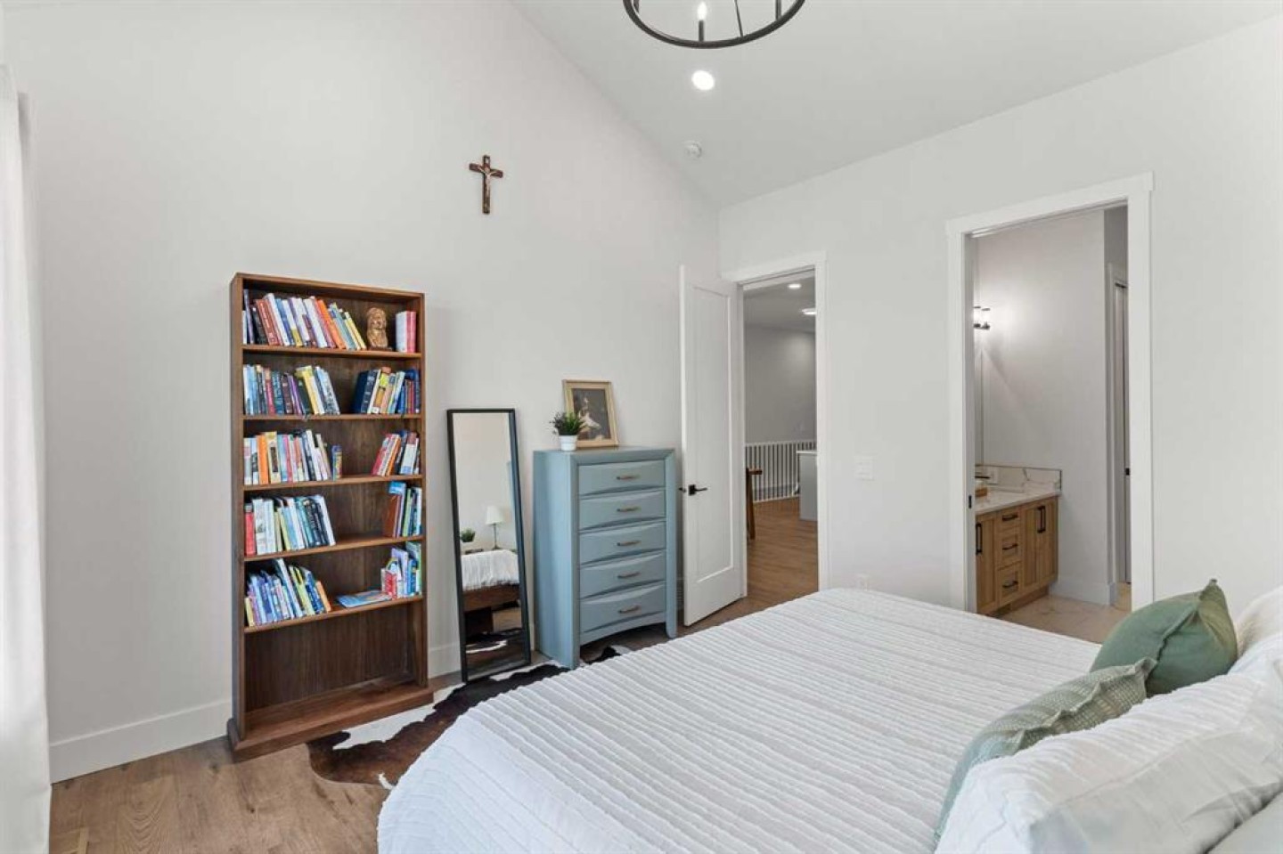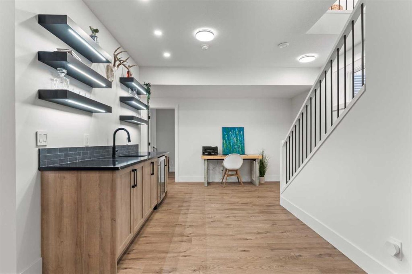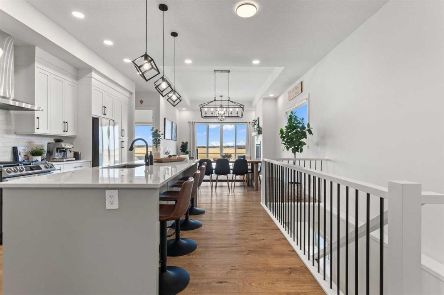 Welcome to extensively upgraded luxury bungalow—this home has been enhanced beyond imagination, offering over 2,500 square feet of beautifully finished living space and the comfort of central air conditioning. Step inside through the front entrance to discover a refined main floor with soaring 10’ ceilings that lead into a chef-inspired kitchen featuring a gas range, full-height chimney hood fan, quartz countertops, premium soft close cabinetry, and an upgraded pantry with sliding drawers. The space opens seamlessly to the living and dining area, where an 11’ tray ceiling, cedar mantel, and gas fireplace create an elegant yet inviting focal point. The primary suite is a true retreat with a dramatic 13’ vaulted ceiling, flowing into a spa-like 5-piece ensuite and a custom walk-in closet with built-in organizers. A stylish den or home office sits just off the main living space behind a striking 10’ cedar barn door, complemented by a beautiful full bathroom. Convenience continues with a thoughtfully designed laundry room and mudroom with lots of storage. The oversized double garage features epoxy flooring, mezzanine storage, hot and cold hose bibs, and in-floor heating, extending the home’s comfort and luxury beyond the interior. Completing the package is a true 9’ basement with in-floor heating, wet bar, two bedrooms , full washroom, and cold storage. It doesn’t stop with the interior- outside this home features Hardie Board siding, custom cedar gables and a fully equipped Eufy security system. This home is also fully landscaped with sodding and washed gravel fireplace and partially fenced. Its unbeatable location is close to schools, the golf course, scenic walking paths, and everyday shopping.