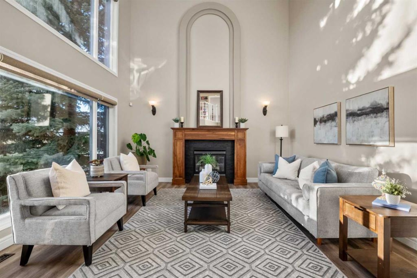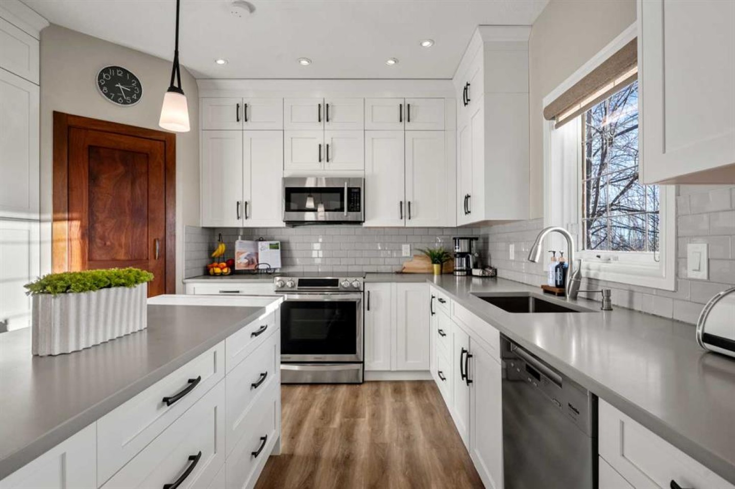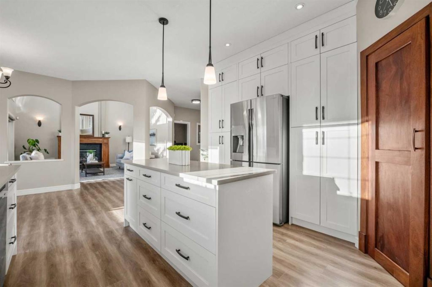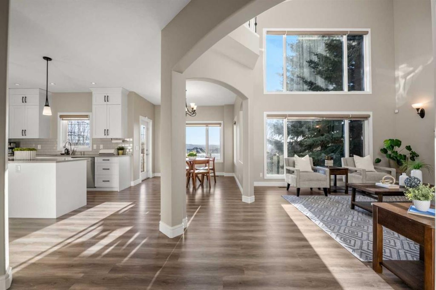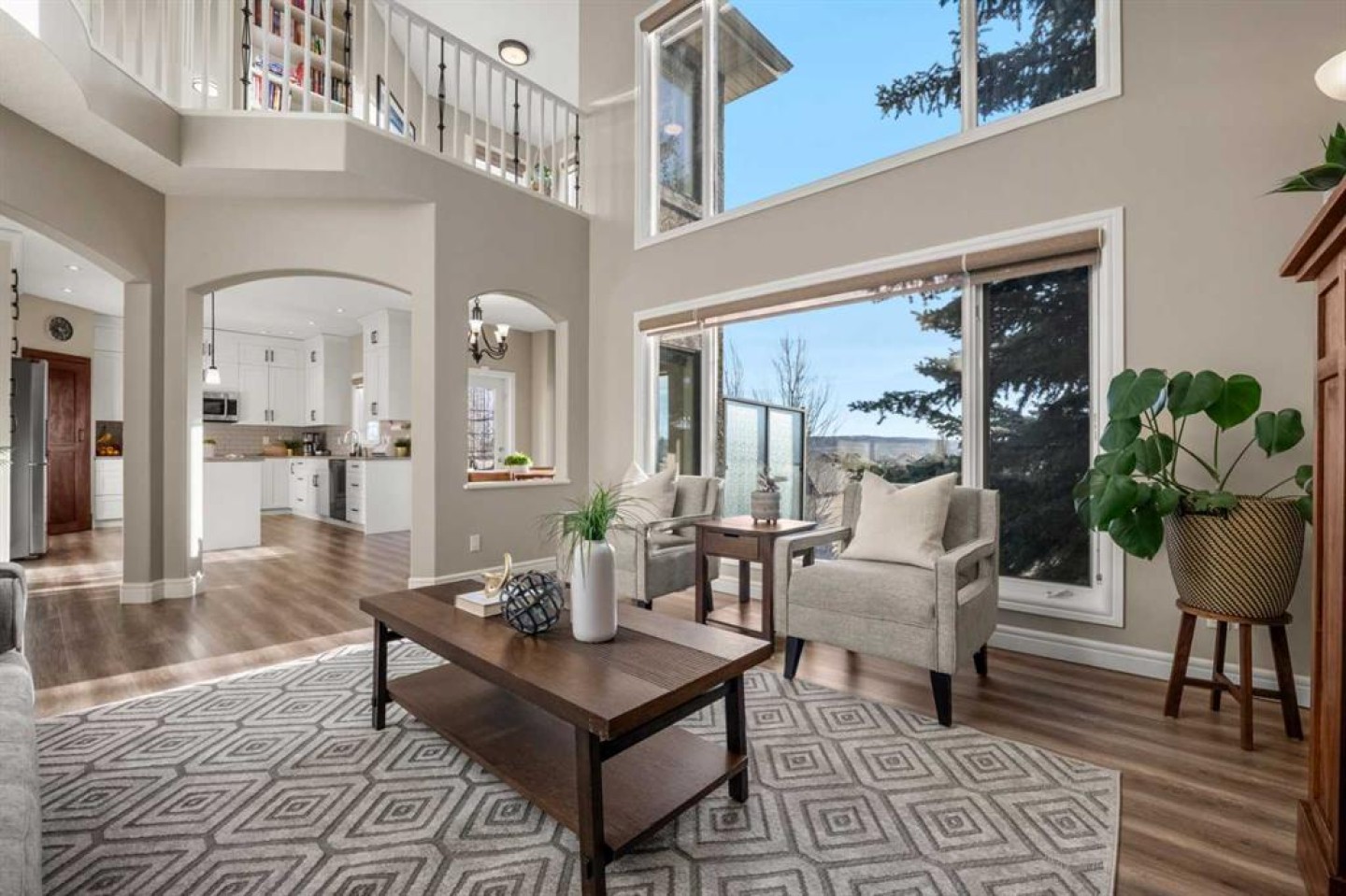 The heart of the home is the breathtaking living room with two-storey ceilings, a fireplace with solid wood mantle, and a full wall of windows capturing endless sunlight and sweeping mountain views. The adjacent renovated kitchen is bright and elegant, offering ceiling-height white cabinetry, quartz countertops, stainless steel appliances, a mahogany-paneled pantry door, and a spacious dining area with access to the south-facing balcony overlooking the neighbourhood and the Rockies.