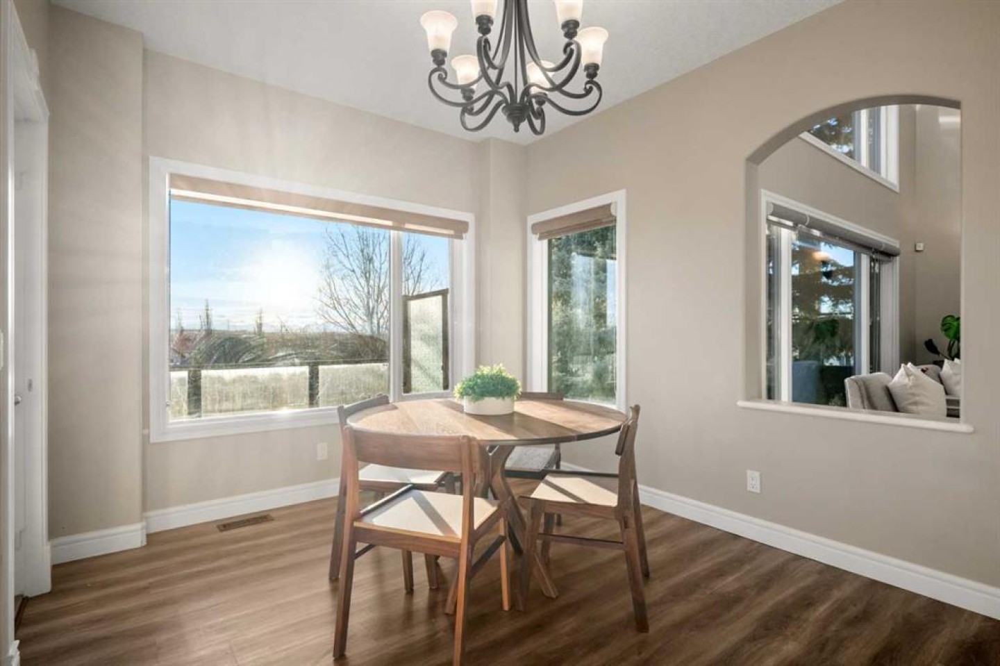 The luxury vinyl plank flooring continues up the spiral staircase, where you are greeted by newly installed carpet on an open-to-below landing with wrought-iron railing and a cozy, inviting nook—perfect for reading or quiet mornings. The luxurious primary suite is spacious with breathtaking views and features a solid mahogany door to the ensuite, a walk-in closet, heated tile floors, dual vanities, a freestanding soaker tub, and a glass walk-in shower. Two additional massive bedrooms across the floating landing anchor the upper level and share a well-appointed bathroom complete with walk-in shower.