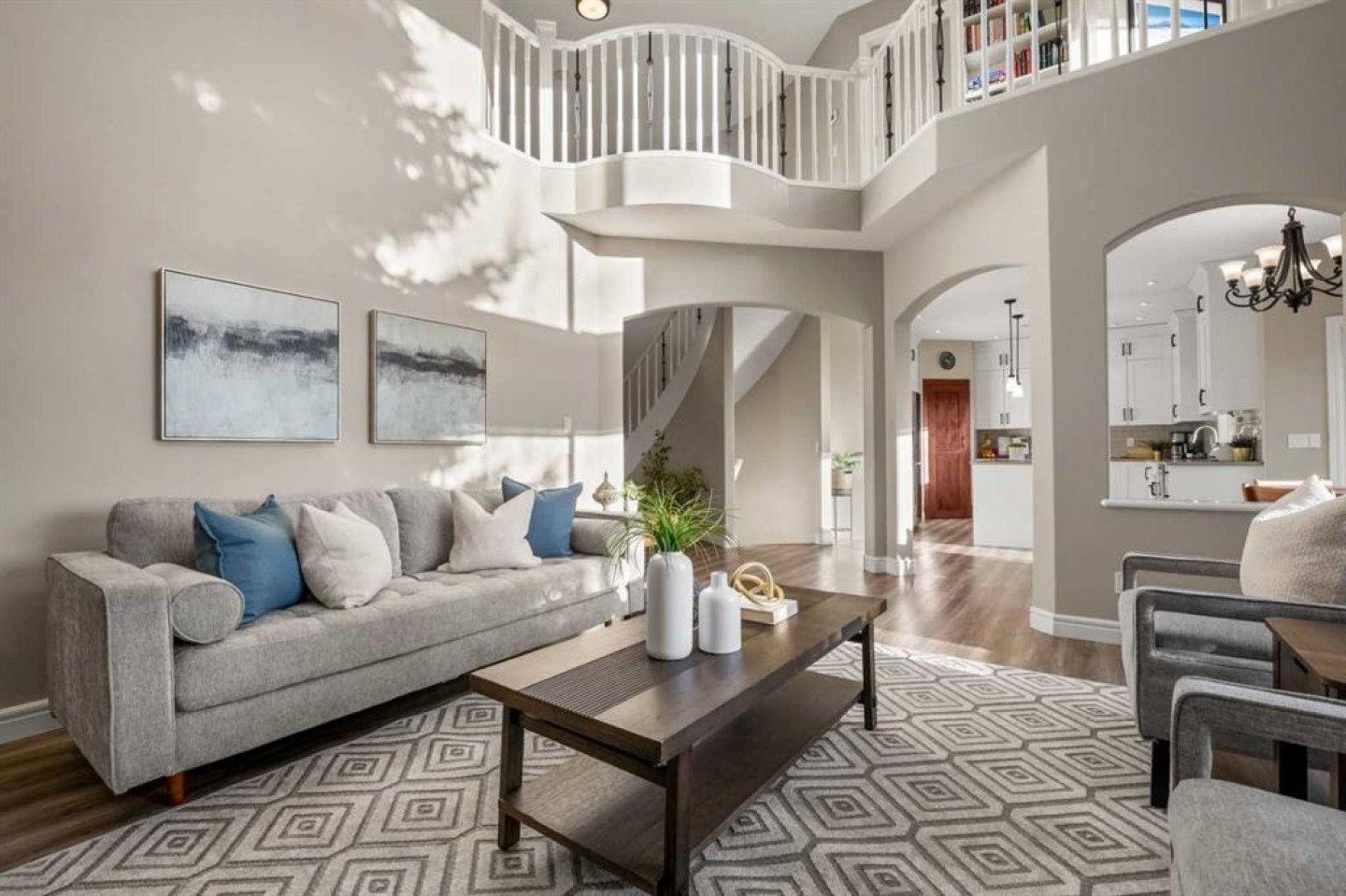 Inside, you are immediately greeted by an elegant spiral staircase with wrought-iron railing that curves dramatically to the upper level. The main floor features a flexible front room ideal as a dining room, music room, or additional living space. A spacious main-floor office, an updated guest bathroom, and a beautifully designed laundry/mudroom complete this functional area.