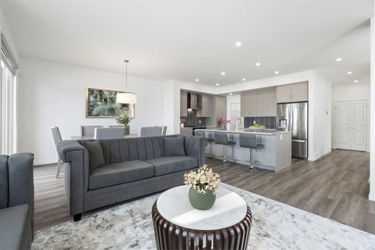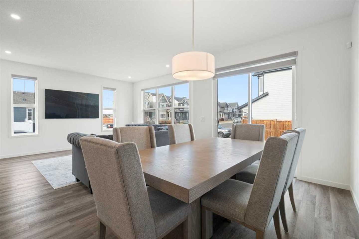 Step inside to an open-concept main floor designed for both entertaining and functionality. The spacious kitchen impresses with granite countertops, a large island, stainless steel appliances including a built-in microwave, and a walkthrough pantry that conveniently connects to the mudroom. The corner living room is bright and inviting with plenty of windows, while the dining area overlooks the backyard — ideal for family gatherings or relaxed evenings at home.