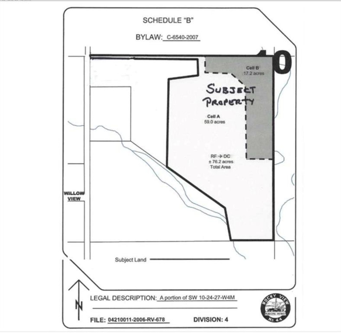 *** SELLER IS WILLING TO DO VTB UP TO 75% / 17.2 ACRES ARE DESIGNATED FOR OUTDOOR RV STORAGE (APPROVED FOR 800 UNITS) *** 75.73 (+/-) ACRE PARCEL OF DEVELOPMENT LAND (ZONED DC122) - zoned for Agricultural & Outdoor Recreation Vehicle (RV) Storage Area. SOLID LOCATION - APPROXIMATELY 20 MINUTES TO CALGARY CITY LIMITS & 10 MINUTES TO CHESTERMERE CITY LIMITS AS WELL AS LANGDON CITY LIMITS! On this property, 17.2 Acres have been designated for Outdoor RV Storage with a MAX OF 3 PRINCIPAL BUILDINGS (max combined area shall not exceed 500.0 sq m / 5,382.0 sq ft) and a MAX OF 5 ACCESSORY BUILDINGS (max combined area shall not exceed 200.0 sq m / 2,152.8 sq ft) ------ The rest of the parcel has been assigned Agricultural Area with uses such as General Agriculture, Dwelling, single-detached, accessory to the agricultural use, as well as Accessory Buildings and Private Outdoor Riding Arena! On this parcel you are permitted 3 accessory buildings and 1 primary building. There is a 3000 sq ft building on the parcel, with 1/3 of the space making up for an office and the rest serving as a barn. This parcel has a lot of potential with its location and size - RV storage for people of Chestermere, Calgary and Langdon and it also serves as a good spot for animal lovers! Contact your favorite realtor for a viewing today!
