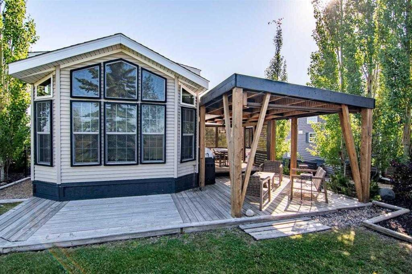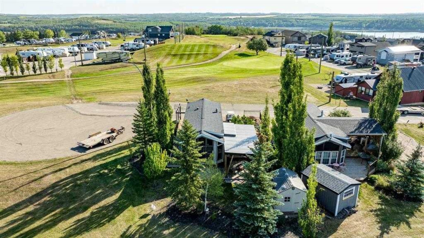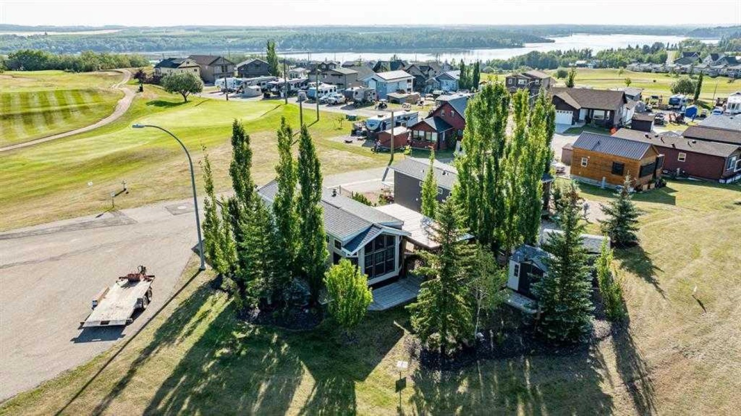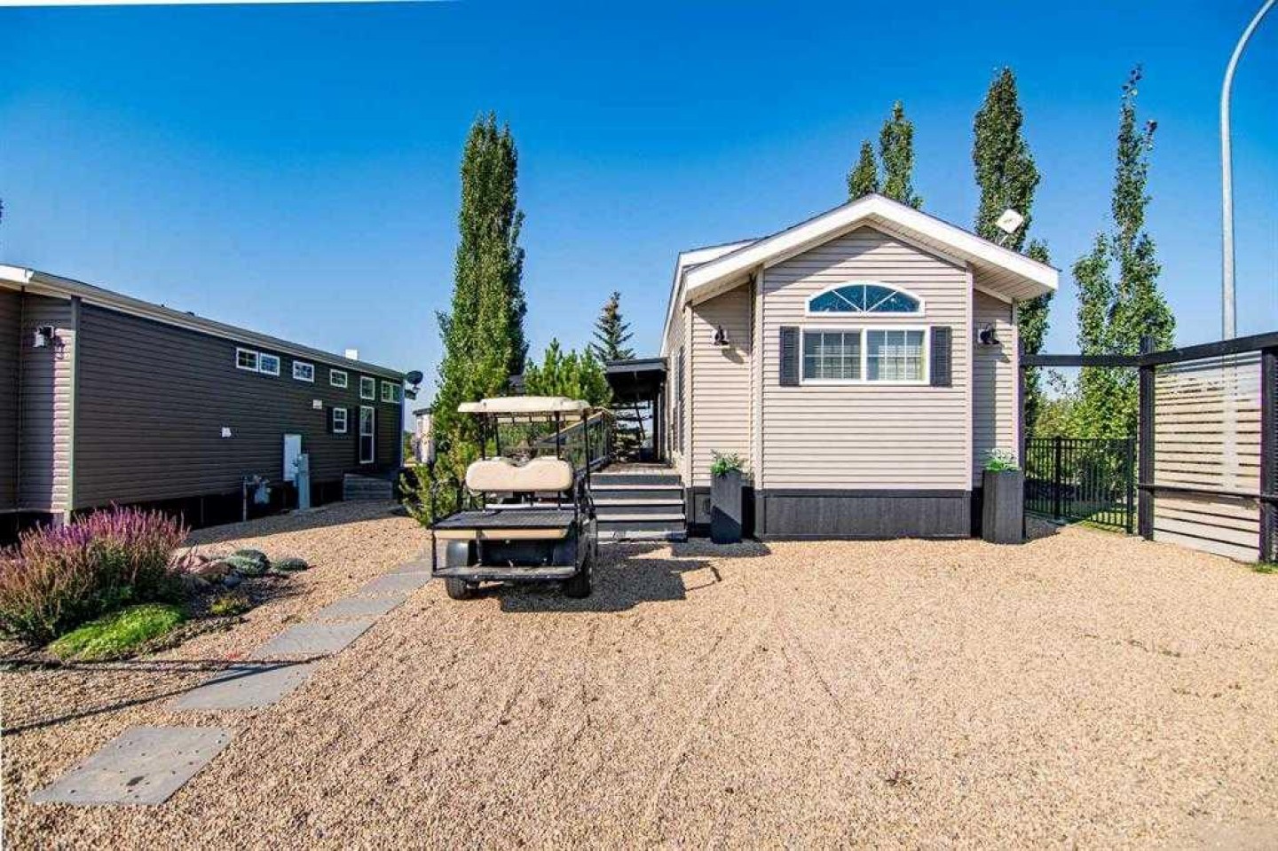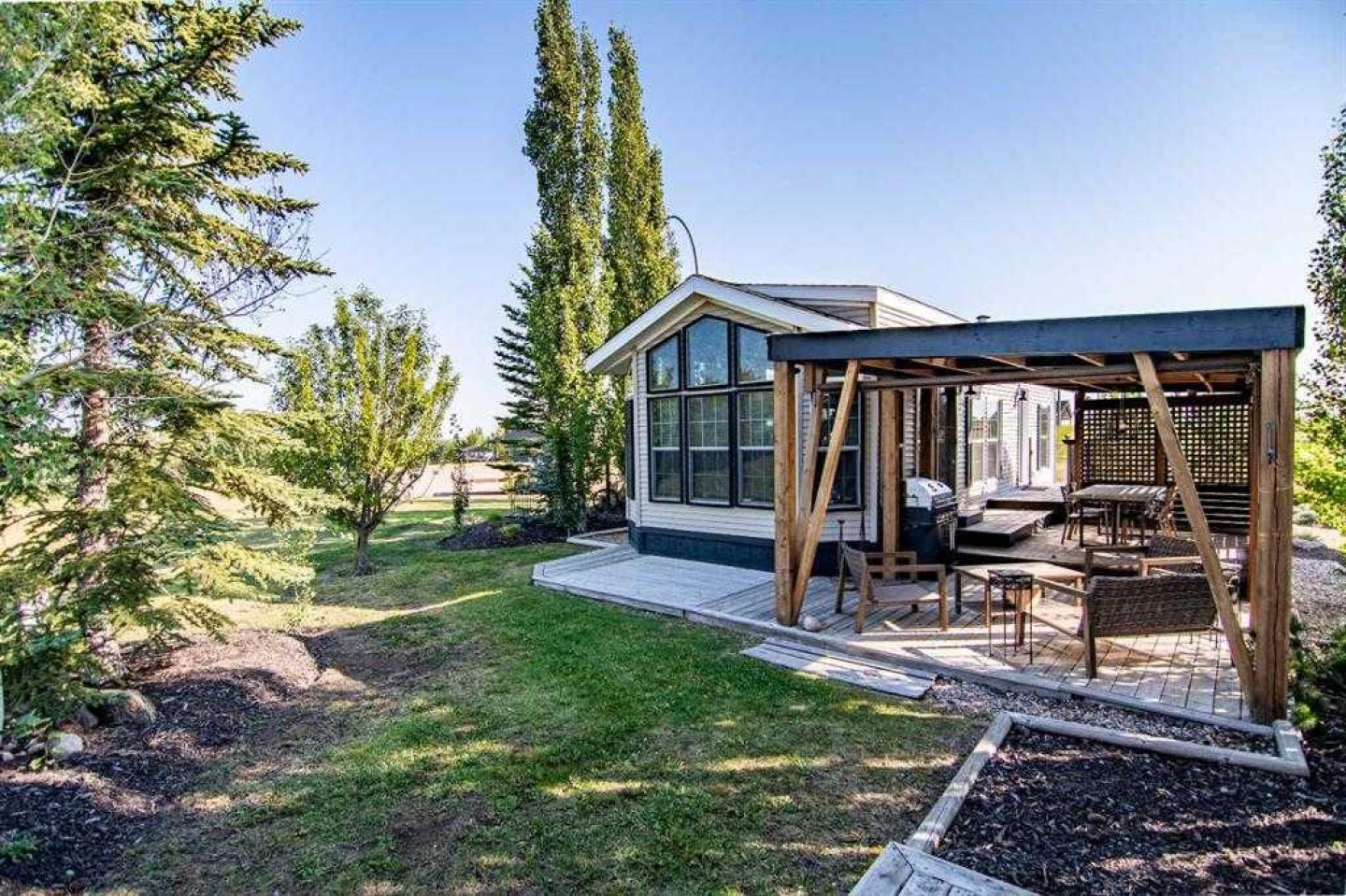 Welcome to the serene beauty of Whispering Pines, where every day feels like a lakeside getaway. Nestled on the shores of picturesque Pine Lake, this exceptional property offers the perfect transition from weekend camping to full-time ( 4 season) lakeside living. Set apart with no neighbors on three sides, this unique lot offers breathtaking panoramic views of the golf course, tranquil pond and sparkling lake just a walk away— an unrivaled retreat of privacy and natural splendor. Step inside the charming park model, where sunlight floods the open-concept interior. The well-appointed front kitchen, cozy dining area and spacious living room create a warm and inviting atmosphere — perfect for everyday living or entertaining. The primary bedroom easily fits a king-size bed. Hosting guests? A pull-out sofa in the living area ensures everyone has space to relax. Double sliding doors lead to a large east-facing deck with a pergola — ideal for morning coffee, evening dinners, or simply soaking in the spectacular views. Equipped with a natural gas furnace, this all-season escape is comfortable year-round. Whether you are seeking solitude, adventure, or a blend of both, Whispering Pines delivers. This community allows short term rentals. As part of a gated, bare land condominium community, residents enjoy access to top-tier amenities including an 18-hole golf course, indoor heated pool, fitness center, clubhouse, restaurant, playground, marina, and sandy beach. From boating and fishing to golfing and swimming, there is something for everyone. Located just 30 minutes from Red Deer, this fully furnished, pet-friendly, turnkey property offers convenience, comfort and community — all in one. Bare land condominium ownership means you own the lot, with low monthly fees covering water, sewer, garbage, lawn maintenance, and clubhouse access. Do not miss your chance to own a piece of paradise at Pine Lake — where lake life meets luxury, and every season brings new memories.