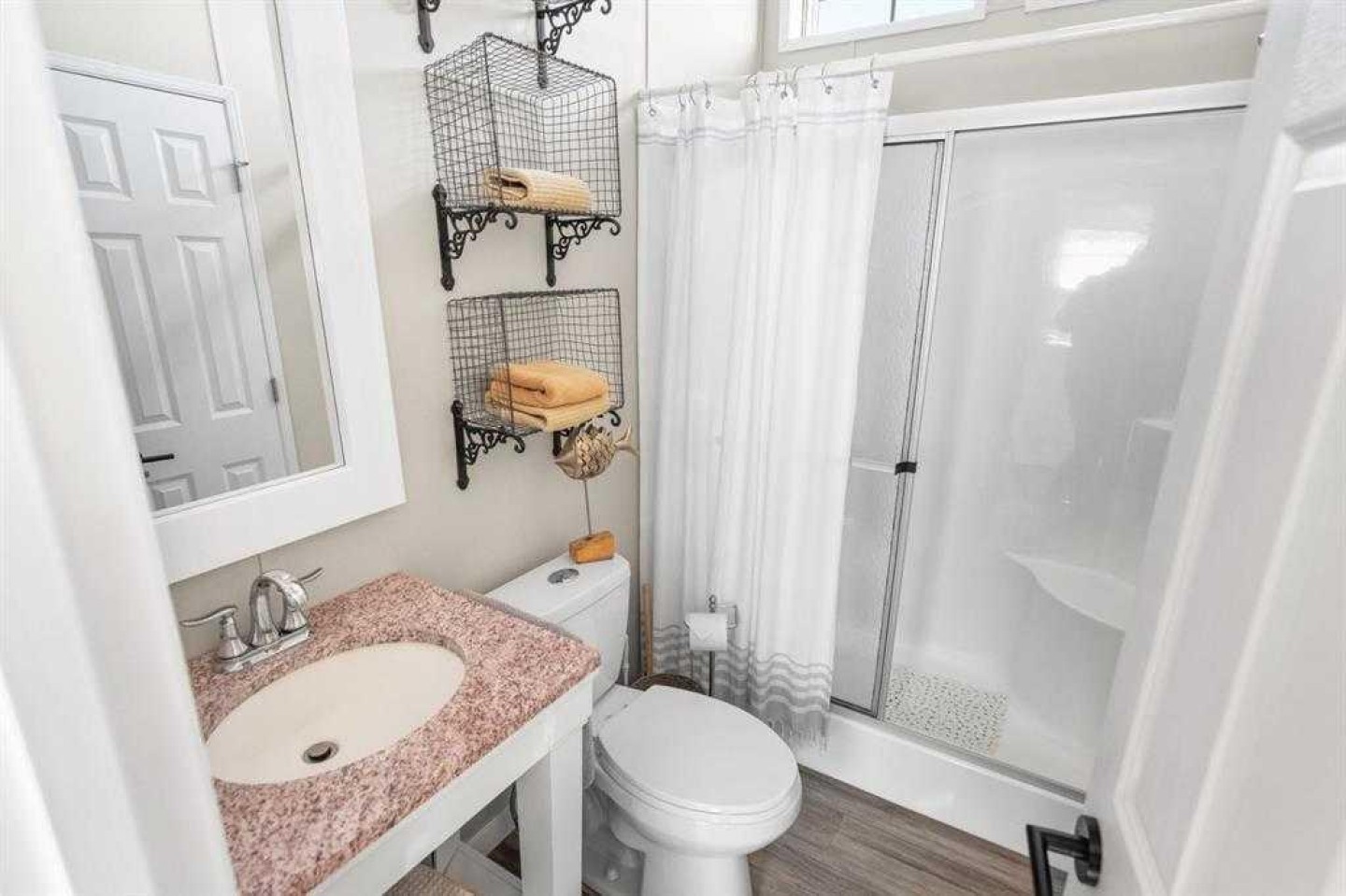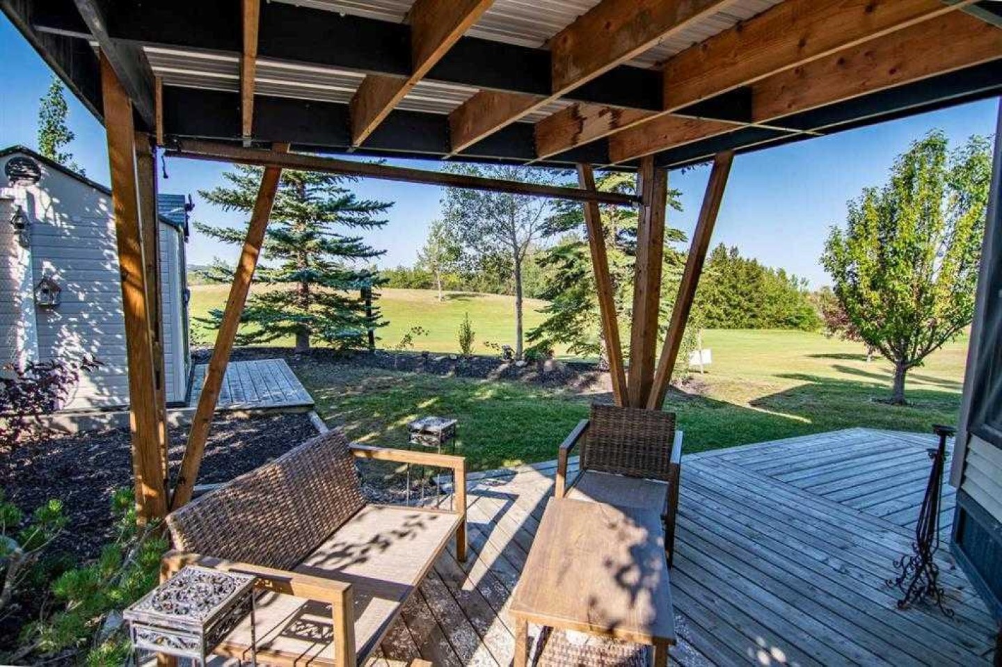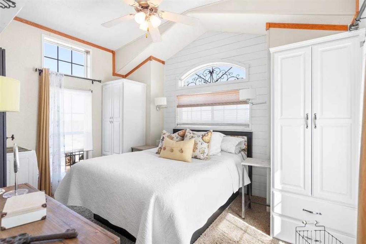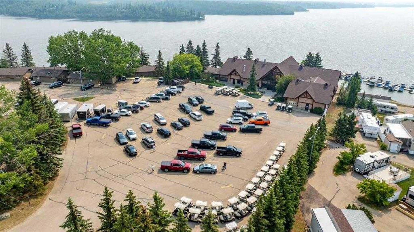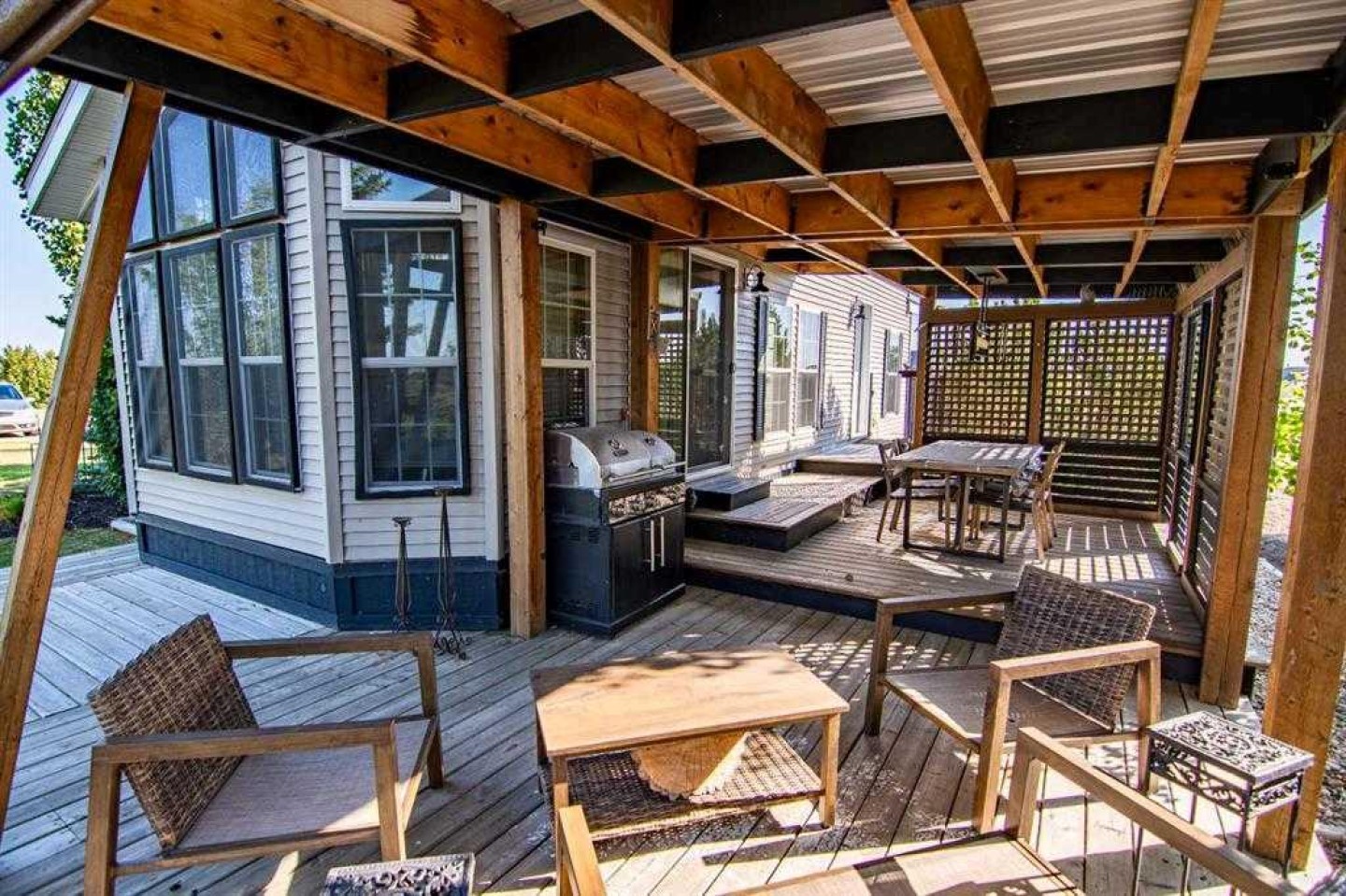 Welcome to the serene beauty of Whispering Pines, where every day feels like a lakeside getaway. Nestled on the shores of picturesque Pine Lake, this exceptional property offers the perfect transition from weekend camping to full-time ( 4 season) lakeside living. Set apart with no neighbors on three sides, this unique lot offers breathtaking panoramic views of the golf course, tranquil pond and sparkling lake just a walk away— an unrivaled retreat of privacy and natural splendor. Step inside the charming park model, where sunlight floods the open-concept interior. The well-appointed front kitchen, cozy dining area and spacious living room create a warm and inviting atmosphere — perfect for everyday living or entertaining. The primary bedroom easily fits a king-size bed. Hosting guests? A pull-out sofa in the living area ensures everyone has space to relax. Double sliding doors lead to a large east-facing deck with a pergola — ideal for morning coffee, evening dinners, or simply soaking in the spectacular views. Equipped with a natural gas furnace, this all-season escape is comfortable year-round. Whether you are seeking solitude, adventure, or a blend of both, Whispering Pines delivers. This community allows short term rentals. As part of a gated, bare land condominium community, residents enjoy access to top-tier amenities including an 18-hole golf course, indoor heated pool, fitness center, clubhouse, restaurant, playground, marina, and sandy beach. From boating and fishing to golfing and swimming, there is something for everyone. Located just 30 minutes from Red Deer, this fully furnished, pet-friendly, turnkey property offers convenience, comfort and community — all in one. Bare land condominium ownership means you own the lot, with low monthly fees covering water, sewer, garbage, lawn maintenance, and clubhouse access. Do not miss your chance to own a piece of paradise at Pine Lake — where lake life meets luxury, and every season brings new memories.