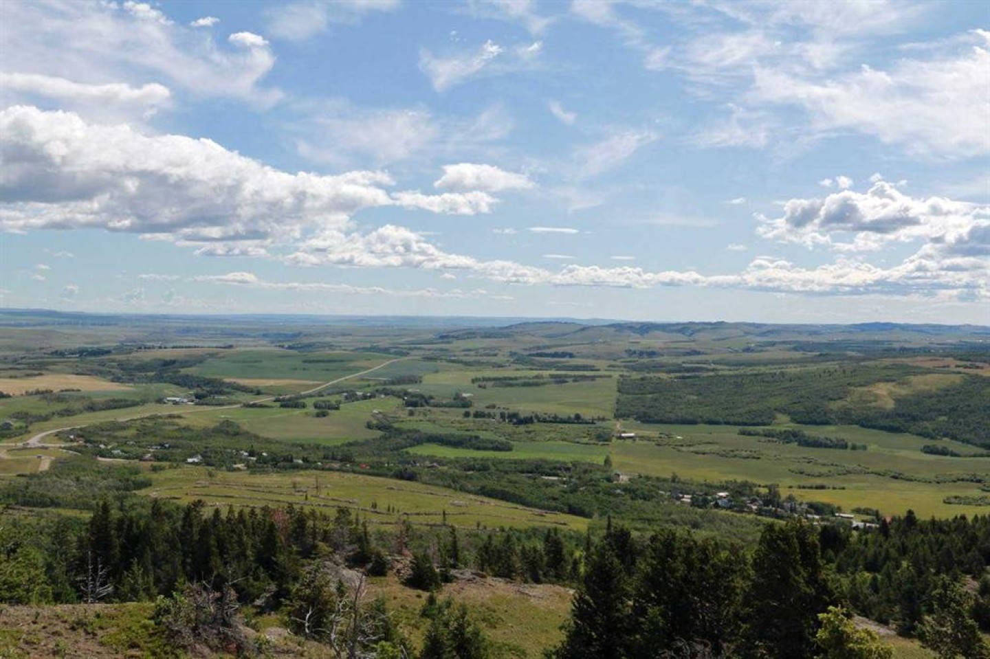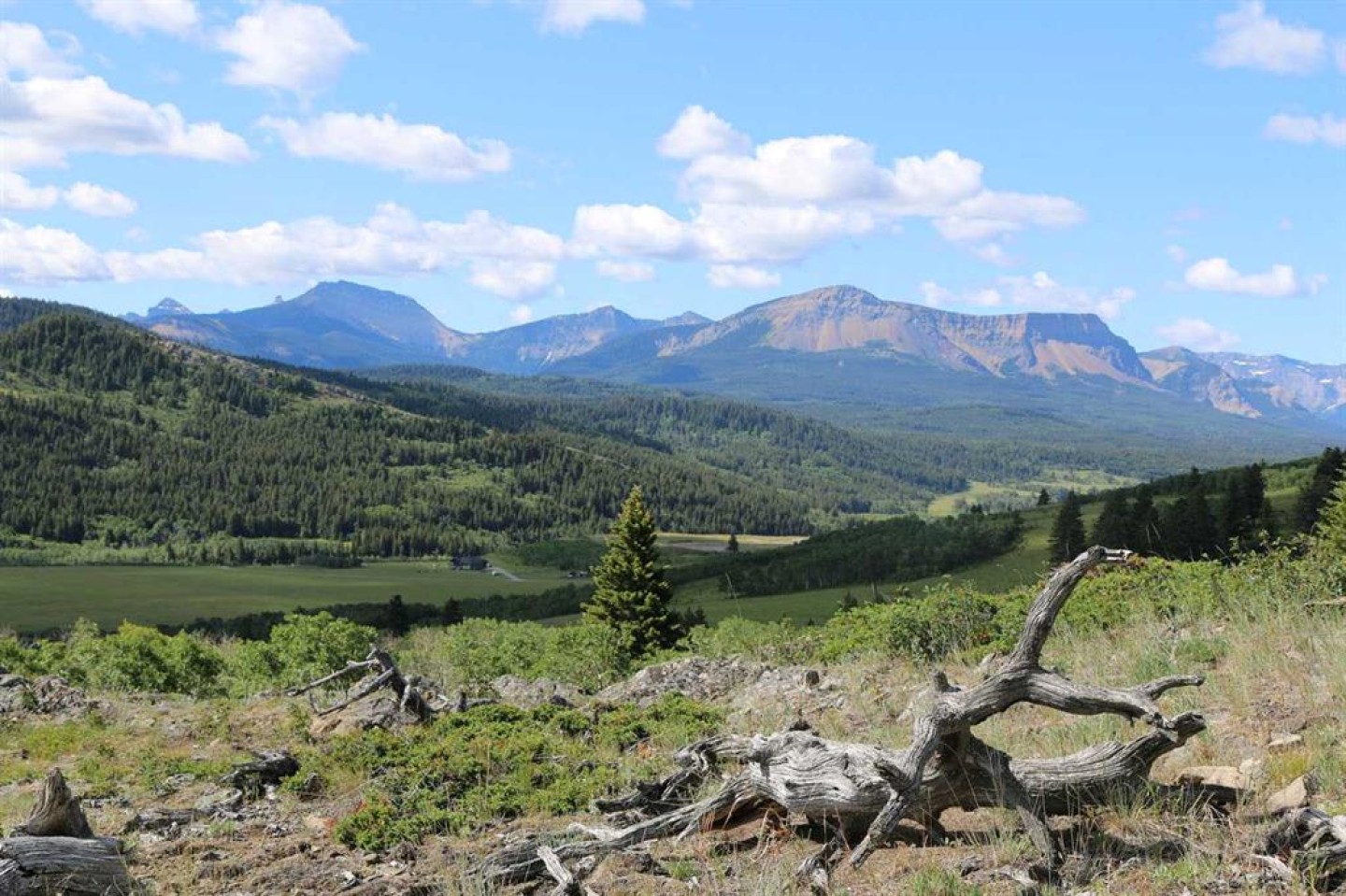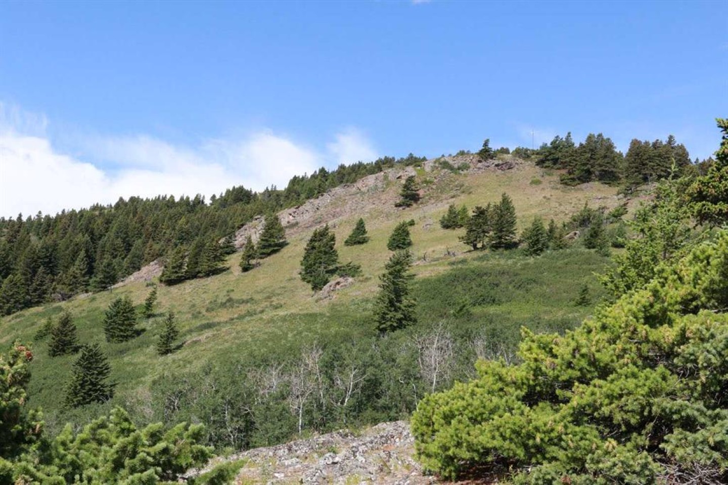 A quarter section of land set in the foothills near Pincher Creek, featuring a mix of open grassland, pockets of trees, rock outcrops, and natural springs. The property includes alpine-style meadows suitable for grazing, with mountain ranges to the south and west providing shelter and a scenic backdrop. The varied terrain supports livestock use and offers excellent wildlife habitat, making it well suited for agricultural operations with added recreational value.