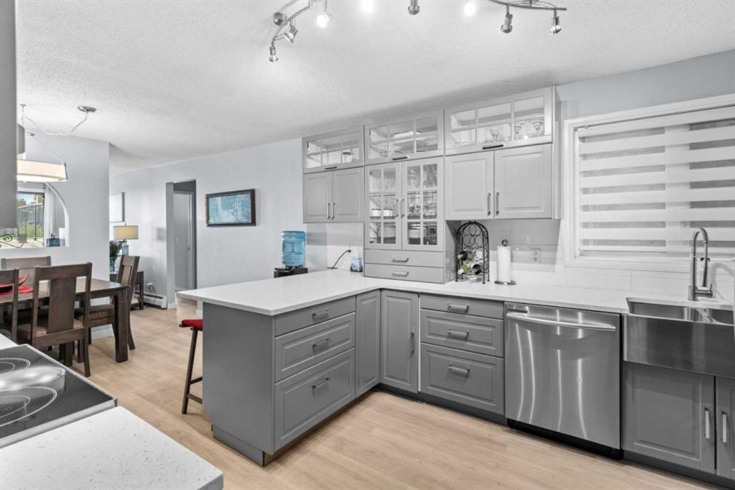 Located in the sought-after community of Crescent Heights, this spacious 2-bedroom, 2-bathroom unit offers over 1,200 sq ft of living space and includes two underground parking stalls. The property has been extensively renovated from top to bottom, featuring new light fixtures and vinyl plank flooring throughout. Both generously sized bedrooms can accommodate king-size beds and additional furniture, with the primary bedroom offering a large closet and a 3-piece en-suite. The second bathroom is spa-inspired and fully upgraded. The laundry room provides ample storage space and is conveniently located behind the modern kitchen. The kitchen is equipped with quartz countertops, stainless steel appliances, raised and slow-close cabinets, an upgraded eating bar, and neutral finishes. Large windows bring in abundant natural light, complementing the open floor plan that includes a spacious dining area and living room. The south-facing patio is exceptionally large and offers impressive views of downtown. Situated near amenities, public transit, and downtown access.