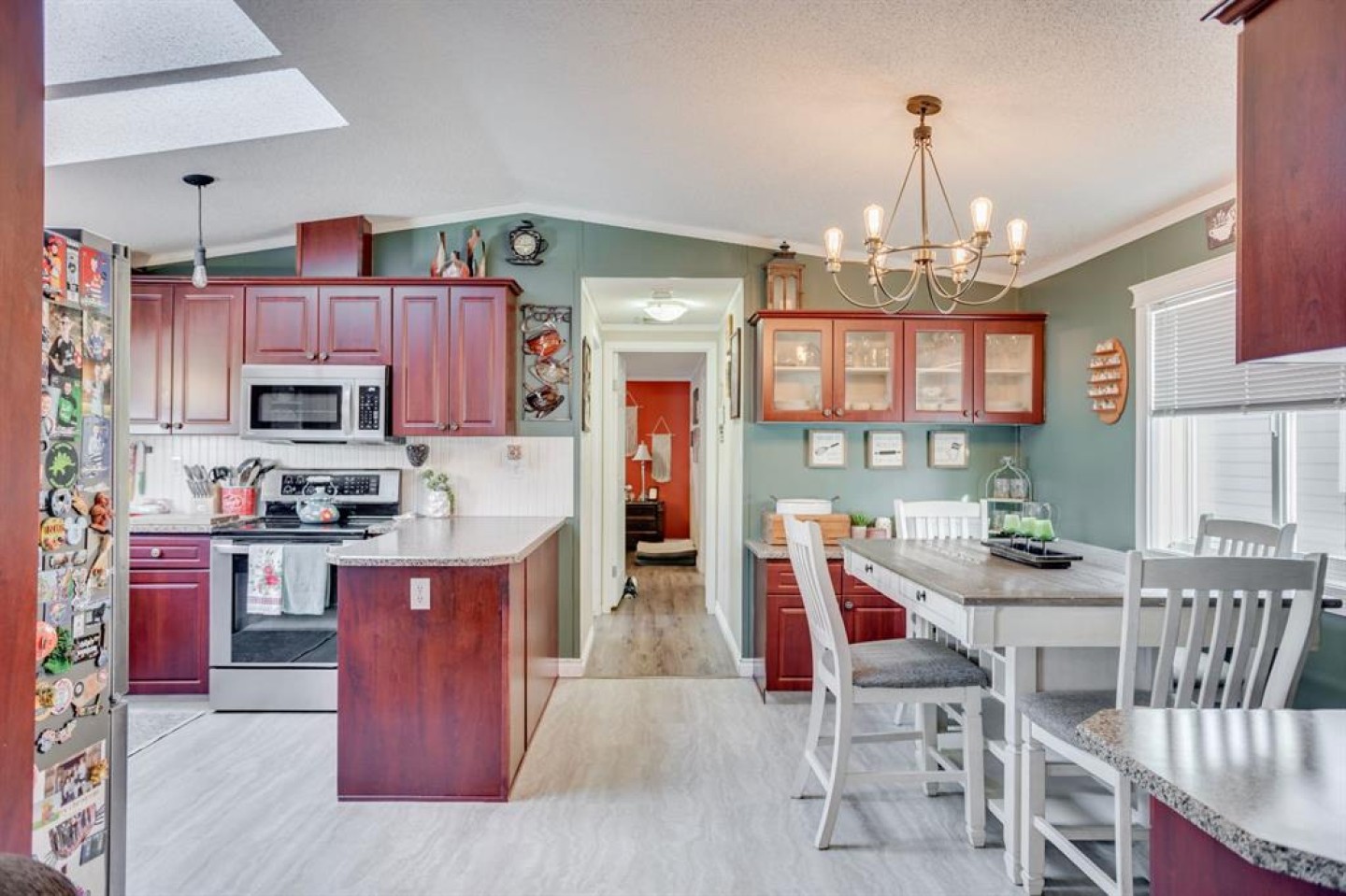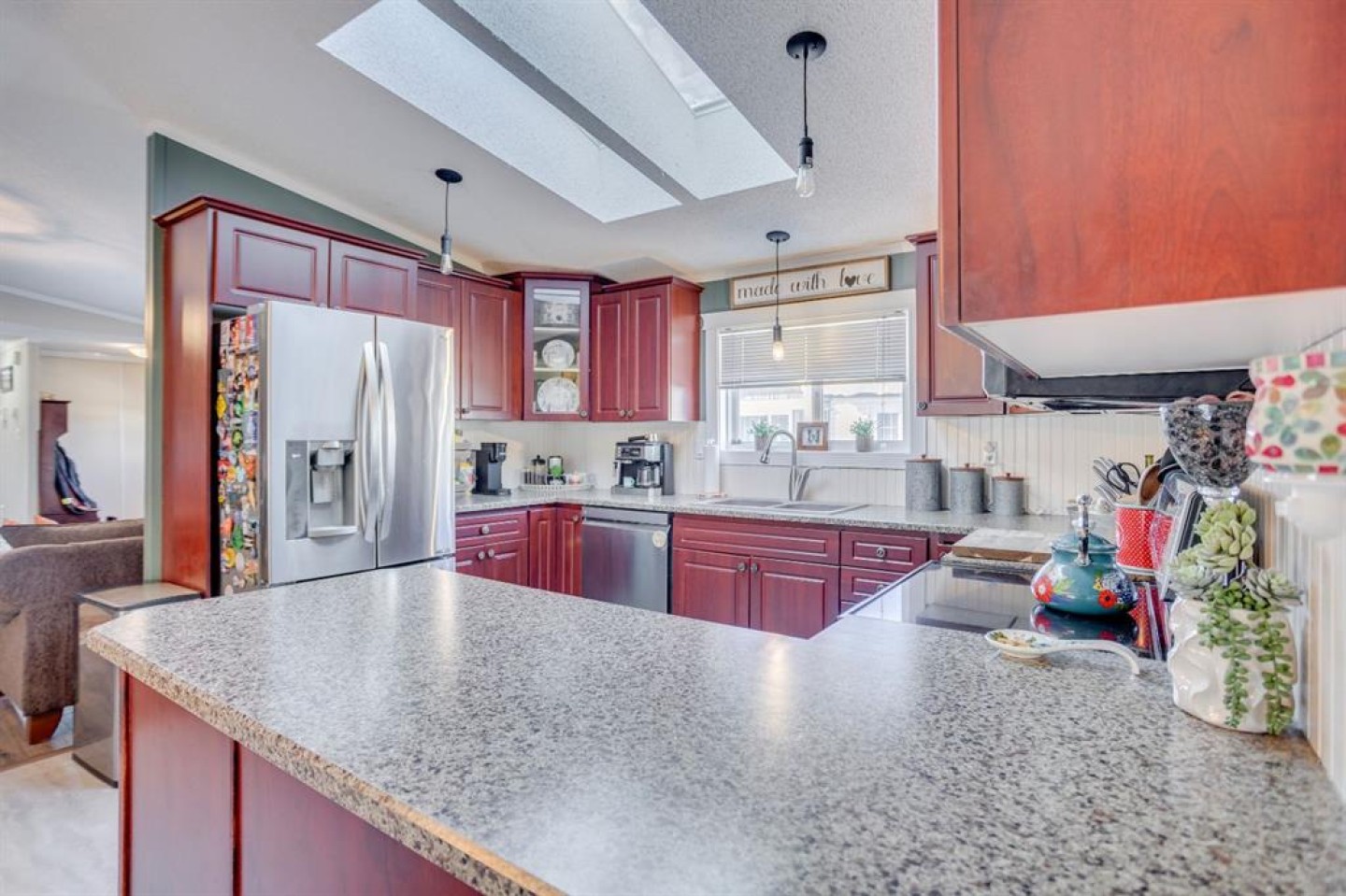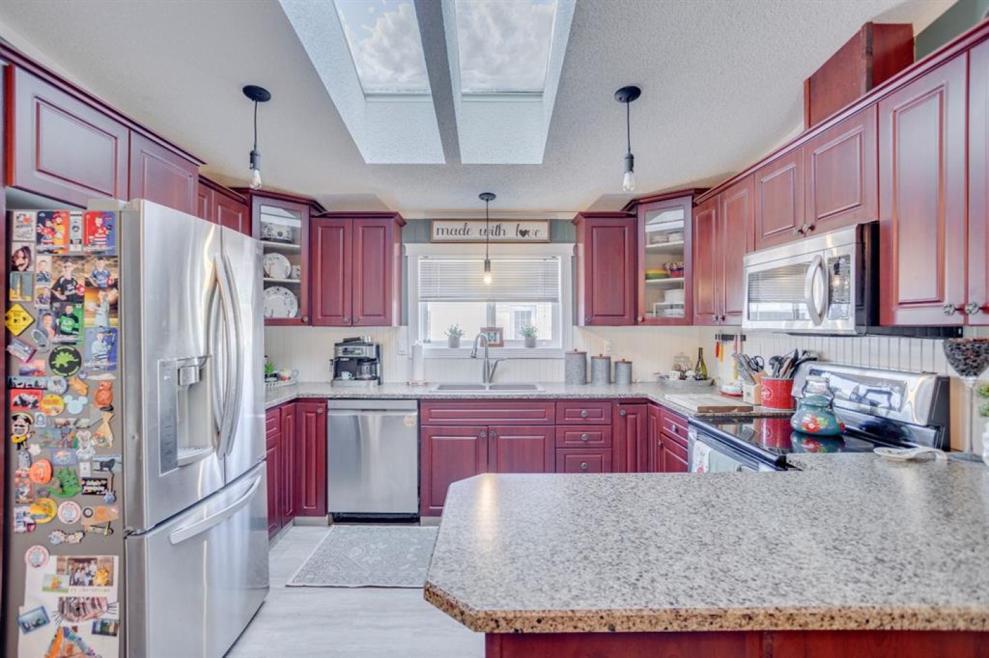 The spacious kitchen is filled with natural light from an overhead skylight with heat trace and offers new laminate countertops, stainless steel appliances (replaced in 2017), linoleum flooring, and ample cabinet and counter space.