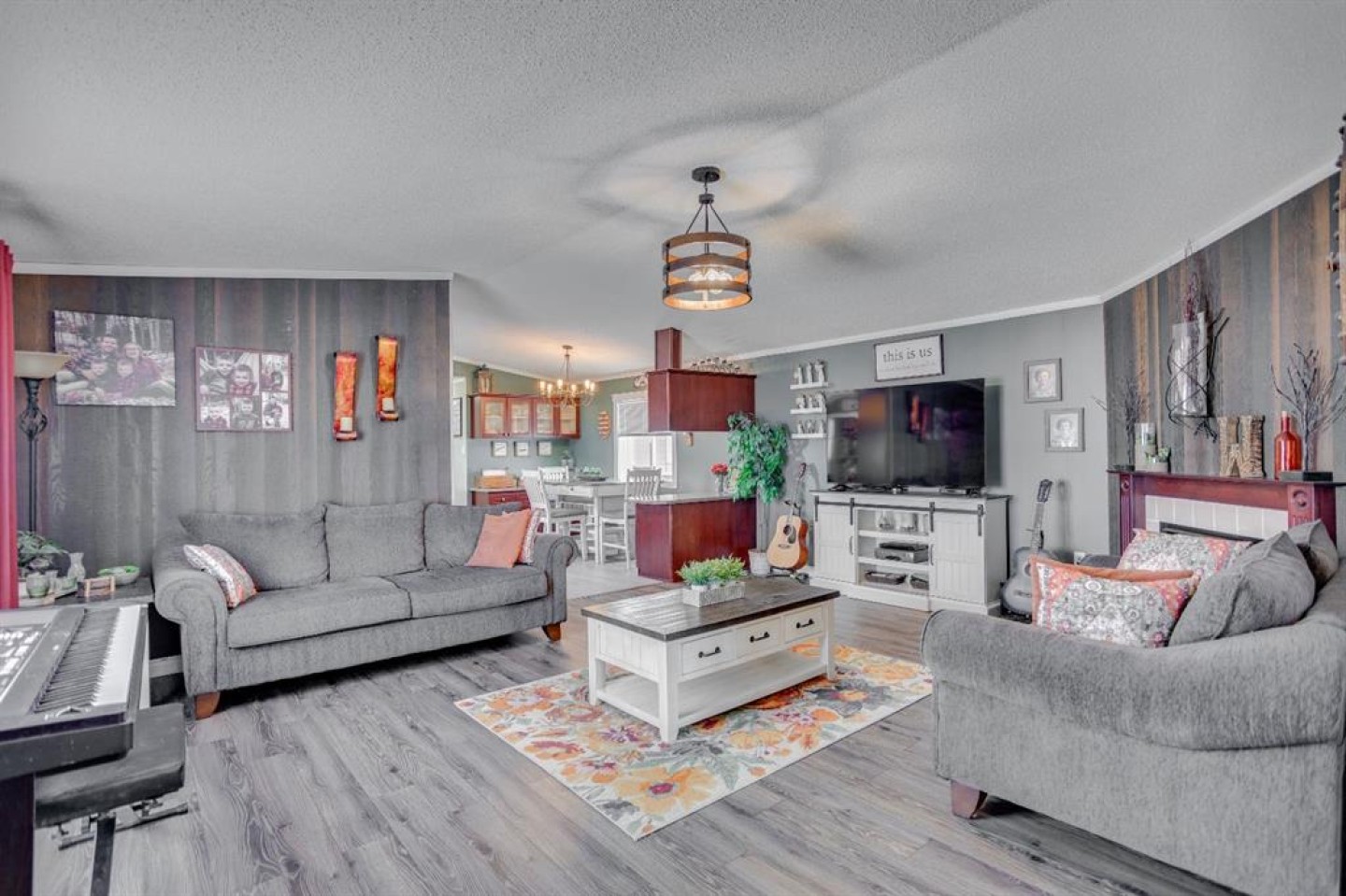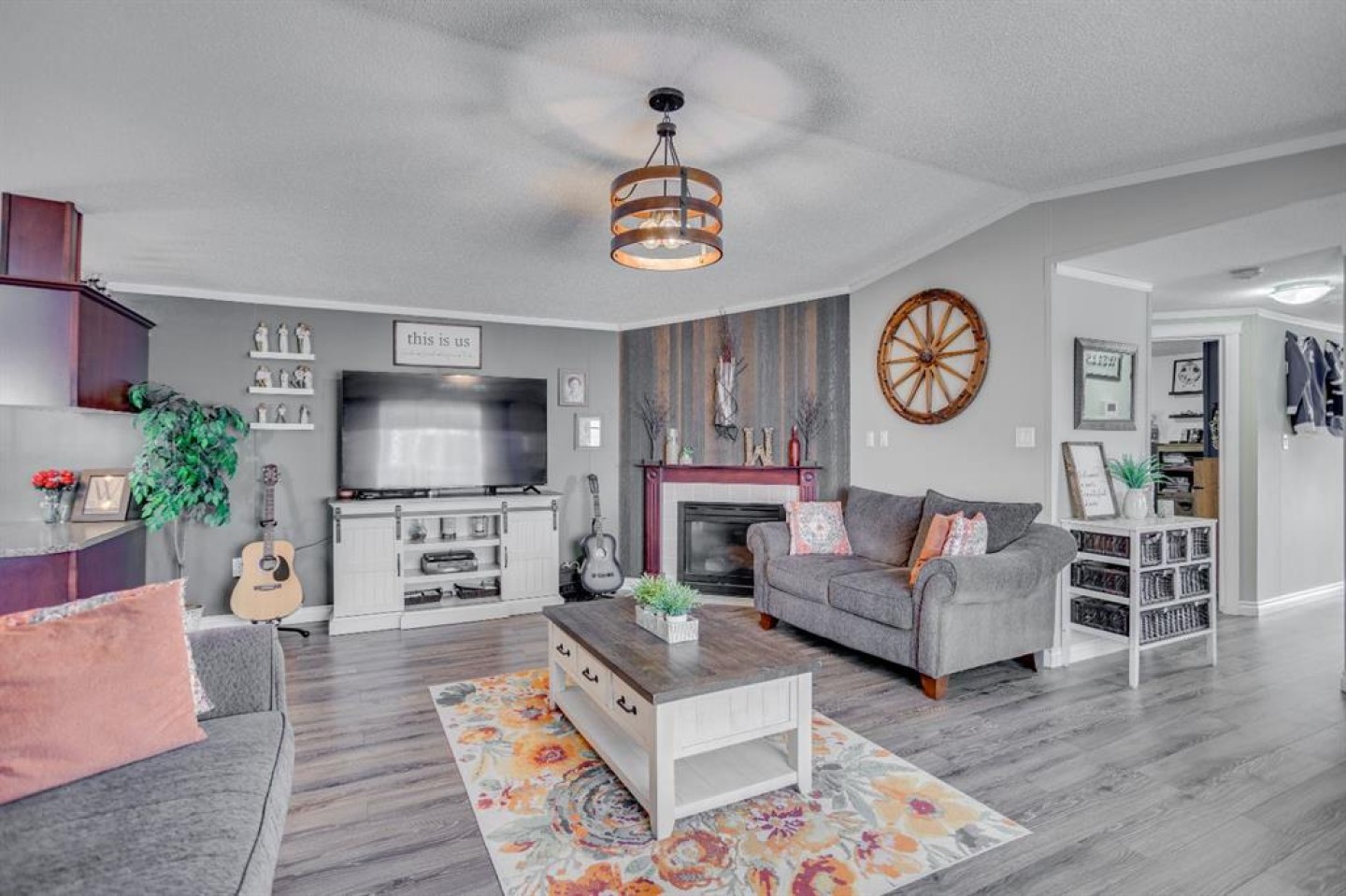 The bright, open-concept living room features vaulted ceilings, a stylish feature wall, new laminate flooring, and a cozy corner gas fireplace—perfect for relaxing on cold winter evenings.