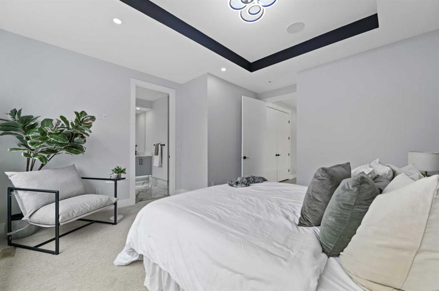 The upper level showcases a gorgeous primary retreat with a sun-tunnel-lit walk-in closet, spa-inspired ensuite with freestanding tub, floating double vanity, and custom tiled shower. Two additional bedrooms each come with their own walk-in closets, along with a 3-piece bathroom and a full laundry room with sink. Downstairs, the fully developed basement features 9’ ceilings, large windows, a spacious recreation area, wet bar, a fourth bedroom with walk-in closet, and a 4-piece bathroom—perfect for guests or multi-generational living.