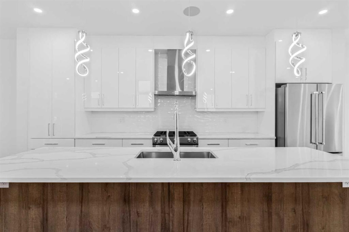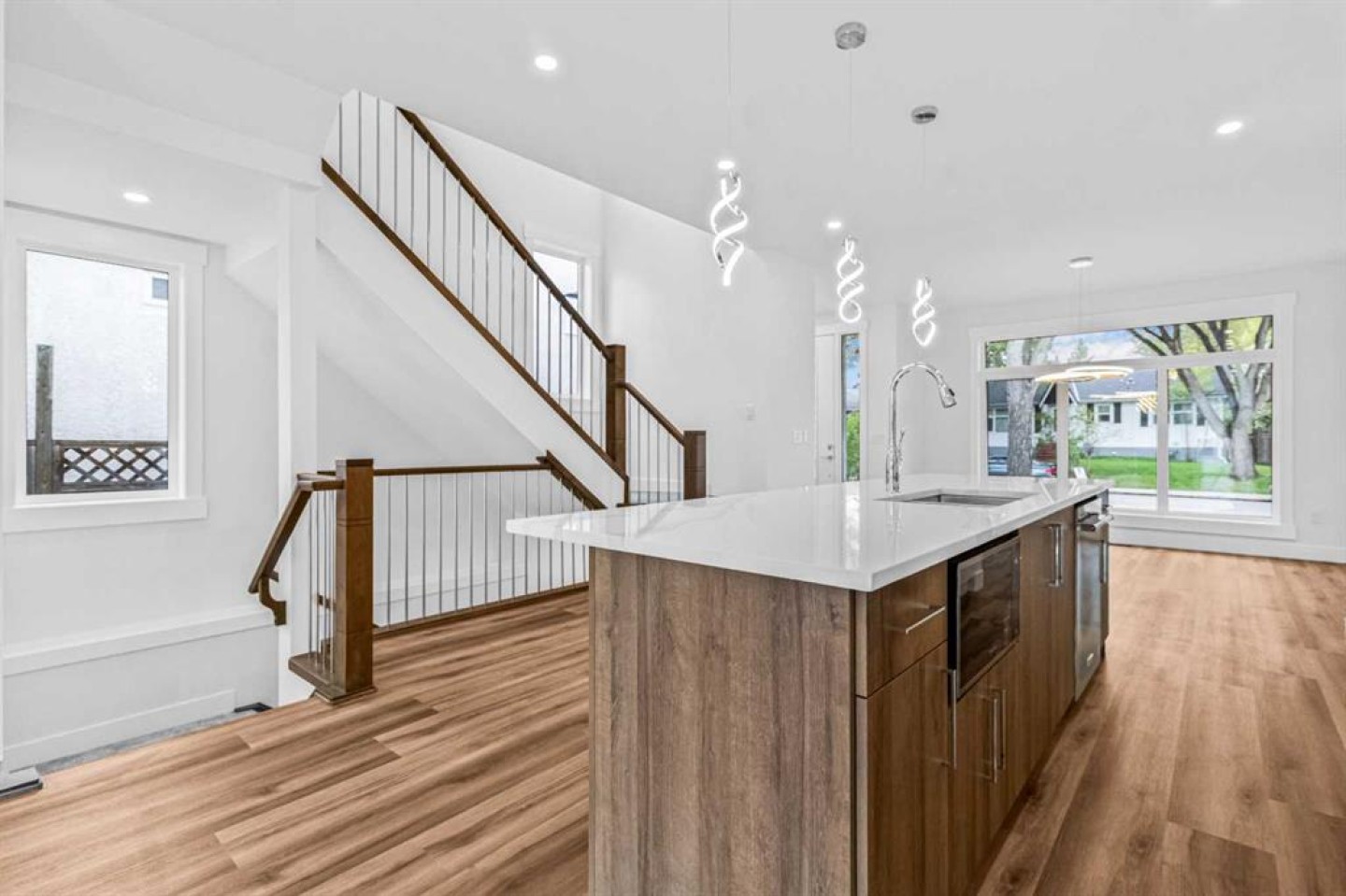 Discover this stunning brand-new semi-detached infill, perfectly blending modern style with classic finishes on a quiet, tree-lined street. With over 2,900 sq ft of living space, this home offers more room than the average semi-detached, making it ideal for a growing family—plus it’s close to top-rated schools & parks. The main floor is flooded with natural light from oversized South facing windows and features an open layout perfect for entertaining. Enjoy the spacious front dining room, a large central kitchen island, and sliding patio doors that connect the rear living room to the backyard. Upstairs, the luxurious primary suite offers vaulted ceilings, beautiful windows, a nearly 100 sq ft walk-in closet, and a spa-like ensuite. Two additional bedrooms, a stylish 4-piece bath, and a convenient laundry room complete the upper level. The finished basement includes a large rec room and a fourth bedroom—ideal as a guest suite, office, or gym. Outside, enjoy a private backyard and double detached garage, all just steps from 4th Street amenities, several parks, schools, and also downtown. Amazing value and quality build!