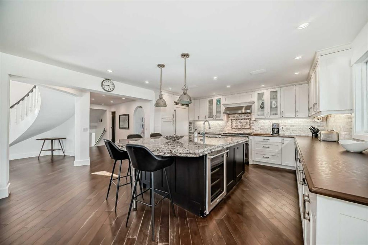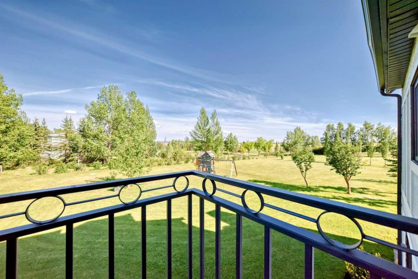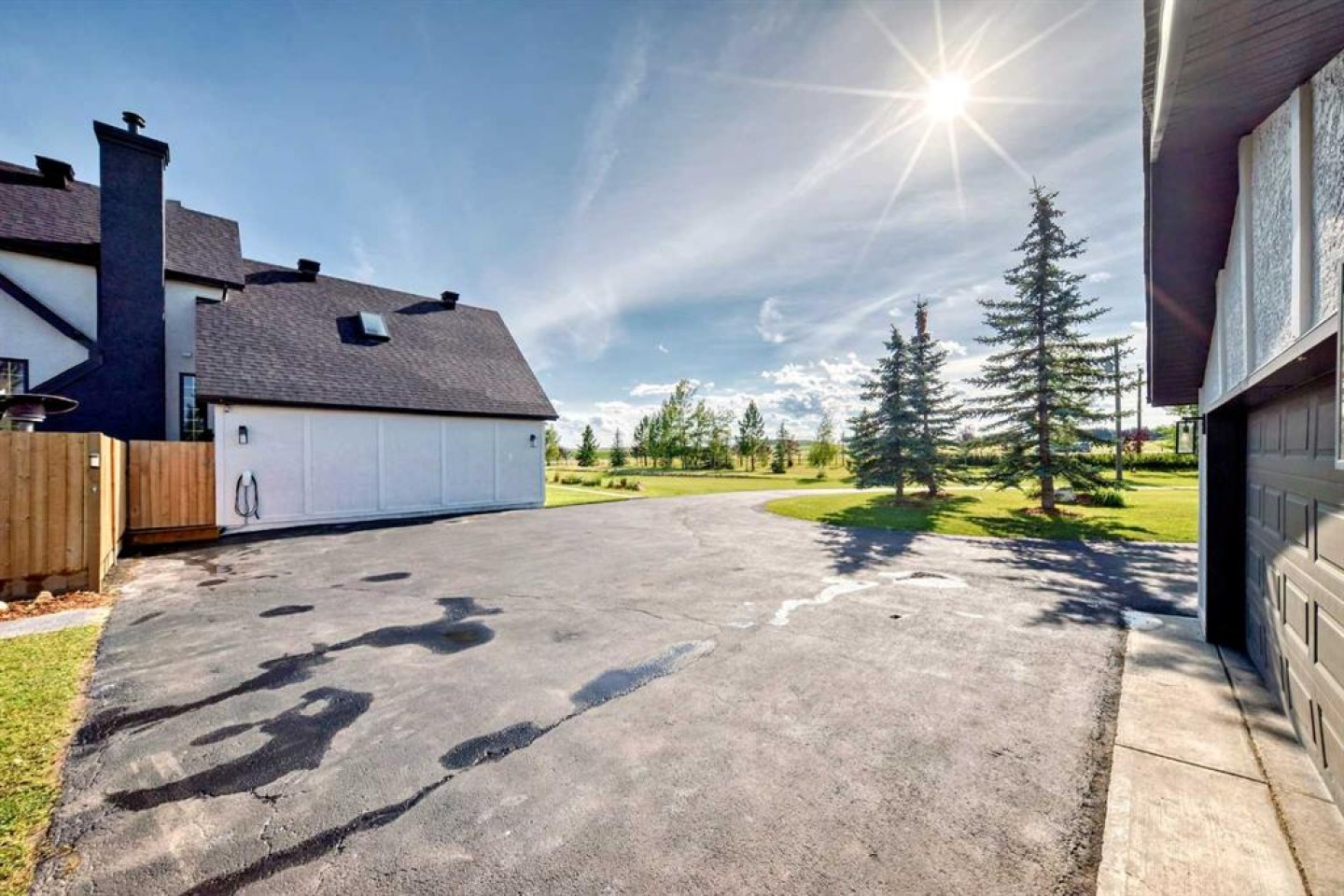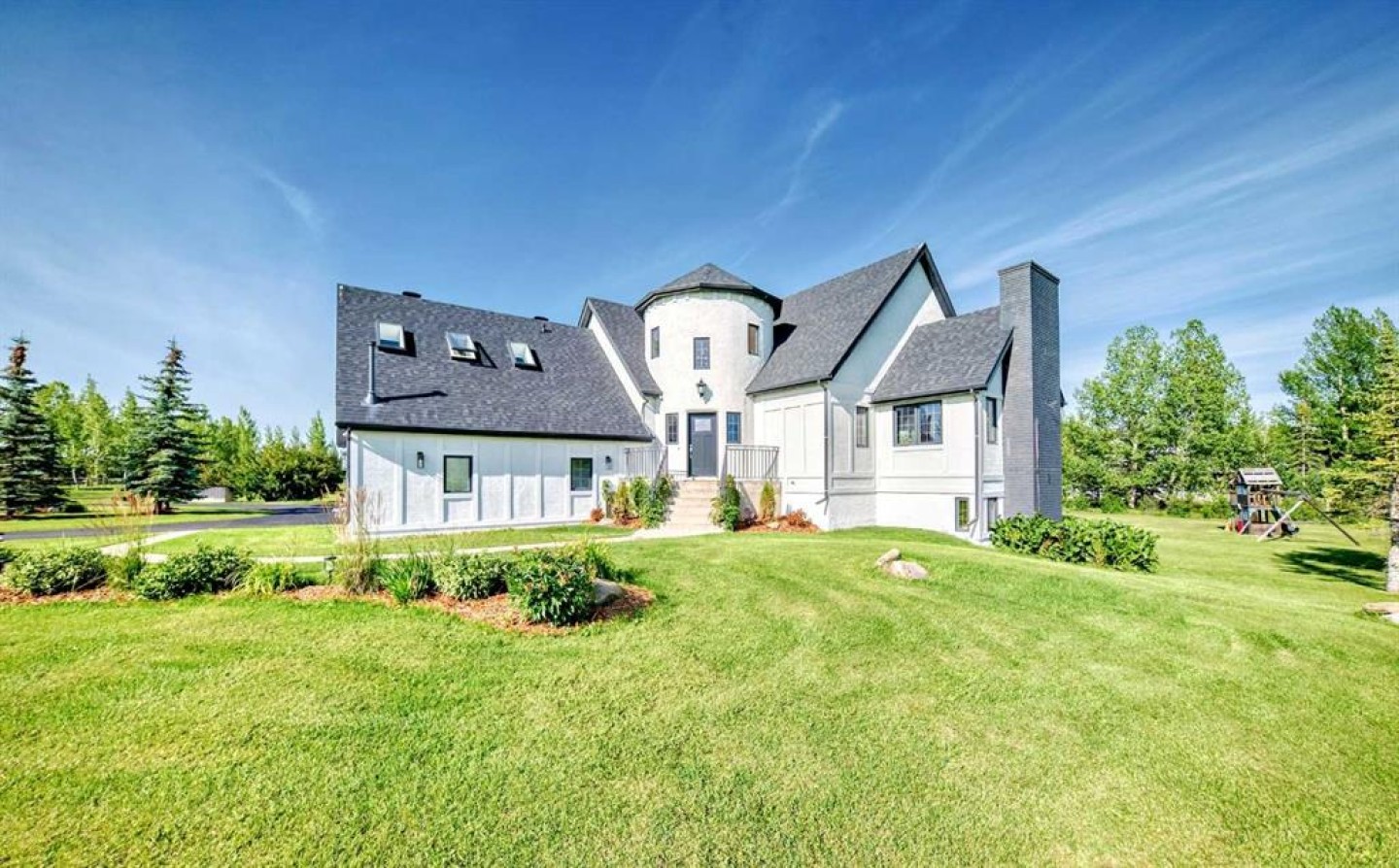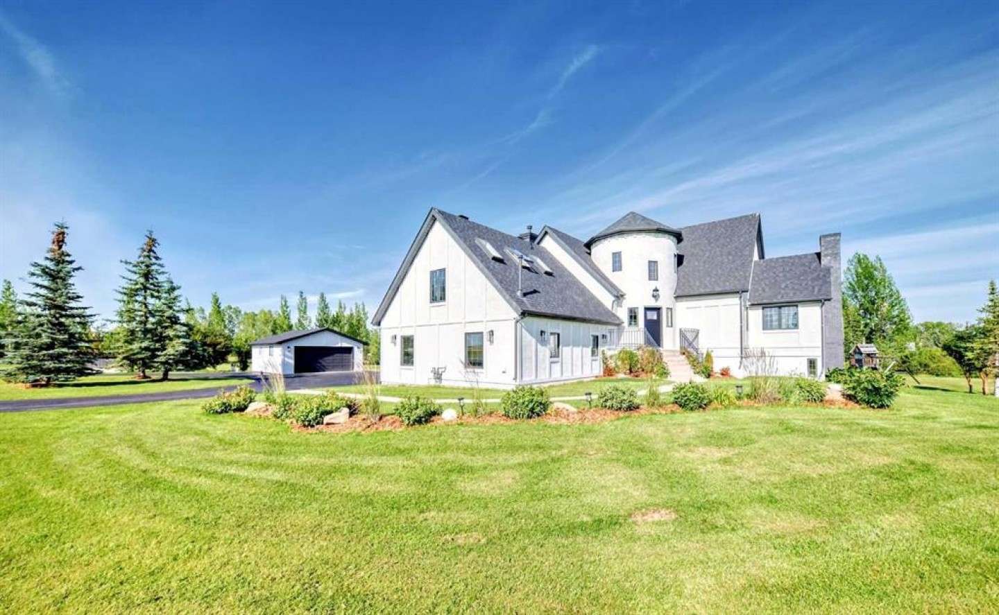Experience the best of both worlds with this breathtaking 4-acre estate, where idyllic country living meets exceptional comfort and style. This impeccably maintained 2-storey walkout residence with 4782 sq ft of total living space blends timeless European charm with luxurious finishes, featuring rich oil-stained hardwood, elegant brick wood-burning fireplaces, and a grand tower foyer with a curved staircase. The main level offers a spacious living room, formal dining area, and an open gourmet kitchen with modern shaker cabinetry, granite countertops, and an eating bar—ideal for entertaining. A large family room gives you tons of extra space for the family. Upstairs, you’ll find three generous bedrooms, including a stunning primary suite with a spa-like ensuite. The fully developed walkout level—currently set up as a full illegal in law suite—includes an additional bedroom, den, large family room, kitchen, and separate access. The home showcases tile, hardwood, and carpet flooring, and is complemented by a detached 2-car garage, paved circular driveway with RV parking potential, expansive fenced garden, firepit, storage area with a unique wood-burning sauna and games room, plus a garden shed, mature trees, and landscaped grounds. Zoned for horses and close to both private and public schools. This property offers the tranquil living just minutes from Calgary and located close to the future Bingham crossing shopping centre featuring Costco! You will love the quick access to Highway 1 for heading out of town and other destinations. It will be a pleasure to move when this is your destination!