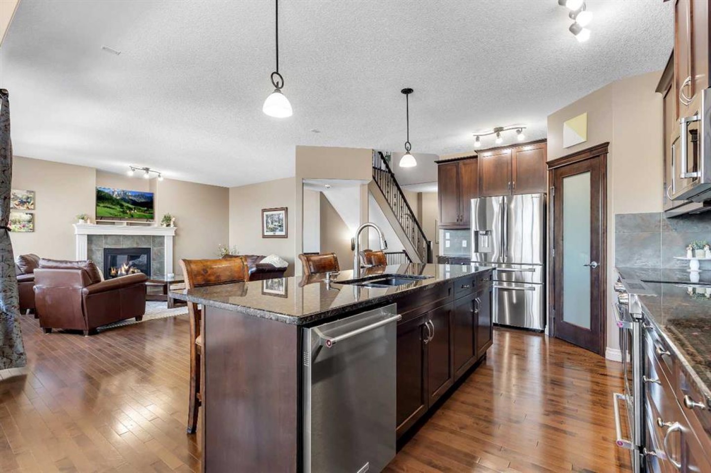 Location, Location, backing into the Canal & pathway. This original owner home offers numerous upgrades & features which include: 9' ceilings, over 3600 sq ft of developed living space, total of 5 bedrooms & 3.5 bathrooms, walkout lower level, upgraded stainless steel appliances, newer composite deck, hardwood, granite in kitchen, wrought iron railings, 2 furnaces, upper furnace has air conditioning, R.I .for speakers on main & upper ensuite,, also 2 speakers on deck, all upper bedrooms have walk in closets, gas line on deck, lower patio area from walkout, hot water tap outside, manual underground sprinklers in front yard & so much more. The main floor features a 2pc bath, den, laundry area with sink, spacious great room with gas fireplace & a large kitchen that offers a pantry, island with eating bar & a nook that has access to the over sized deck that over looks the canal. The upper floor features a 4pc bath, bonus room & 3 good size bedrooms. The primary bedroom offers a walk in closet & full ensuite. The lower walk out features 2 bedrooms, 3pc bath & a family room that has access to the patio/yard. This home shows pride of ownership & is located on a quiet street close to schools, shopping, green spaces & all other amenities. Click on link to view 3D walk through.