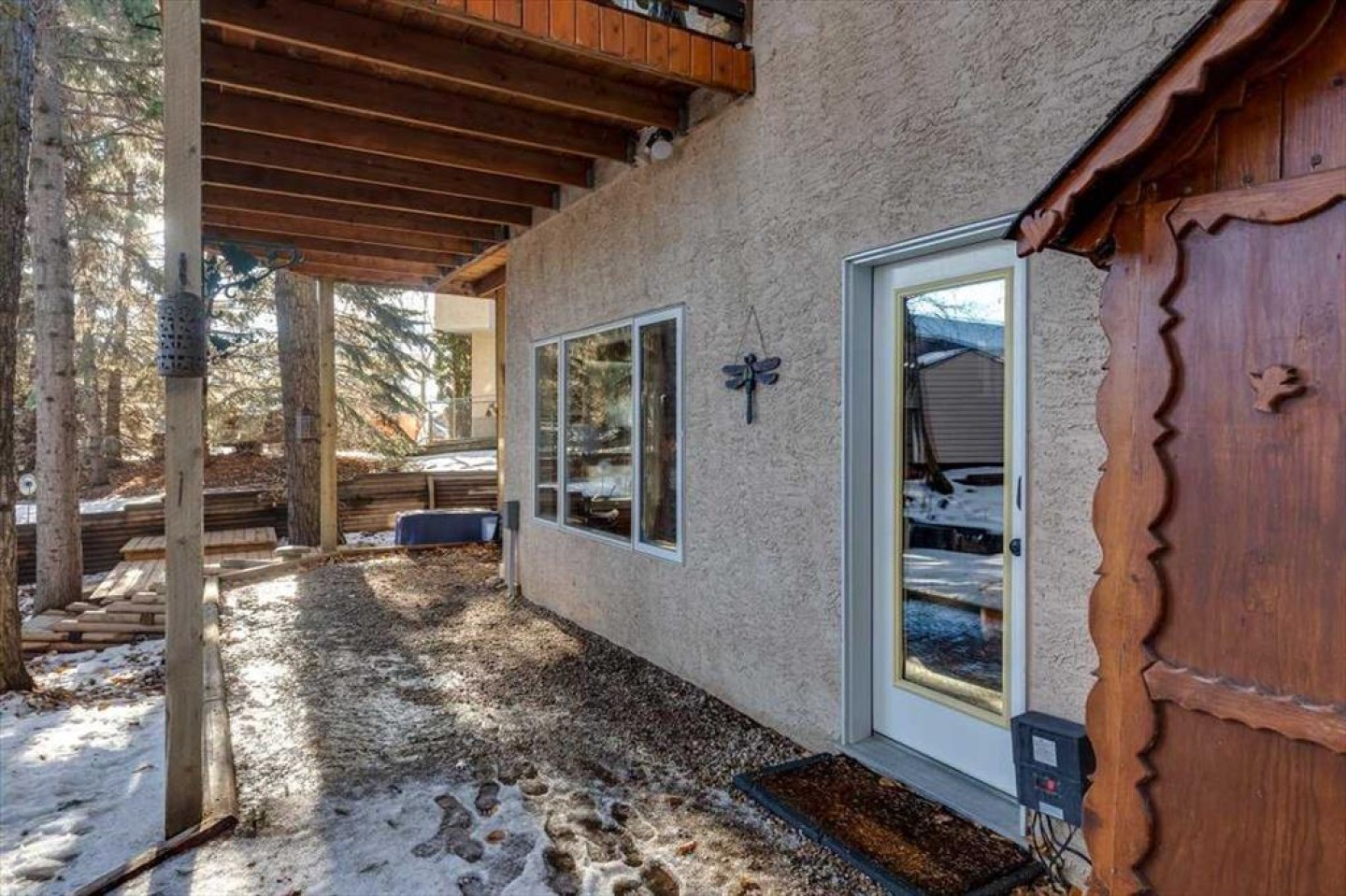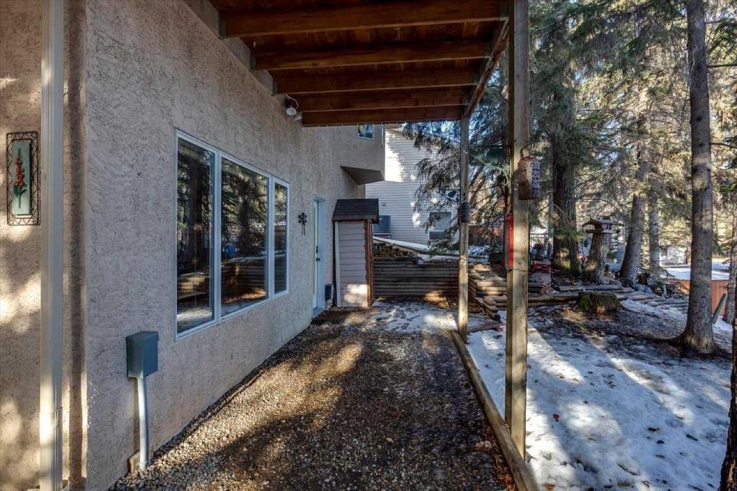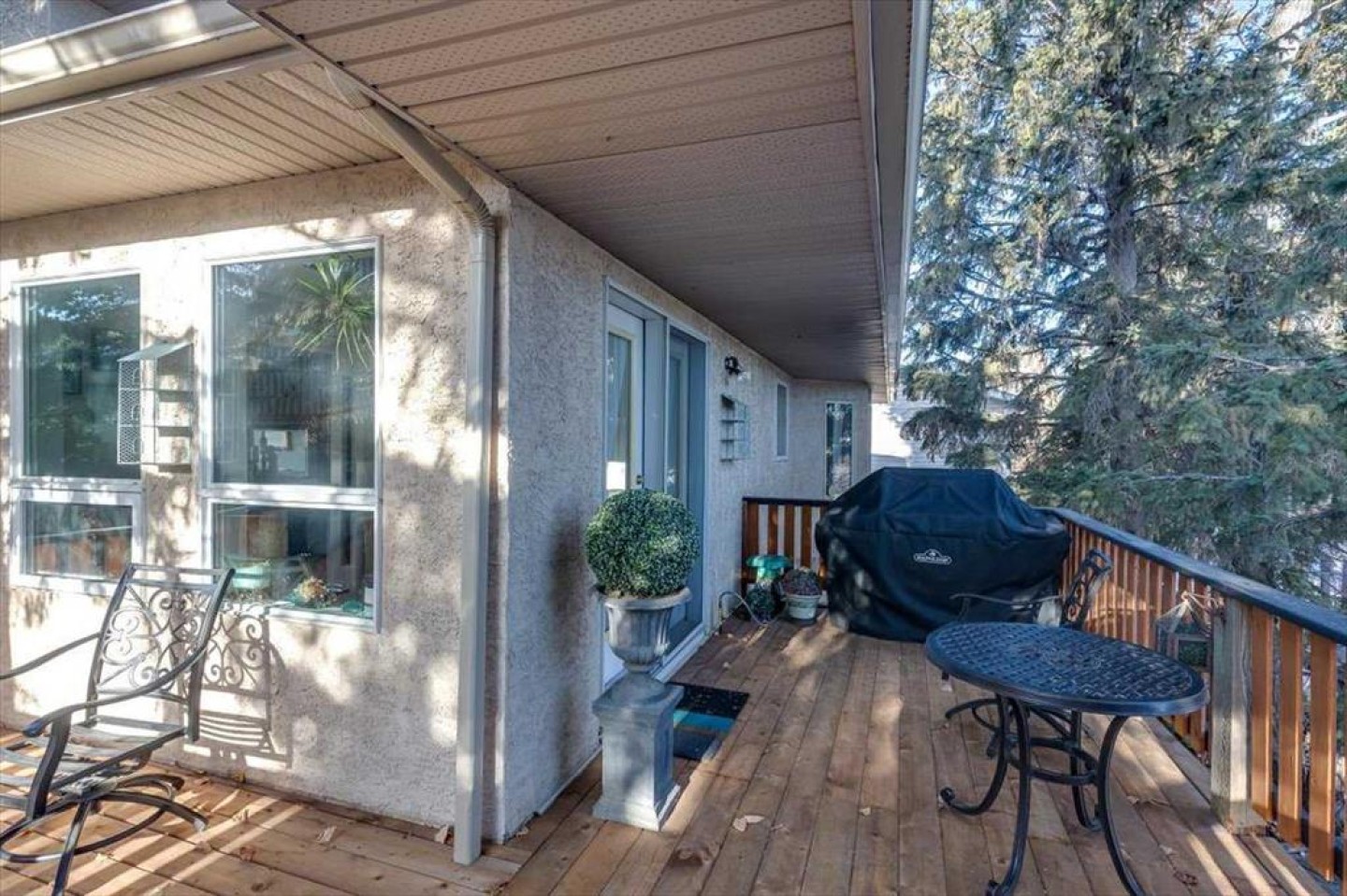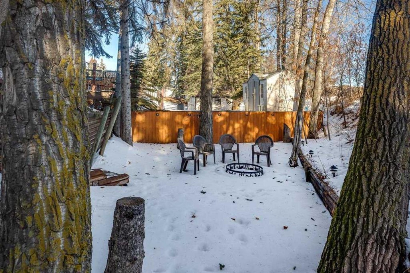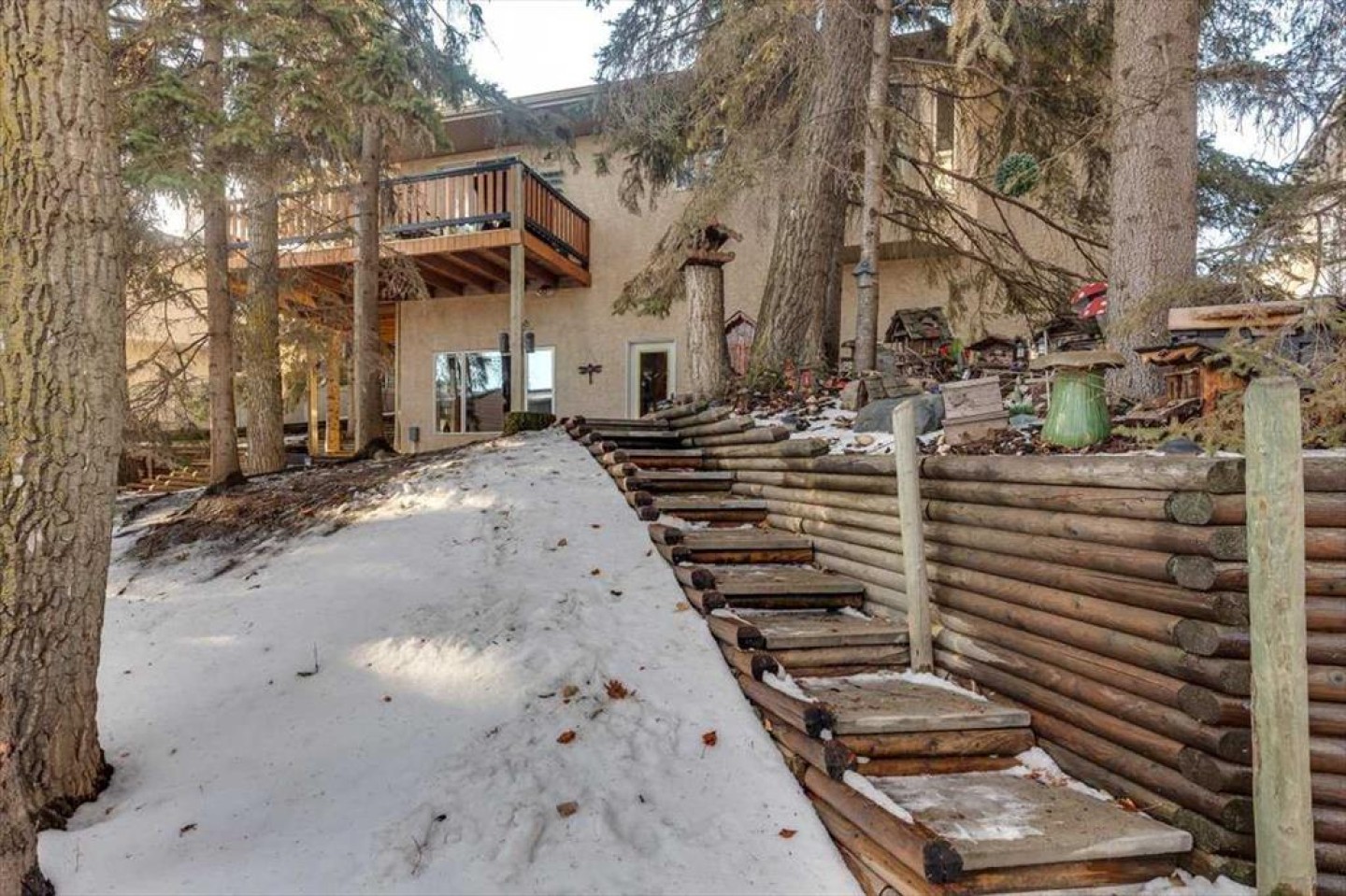 There is truly nothing else like this home on the market in Innisfail. Nestled in a private, forest-like setting right in town, this architectural masterpiece blends timeless elegance with natural serenity. From the moment you arrive, the extra-large front parking pad, accommodating three or more vehicles alongside the heated double garage, sets the tone for a property that balances luxury and practicality. Inside, the main level impresses with a cathedral ceiling foyer, chandelier, and refined details throughout. Ceiling medallions, crown mouldings, ledge lighting, and mosaic tile accents add sophistication, while hardwood flooring, custom wool carpeting, and Hunter Douglas window treatments elevate every room. The sunken living room exudes warmth, while the formal dining room glows with Murray Feiss lighting. The gourmet kitchen features abundant solid oak cabinetry, a gas stove, a Jenn-Air microwave/oven combo (gas hookup available/present), and a bay-window breakfast nook overlooking the treed backyard. Adjacent, the family room features a gas fireplace and a picturesque sitting area, creating an intimate gathering space. A captivating feature is the year-round sunroom, accessed through French doors, where walls of windows flood the space with natural light and frame uninterrupted views of the backyard oasis. A main-floor office or bedroom with custom-built-ins, a powder room, and a spacious laundry with sink and garage access complete this level. The primary suite occupies the upper floor, offering a private retreat at the top of its own grand staircase. A sitting area leads into the expansive bedroom with a walk-in closet, a hidden ironing board, a laundry chute, and a spa-inspired ensuite with a jetted soaker tub, Roman taps, and a shower. The walkout lower level evokes the feel of a luxury mountain retreat with beadboard, wainscoting, and cabin-like textures. The rec room, with 11-foot ceilings and a gas fireplace, is designed for entertaining, featuring a wet bar, built-in cue racks, and space for a pool table. Two additional bedrooms share a Jack-and-Jill four-piece bath, while above-grade windows and built-in organizers add both light and function. Outdoors, a wraparound deck with a natural gas BBQ hookup extends living into the treetops, perfect for entertaining or quiet mornings. Additional highlights include low-voltage outdoor lighting, retractable garden hoses, a wood retaining wall, two sheds, and wiring for a hot tub. The setting itself is unmatched—a private wooded escape that feels miles from town while only minutes from every amenity. Comfort and peace of mind come with in-floor heating in both the house and garage, many updated vinyl windows, a boiler-fired hot water tank (approx. 8 years old), and the roof was replaced in 2022. This home is a rare offering. Refined, timeless, and surrounded by nature, yet designed for modern living and entertaining. A sanctuary unlike any other, where classic elegance and a private forest retreat become one.