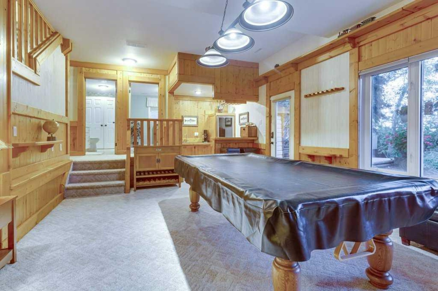 Jenn-Air electric wall oven/microwave combo. Office furniture, Central vac attachment 35 ft. hose. Hunter Douglas blinds throughout. Built-in cue racks. Two sheds and firewood stay. Retractable garden hoses. Garage: Tall cabinets included, hanging storage included, low-voltage exterior lighting