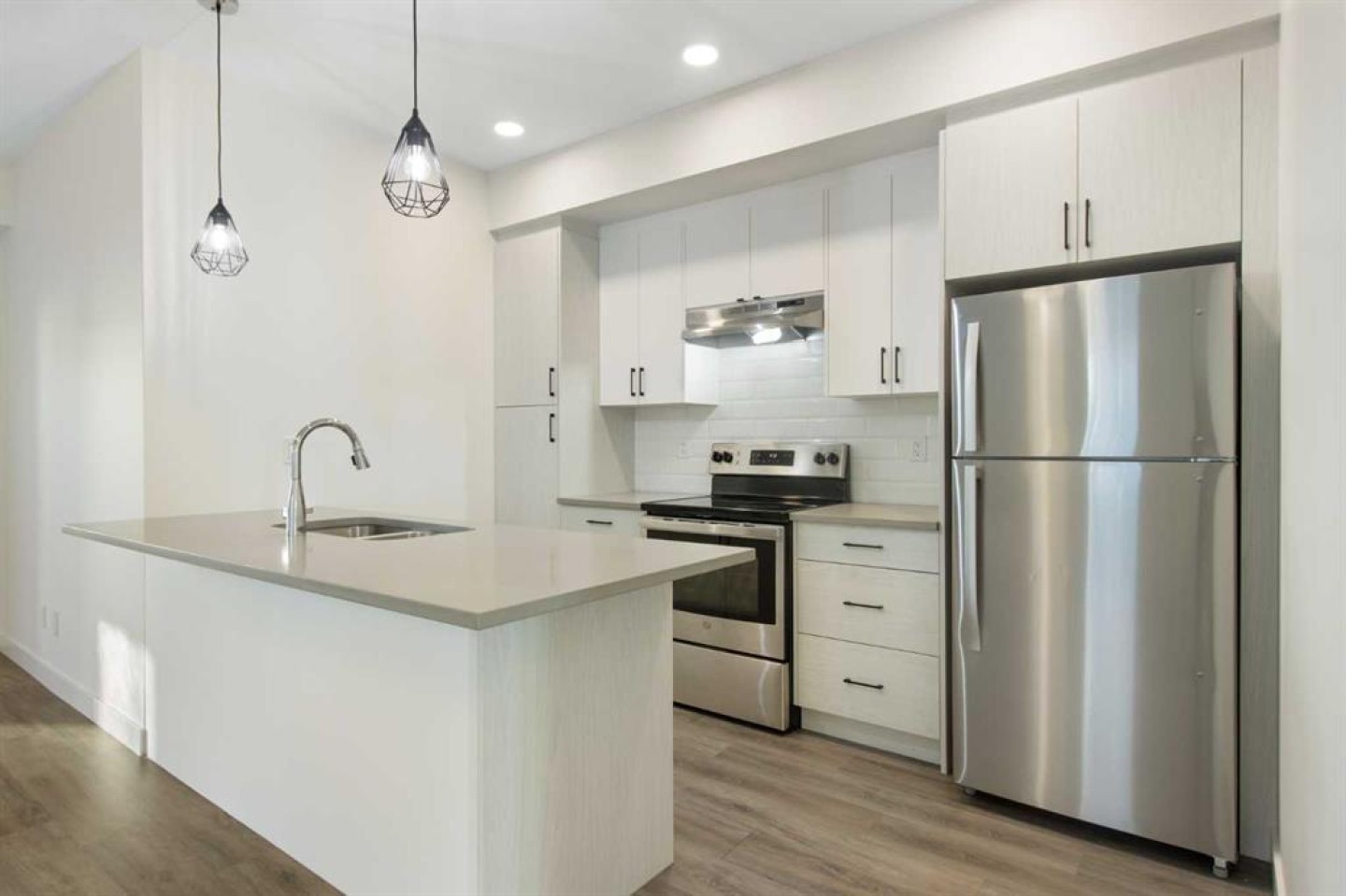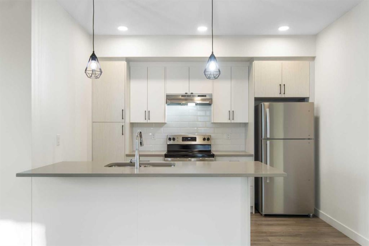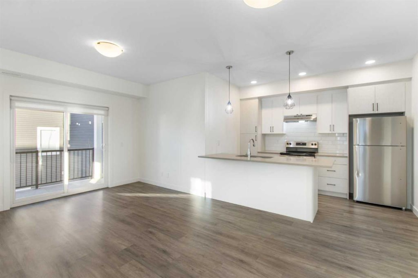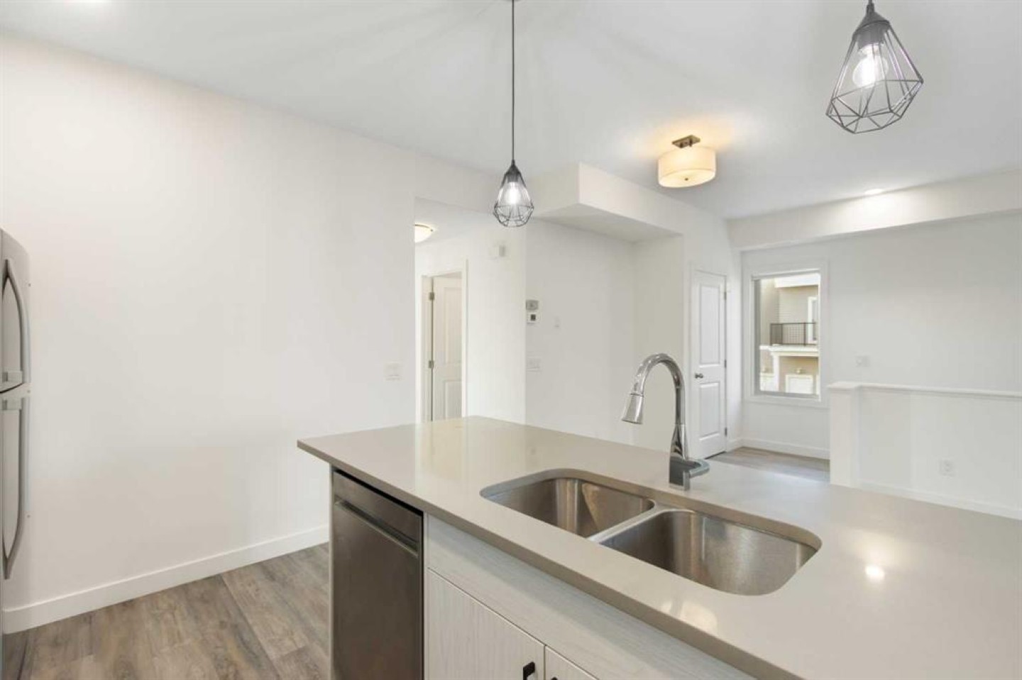 2 Bedroom 2 Bath END unit townhouse with a garage that offers the perfect blend of style and function, with most of the layout conveniently situated on a single level. Step inside and up 1 flight of stairs to the main floor and you will discover an open-concept living area with and a fully equipped kitchen boasting quartz countertops, soft-close drawers, and stylish two-tone cabinets highlighted by pendant lighting. An adjacent, flexible space is perfect for a spacious dining area or a home office. This home has two large bedrooms and two full bathrooms. The primary bedroom features a massive walk-in closet and a 4-piece ensuite. A spacious laundry room adds to the convenience. This unique floor plan is designed to feel like a modern apartment but with the added benefits of a main floor storage/flex area and direct access to an oversized, extended single-car garage.This home is perfectly situated to offer the best of both convenience and community. It's located right next to a future school site, with transit options directly at your doorstep for effortless commuting. Enjoy a short two-minute walk to Bow Valley High School, and a quick five-minute trip to the Spray Lakes Sports Centre for all your recreational needs. For bigger city amenities, you're only 20 minutes from South Calgary, and the mountains are within easy reach, with Canmore just a 40-minute drive away.