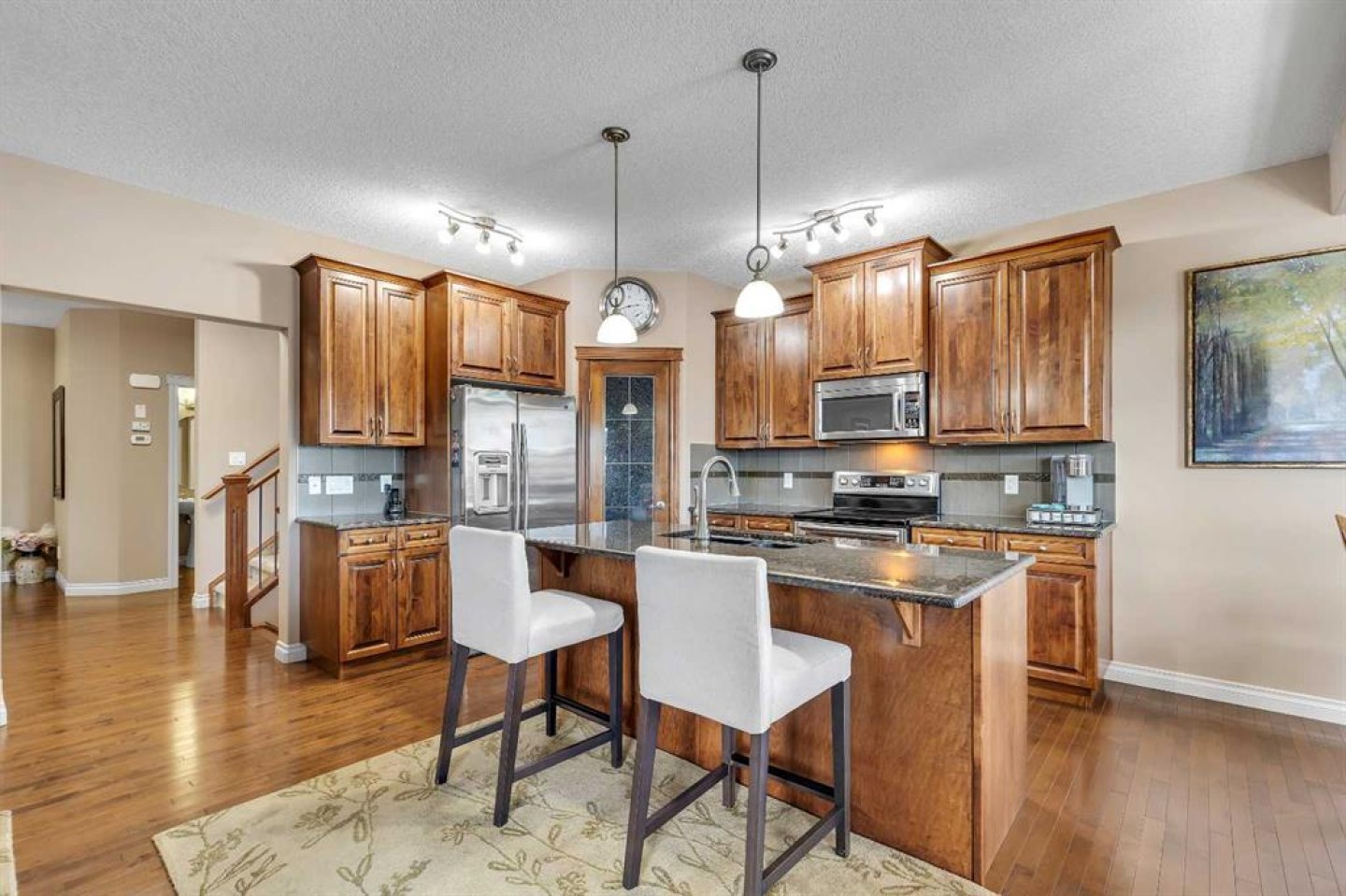 Location, Location, backing into the Canal & pathway. This original owner home offers numerous upgrades & features which include: 9' ceilings, vaulted bonus room, over 3300 sq ft of developed living space, total of 5 bedrooms & 3.5 bathrooms, walkout lower level, upgraded stainless steel appliances, newer composite deck, hardwood, granite in kitchen, wrought iron railings, 2 furnaces, upper furnace has air conditioning, R.I .for speakers on main & upper ensuite, gas line on deck, lower patio area from walkout, manual underground sprinklers in front yard & so much more. The main floor features a 2pc bath, flex room, laundry area, spacious great room with gas fireplace & a large kitchen that offers a pantry, island with eating bar & a nook that has access to the over sized deck that over looks the canal. The upper floor features a 4pc bath, vaulted bonus room & 4 good size bedrooms. The primary bedroom offers a walk in closet & full ensuite. The lower walk out features a bedroom, den, 4pc bath & a family room that has access to the patio/yard. This home shows pride of ownership & is located on a quiet street close to schools, shopping, green spaces & all other amenities. Click on link to view 3D walk through.