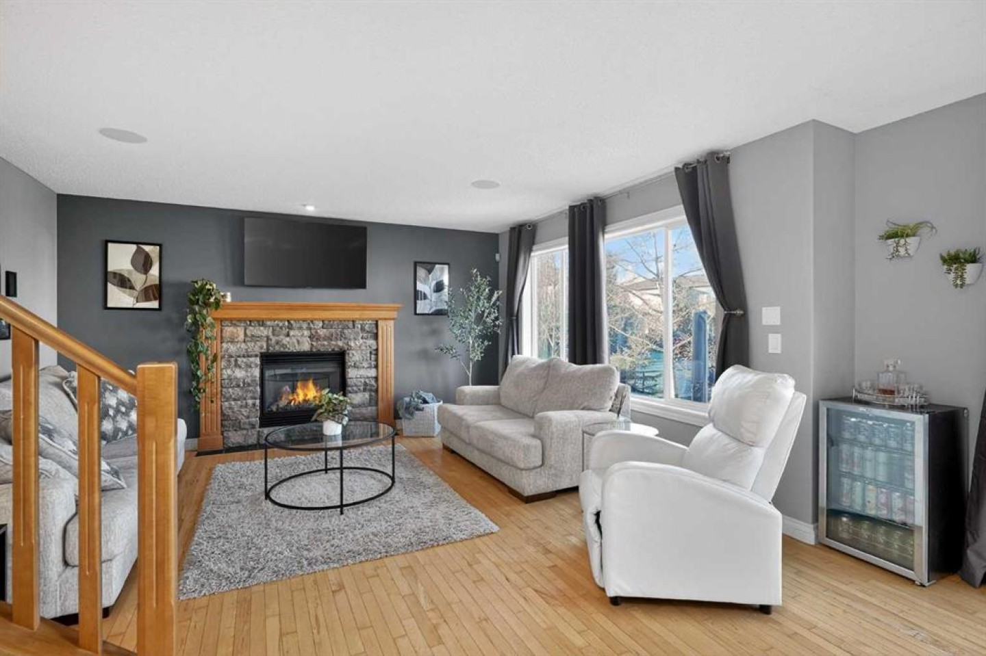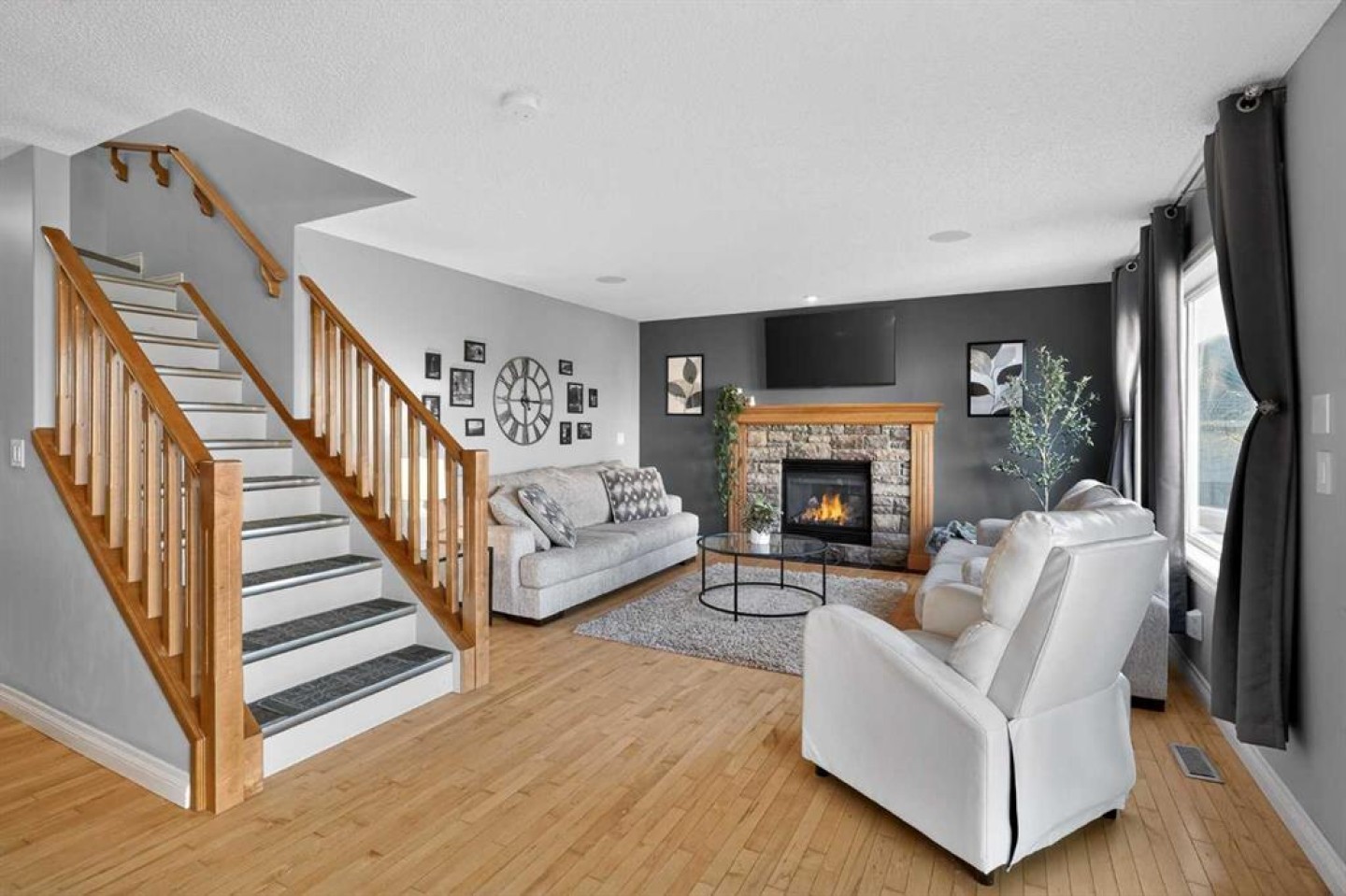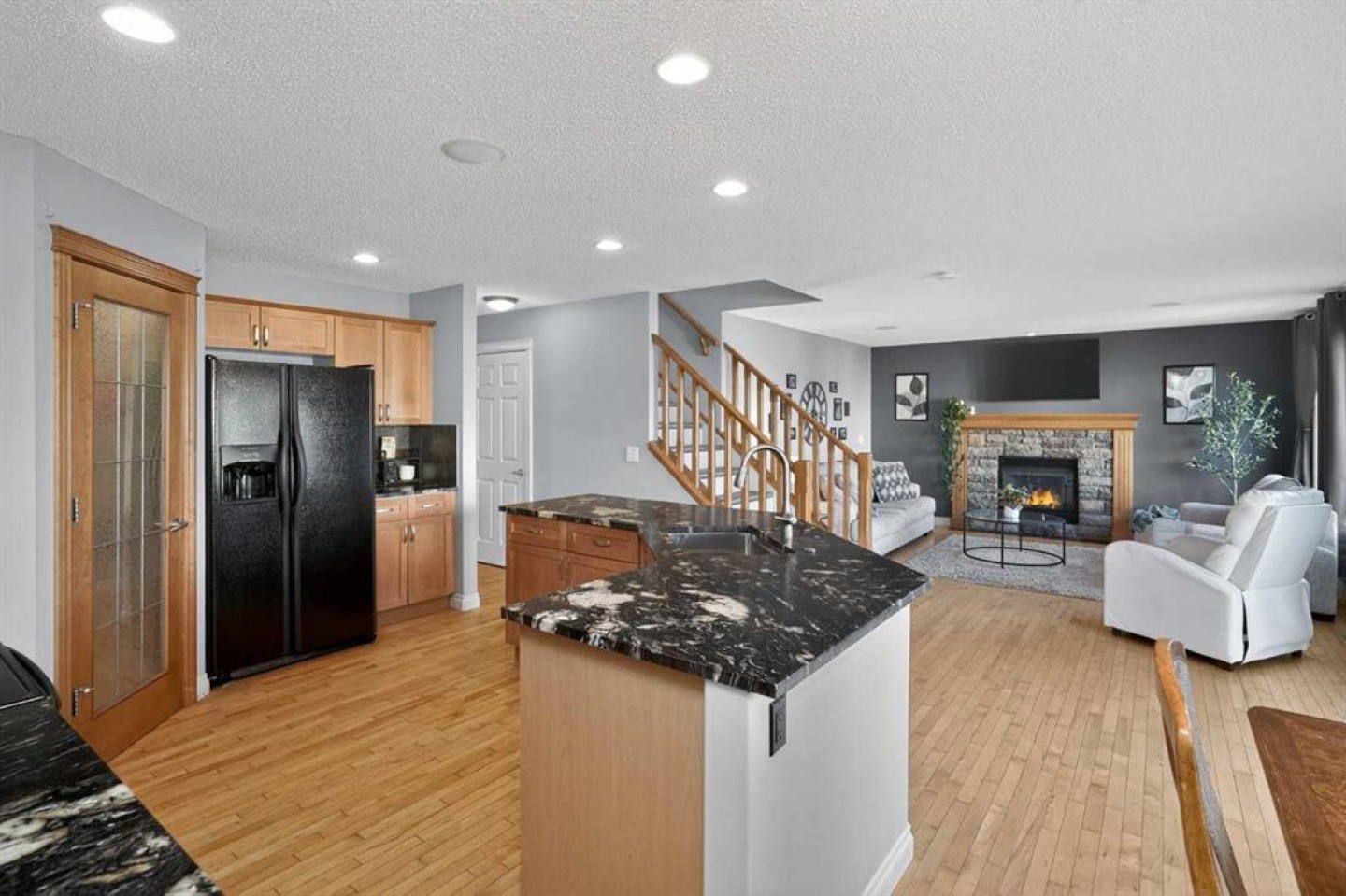 A generous 12’ x 14’ front office provides the ideal space for a home based business or private study. The heart of the home is the open concept main floor, highlighted by a stunning kitchen featuring an oversized centre island, walk-through pantry, and seamless flow into the dining and living areas. The inviting living room showcases rich hardwood flooring, a cozy gas fireplace, and expansive west facing windows that fill the space with natural light.