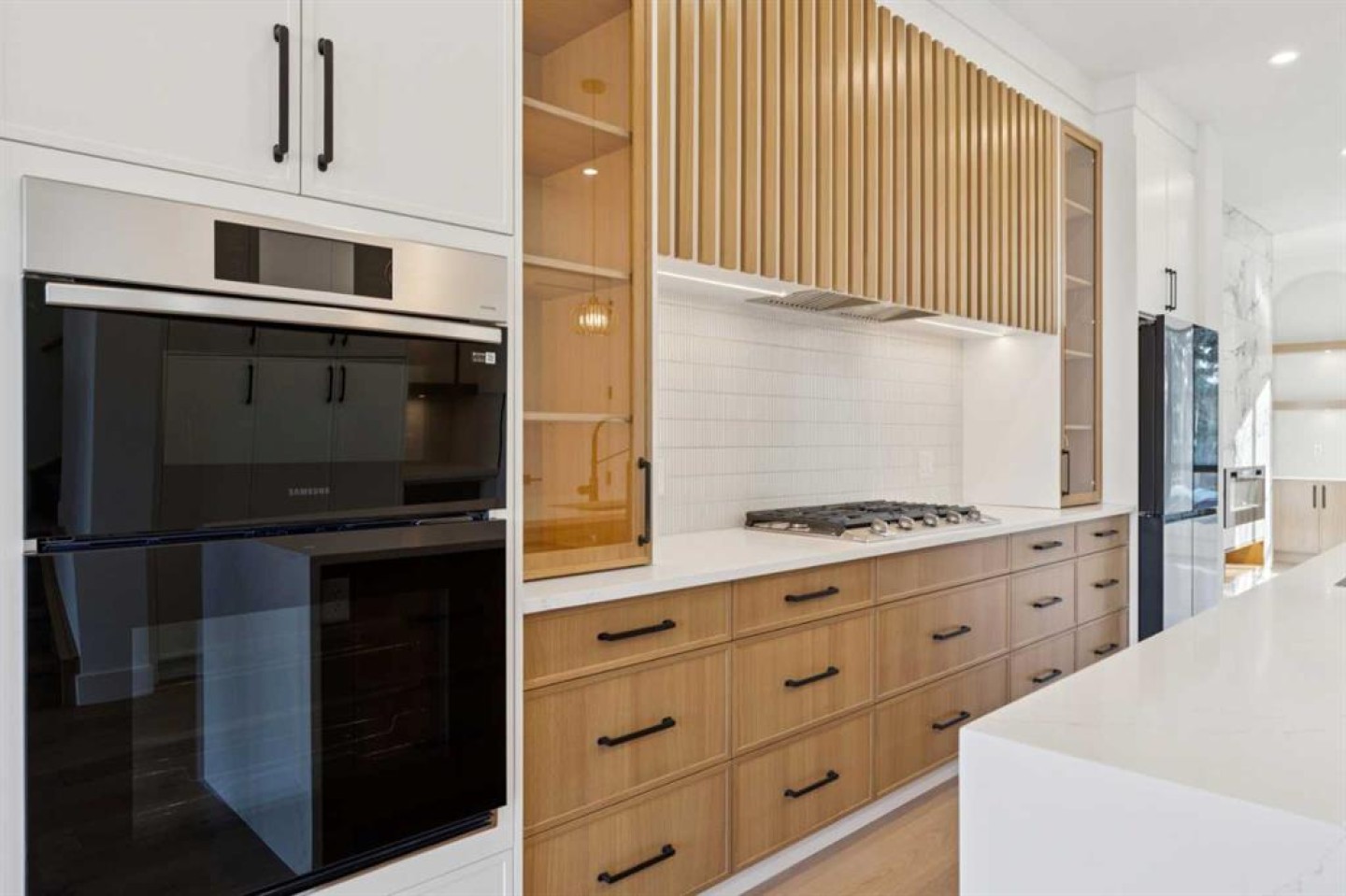 The main level is designed for both style and function, featuring 10-ft ceilings, a bright open-concept layout, and oversized windows that fill the space with natural light. The kitchen is well appointed, with ceiling-height cabinetry, a massive island with waterfall quartz counters, and premium stainless steel appliances. The living room is bright and welcoming, with modern finishes and built-in cabinetry that offers plenty of functional storage. Dining room with double sliding doors overlooking the spacious backyard.