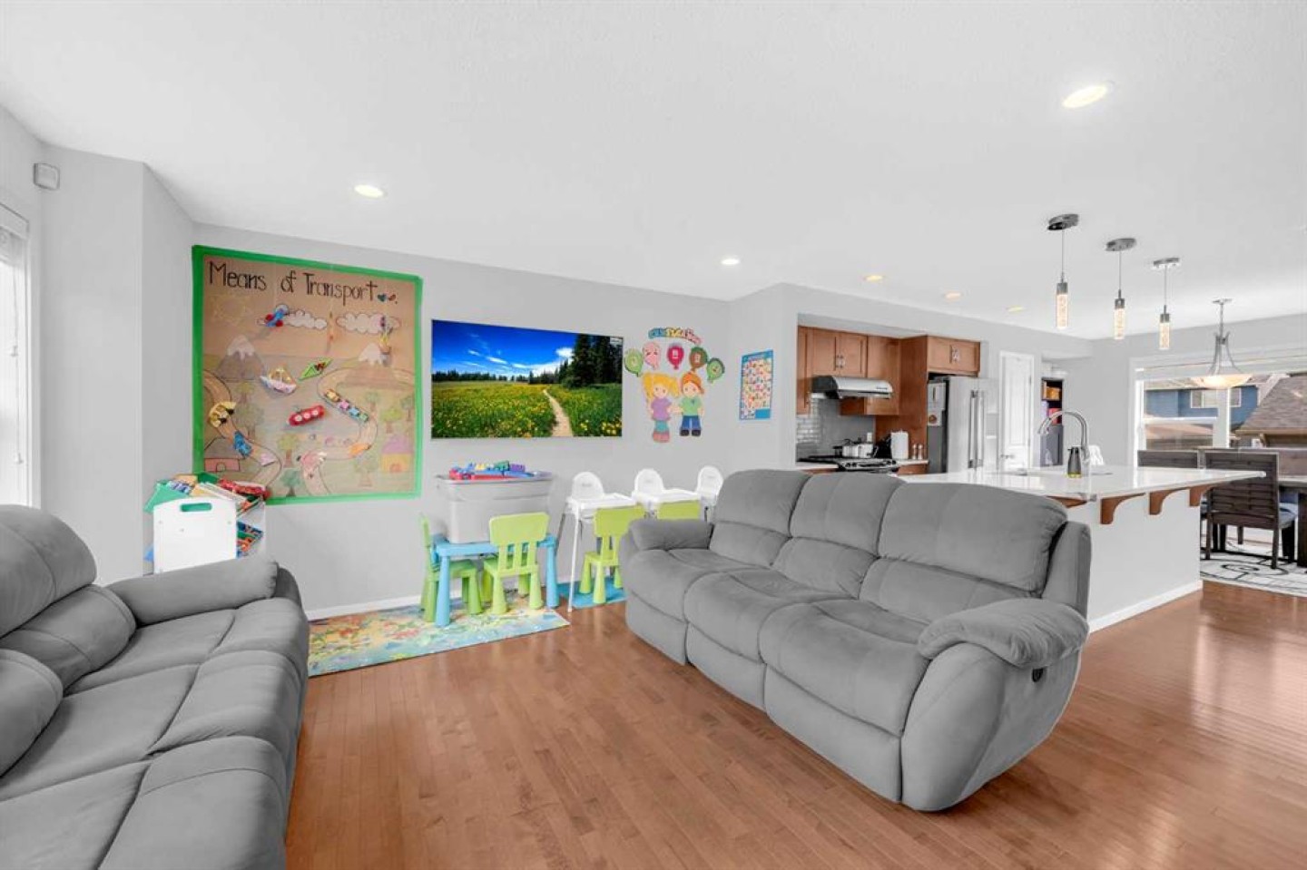 The main floor boasts a well-sized living room filled with NATURAL light, a MODERN kitchen with STAINLESS STEEL Appliances, a central ISLAND, and AMPLE cabinetry, along with a DINING area that opens directly to the landscaped backyard — perfect for family gatherings and entertaining. A rear DOUBLE Garage with back alley access completes this level.
