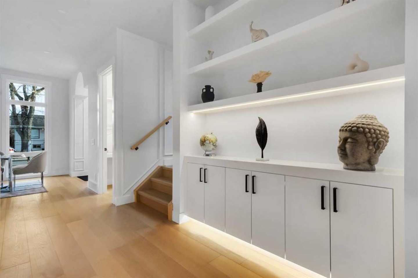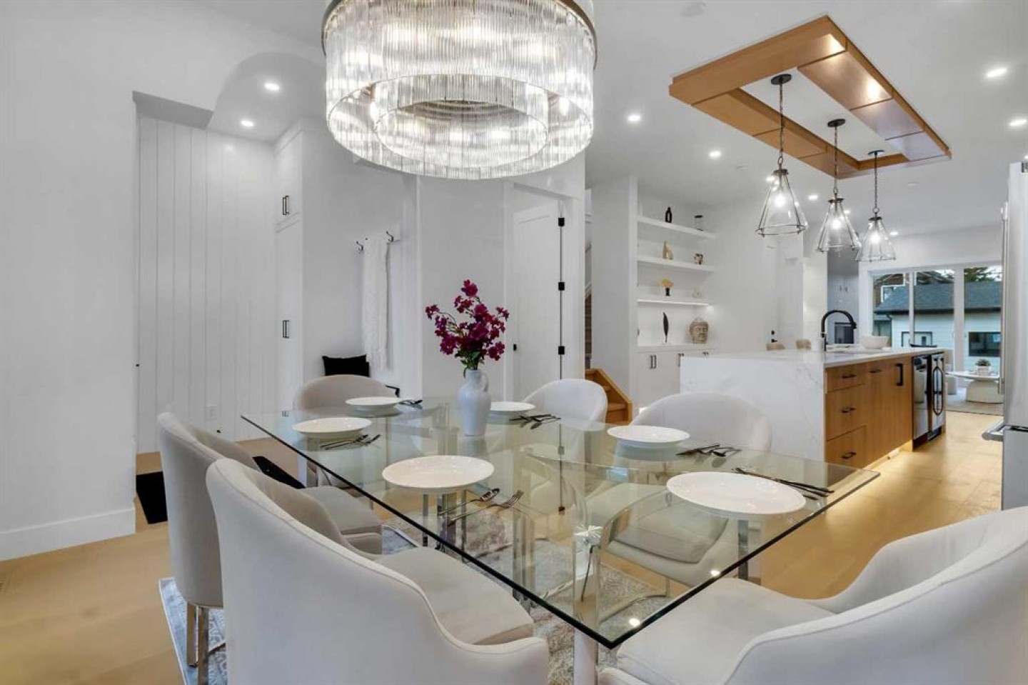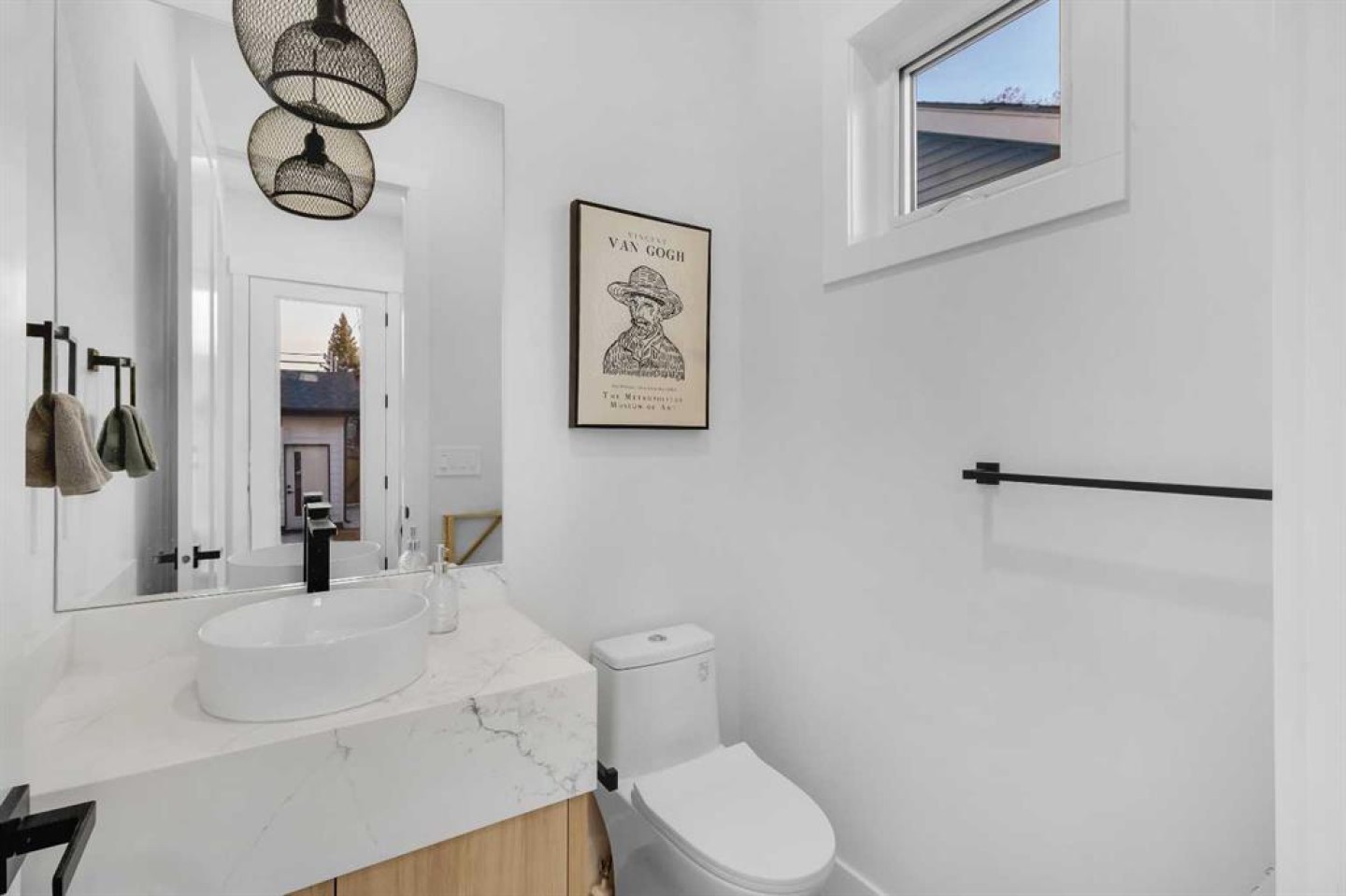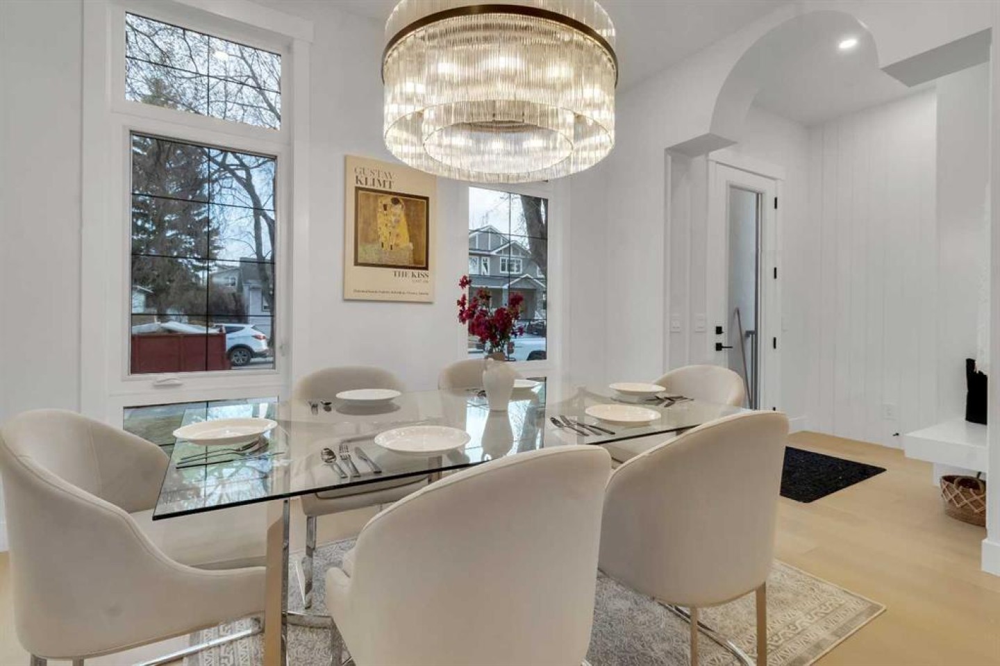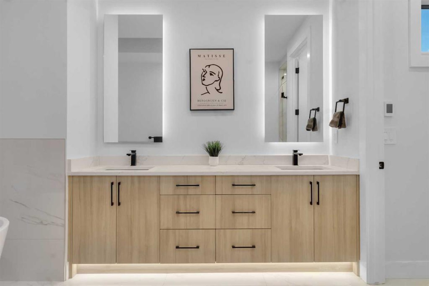 Modern luxury and timeless design come together in this brand new, meticulously crafted infill by Moon Homes, ideally located on a quiet, tree lined street in the heart of Mount Pleasant. Offering thoughtfully curated living across all three levels, this residence delivers elevated craftsmanship, refined architectural detailing, and exceptional functionality just steps from Confederation Park and minutes to downtown. The main floor is defined by soaring 10 foot ceilings, oversized windows, rich hardwood flooring, and custom millwork throughout. A grand arched entry opens to a spacious foyer, setting the tone for the sophisticated interior. The open concept living and dining areas are anchored by a beautifully tiled gas fireplace with custom built ins and a statement chandelier, while large sliding patio doors create seamless indoor outdoor flow to the rear concrete patio, ideal for entertaining. The chef inspired kitchen is a true showpiece, featuring a massive quartz island, premium Frigidaire Professional Series appliances, a custom slat hood fan, bar fridge, and full height cabinetry with extensive pull out storage. Thoughtfully designed LED lighting including under cabinet, toe kick, floating shelf, and glass front upper lighting adds both function and dramatic ambiance. A dedicated pocket office or home workspace and a custom mudroom with built ins are perfectly positioned for modern daily living, complemented by a stylish powder room with a floating vanity and designer lighting. Upstairs, wainscoting continues through a bright, sun filled hallway. The primary retreat is nothing short of exceptional, showcasing nearly 15 foot vaulted ceilings, a fully detailed feature wall, upper transom windows, plush carpeting, and a striking chandelier. The walk in closet offers custom shelving, pull outs, and motion sensor LED lighting. The spa inspired ensuite includes heated tile floors, dual vanities, a freestanding soaker tub, a tiled rainfall shower with bench, ambient mirror and vanity lighting, and a private water closet. Two additional bedrooms each feature walk in closets and share a beautifully appointed four piece bathroom. A well designed upper laundry room includes LG appliances, folding counter, deep sink, cabinetry, hanging rack, and linen storage conveniently located near the bedrooms. The fully finished legal basement suite (pending final inspection) offers a private side entrance and mirrors the quality of the main home. Complete with a full kitchen, spacious living area, modern four piece bathroom, and dedicated laundry with built in sink, this space is ideal for extended family, guests, or future rental income. Finished with a detached double garage and paved alley access, this home is surrounded by top rated schools, parks, pathways, Mount Pleasant Pool, and beloved local amenities, with quick access to major routes and the city core.