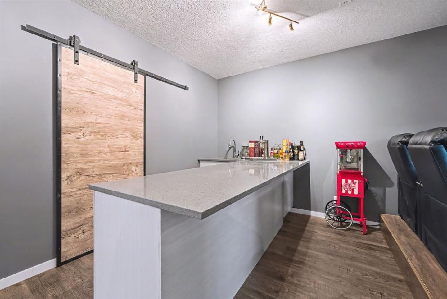 Projector and speakers in basement, TV Mounts, Movie couches, Sink basement bedroom