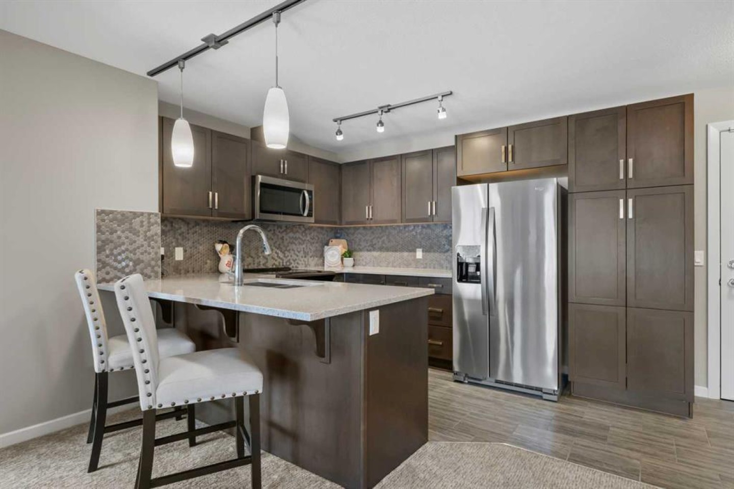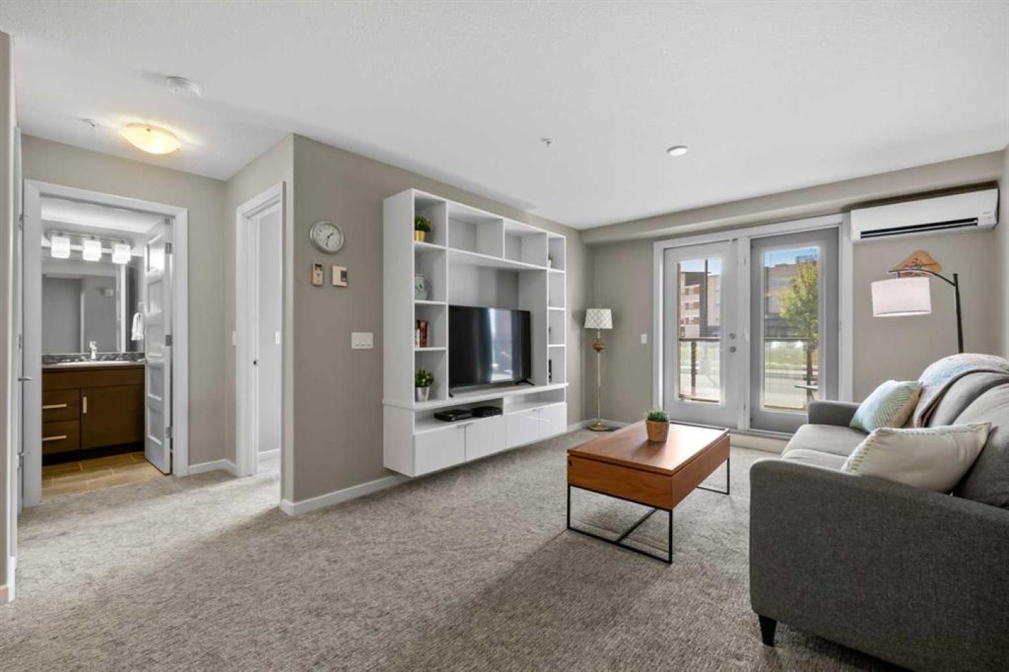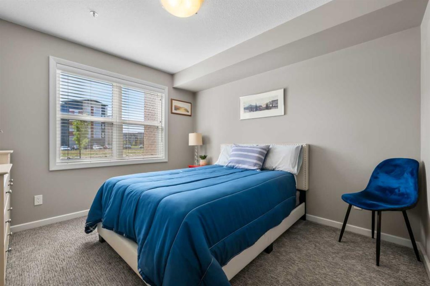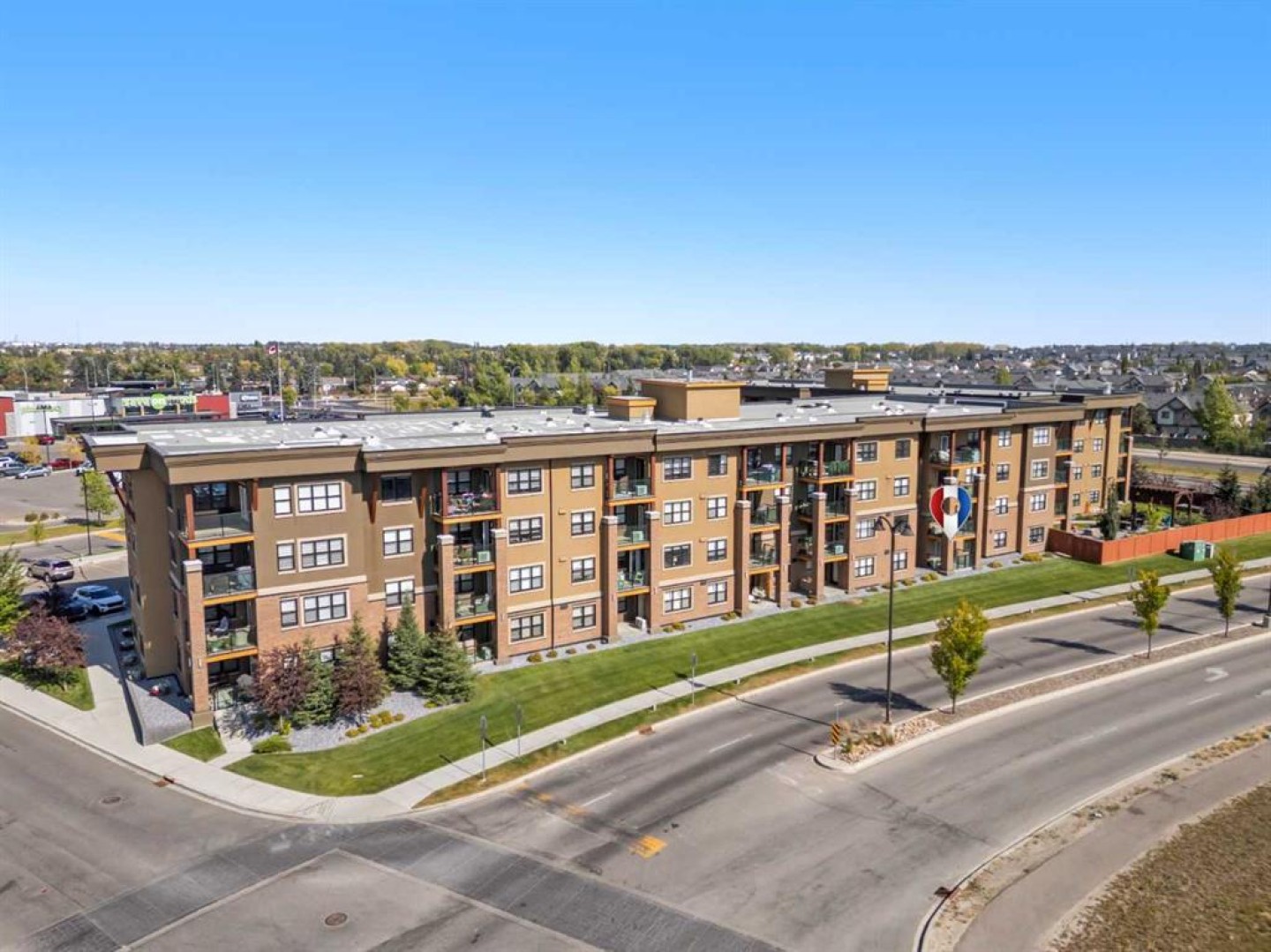 Welcome to The Chateaux! Airdrie's premier 55+ condo building in the wonderful community of Kings Heights known for its sophistication, exceptional pride of ownership and unbeatable access to nearby amenities. Upon entering this unit, you'll be impressed by the abundance of natural light, enhanced by its south-facing exposure. You're greeted by beautiful tile flooring that leads into a welcoming front entrance, where you'll find a spacious coat closet with built-in shelves, perfect for storing coats, keys and shoes. To your right is the kitchen, you will love not only the generous counter space but also the ample cabinetry this layout offers. The kitchen features granite countertops, a large sink, a lazy Susan in the corner cabinet, a garburator and a counter overhang for bar stool seating, ideal for casual meals. Stainless steel appliances and a well-appointed pantry with pull-out drawers complete this thoughtfully designed space. Moving into the living room, enjoy a spacious layout complemented by a beautiful custom California Closets media centre that is perfect for your TV, artwork and storage needs. Stay cool in the summer with a wall-mounted A/C UNIT! Your southwest-facing balcony offers year-round afternoon sun, making it the perfect place to enjoy your morning coffee, tea or an evening drink. This balcony was upgraded at the time of construction with glass panels and a gate, offering convenient direct access to the landscaped common areas, especially great for pet owners. The primary bedroom is a dream, with a large south-facing window and a spacious walk-through closet that leads into your ensuite bathroom. The ensuite features a walk-in shower with a built-in seat and elegant glass doors. The second bedroom is impressively sized and bright with custom built-in California Closet organizers that provide exceptional storage and organization. A second full bathroom is located just outside this room, complete with a beautiful vanity and a large bathtub. In-suite laundry is neatly tucked into a dedicated closet with room for storage and laundry supplies. This apartment also features a versatile den to the left of the front door that is ideal for a home office, additional storage or exercise space. For parking, enjoy the convenience of a titled underground stall located just steps from the elevator. In front of your stall, you’ll find a large, secure storage locker. Plus, there’s ample outdoor visitor parking for your guests. The Chateaux features a beautifully landscaped courtyard with a gas fireplace, and an amenity room available for private bookings where residents regularly gather here for social events and happy hours. There's also a secure underground workshop for woodworking enthusiasts. Located in Kings Heights, you’re within walking distance to Save-On-Food, Shoppers Drug Mart, banks, salons, restaurants and more meeting all your grocery, shopping and healthcare needs. Call for a private viewing today!