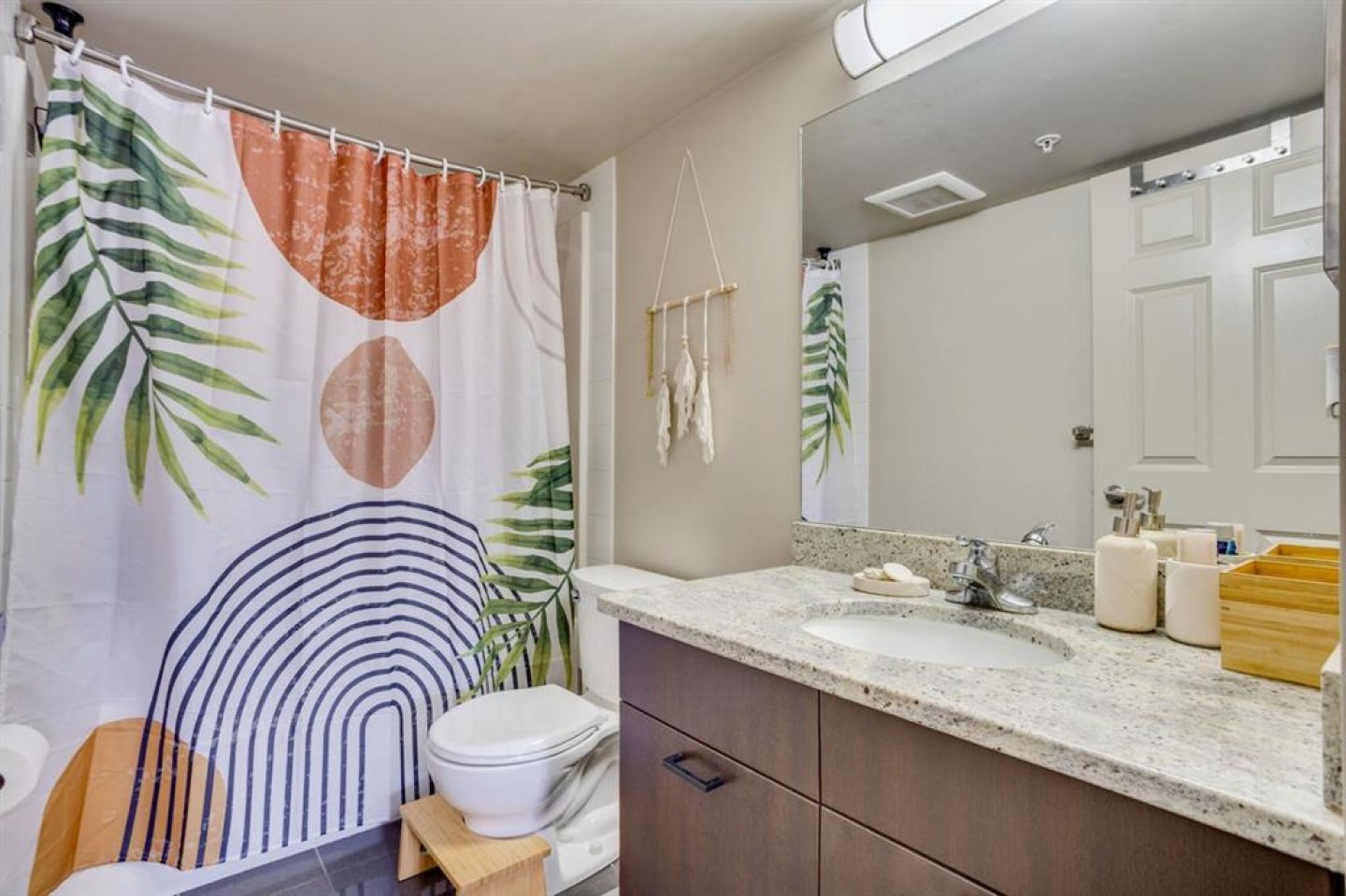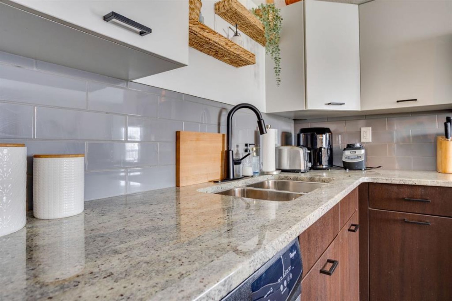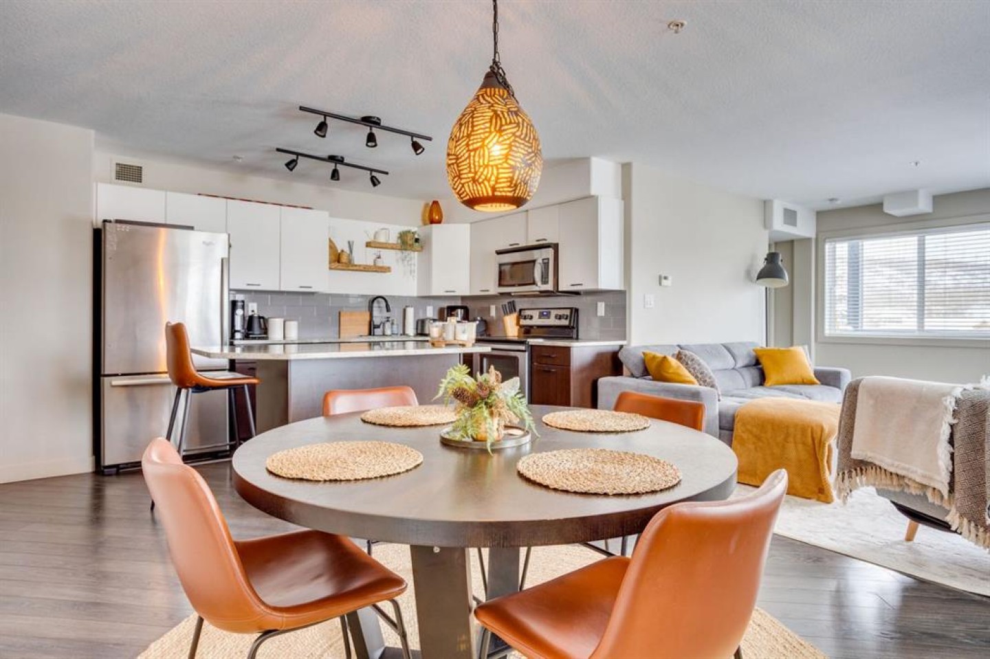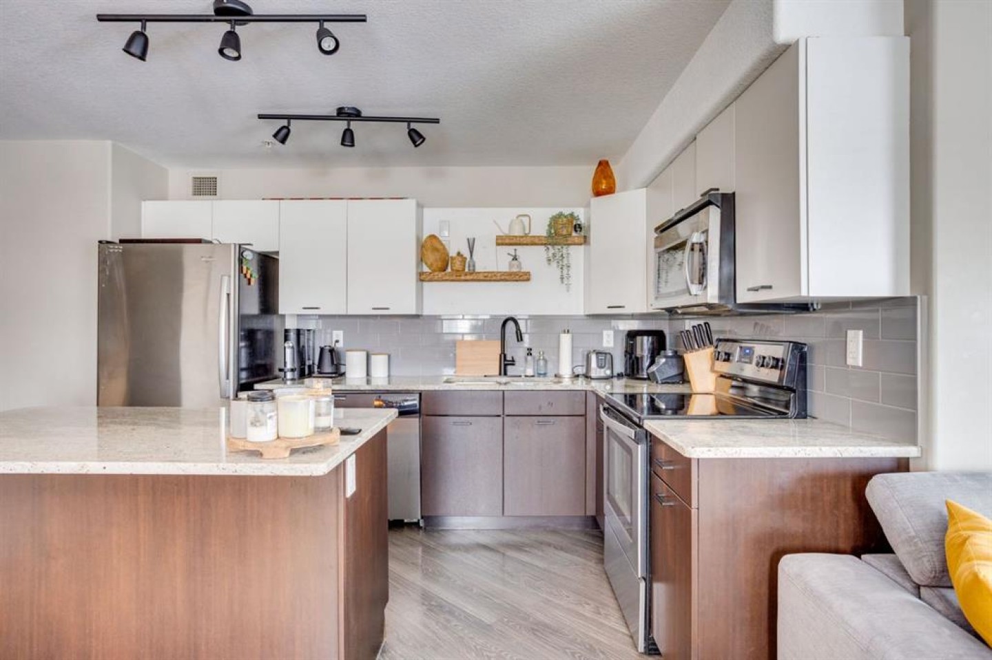 The bright, modern kitchen is equipped with laminate flooring, crisp white cabinetry, granite countertops, and a convenient eat-up breakfast bar, complemented by ample cabinet and counter space. The home also features stainless steel appliances, including a refrigerator, stove, microwave, washer, and dryer, along with a stylish grey subway tile backsplash.