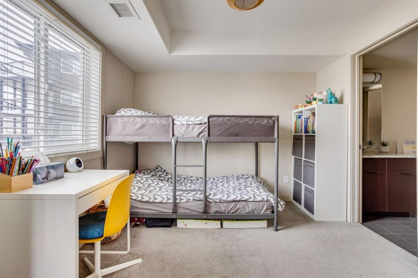 Both bedrooms are generously sized and offer plush carpet flooring and large windows that allow for abundant natural light. The primary suite includes a walk-through closet and a four-piece ensuite bathroom with a tub/shower combination. The secondary bedroom is directly connected to an additional three-piece bathroom, which also features a secondary entrance from the main living area—providing added convenience for guests or family.