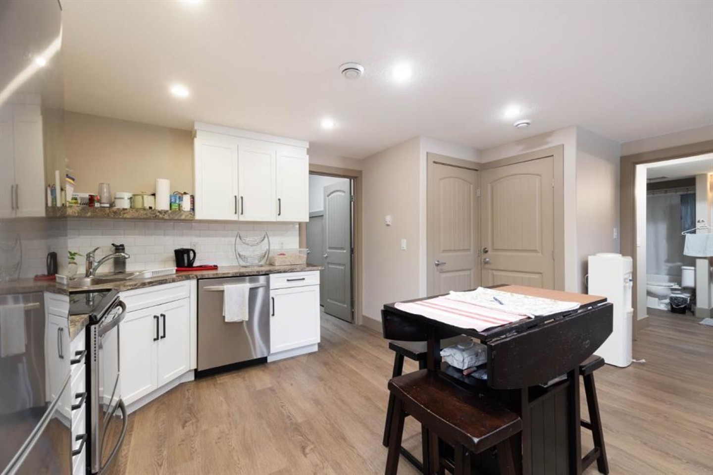 The kitchen is designed for both function and style, featuring ceramic tile flooring, white quartz countertops, and ample cabinetry and counter space. There are two generous bedrooms that have carpet flooring, full 4-piece bathroom, and a dedicated main floor laundry area complete this level.