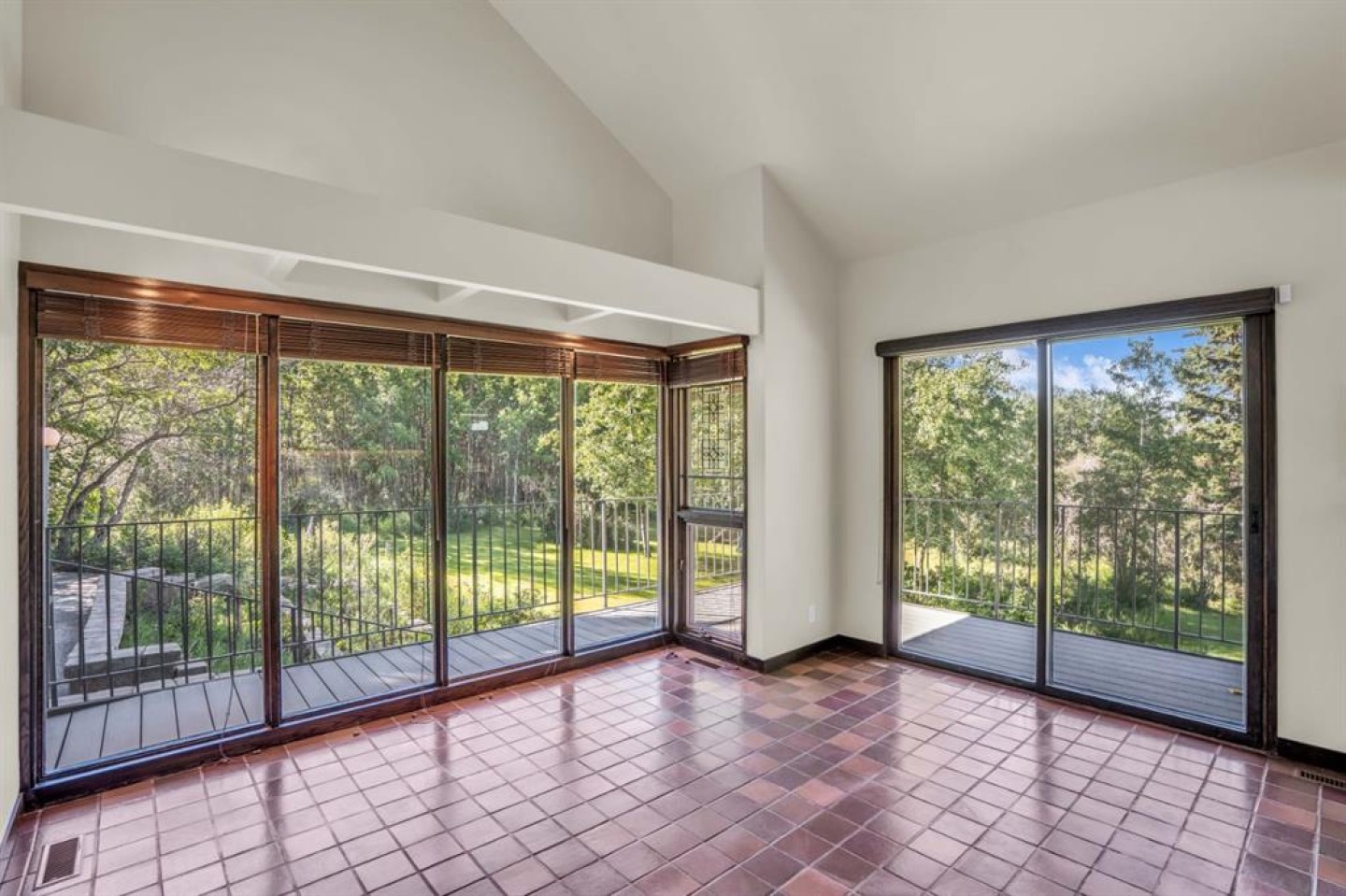 a fireplace built from rocks gathered on the property. French doors lead to a west-facing patio, the perfect spot to watch the sun set behind the