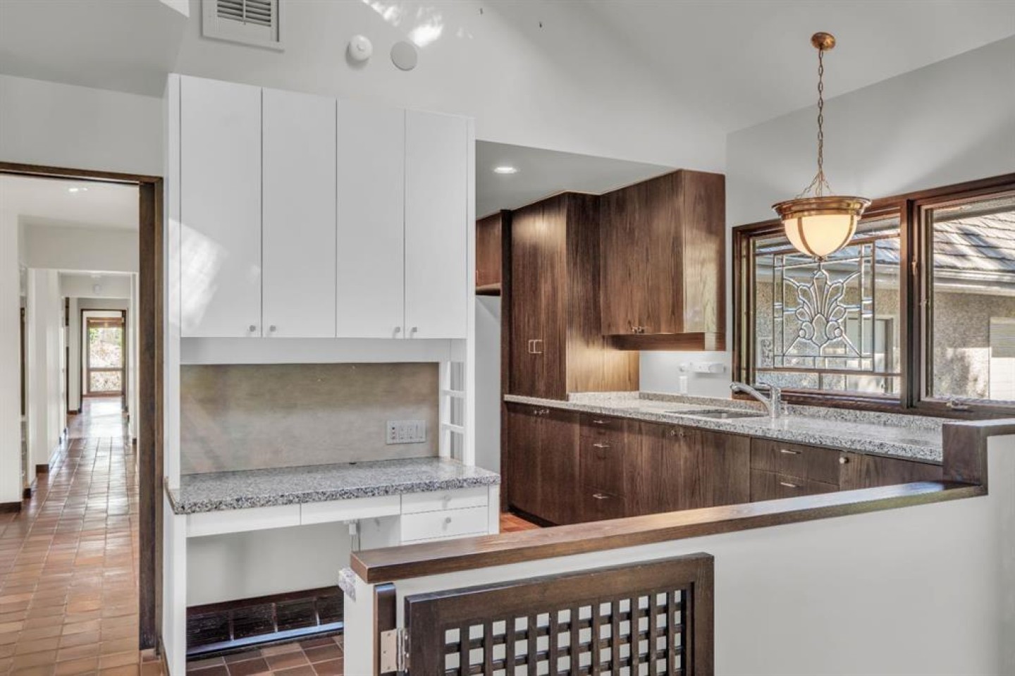 SUNLIT updated kitchen features premium appliances, granite counters, a spacious dining area with full-height windows, and a generous butler’s