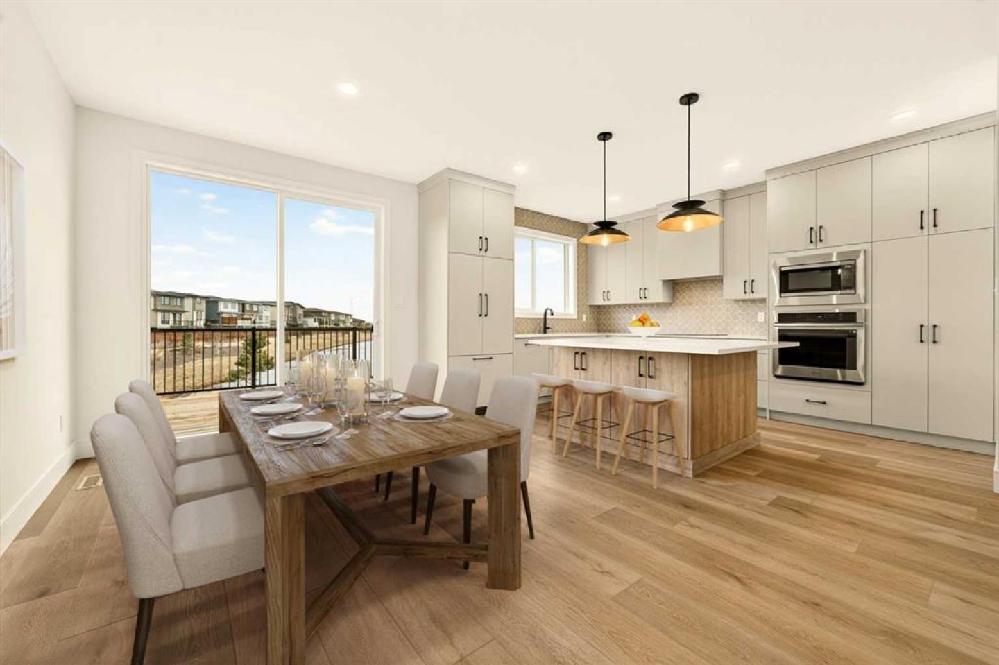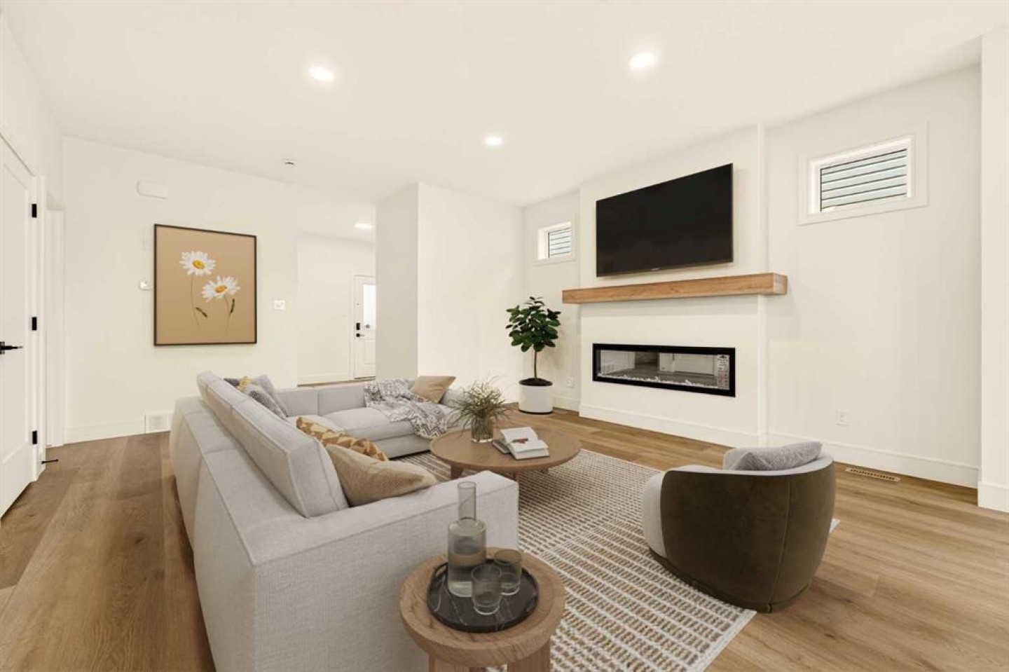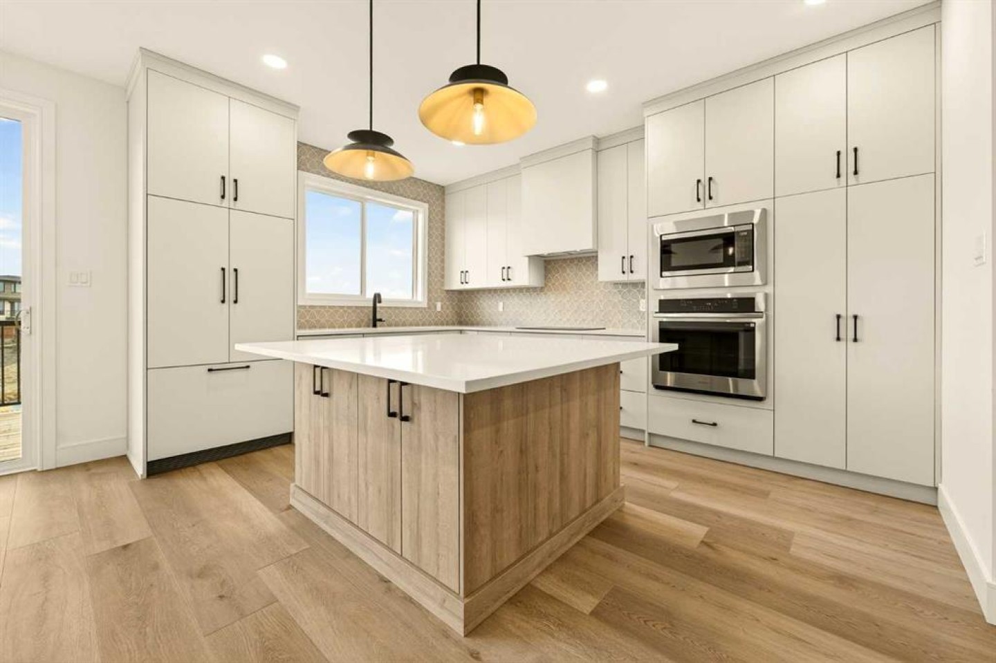 Inside, the wide-open main floor is designed for modern living, offering a seamless flow that feels spacious the moment you step in. The kitchen is the heart of the home and it delivers on both form and function, anchored by a massive square island with additional cabinetry below for extra storage. The sink is thoughtfully placed beneath a window overlooking the pond, turning everyday tasks into something a little more enjoyable. High-end, fully paneled appliances elevate the space, including a Fisher & Paykel refrigerator, a paneled dishwasher, a built-in oven and microwave, and a sleek matte induction cooktop that ties the whole design together. The living room is warm and inviting, centered around an electric fireplace with a custom mantel that adds character without overwhelming the clean, modern aesthetic.
