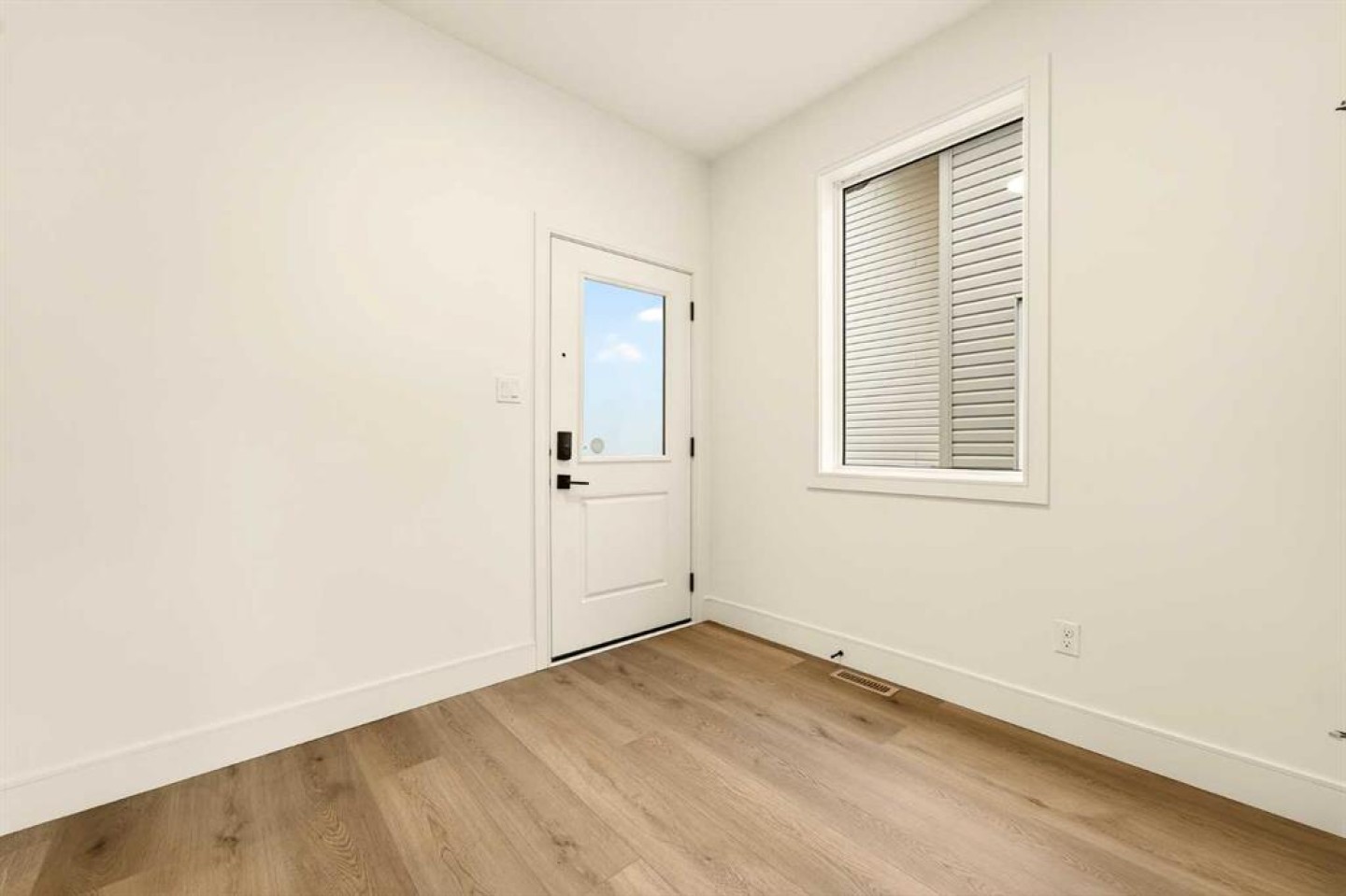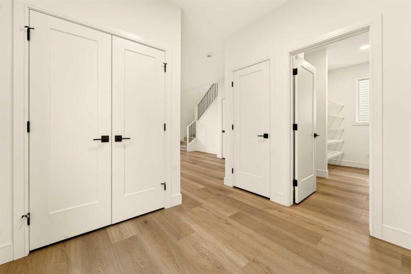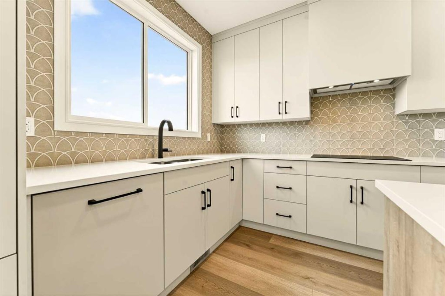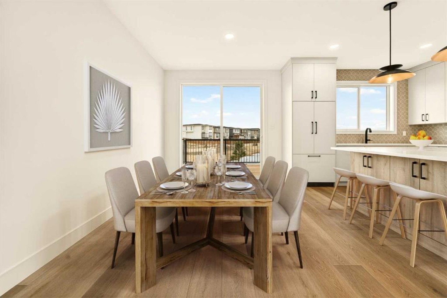 Inside, the wide-open main floor is designed for modern living, offering a seamless flow that feels spacious the moment you step in. The kitchen is the heart of the home and it delivers on both form and function, anchored by a massive square island with additional cabinetry below for extra storage. The sink is thoughtfully placed beneath a window overlooking the pond, turning everyday tasks into something a little more enjoyable. High-end, fully paneled appliances elevate the space, including a Fisher & Paykel refrigerator, a paneled dishwasher, a built-in oven and microwave, and a sleek matte induction cooktop that ties the whole design together. The living room is warm and inviting, centered around an electric fireplace with a custom mantel that adds character without overwhelming the clean, modern aesthetic.