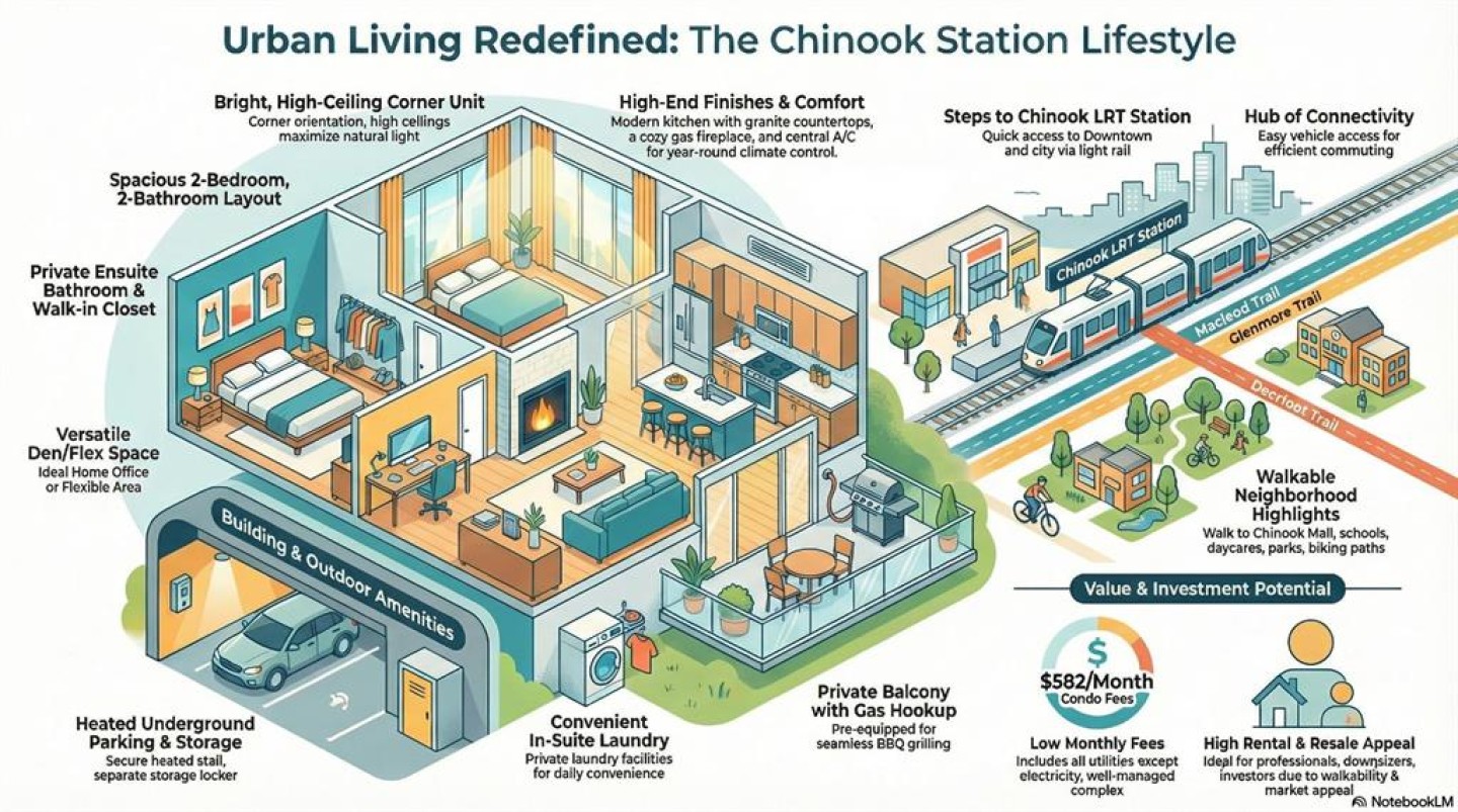 RARE Spacious 2 bedroom, 2 bathroom + Den layout *** ENSUITE bathroom and WALK-IN closet in primary bedroom *** Newer Dishwasher, Stove, and Microwave Hood Fan (Approximately 3 Years Old) *** BRIGHT corner unit with natural light *** HIGH CEILINGS *** Gas fireplace *** Central A/C *** GRANITE countertops *** In-suite laundry *** Balcony with gas BBQ hookup *** HEATED UNDERGROUND PARKING and SEPARATE STORAGE Locker, Both Forming Part of the Condo Unit Title. *** Low Condo Fees - $582/month *** All UTILITIES INCLUDED Except Electricity *** Well-managed and well maintained complex *** Steps to CHINOOK LRT station *** Quick Access to Downtown *** Easy Access to Macleod Trail, Glenmore Trail, and Deerfoot Trail *** Walking distance to Chinook mall *** Nearby parks and green spaces *** Walking and biking paths *** Close to SCHOOLS and DAYCARES *** Excellent walkability and transit access *** Strong long-term rental appeal