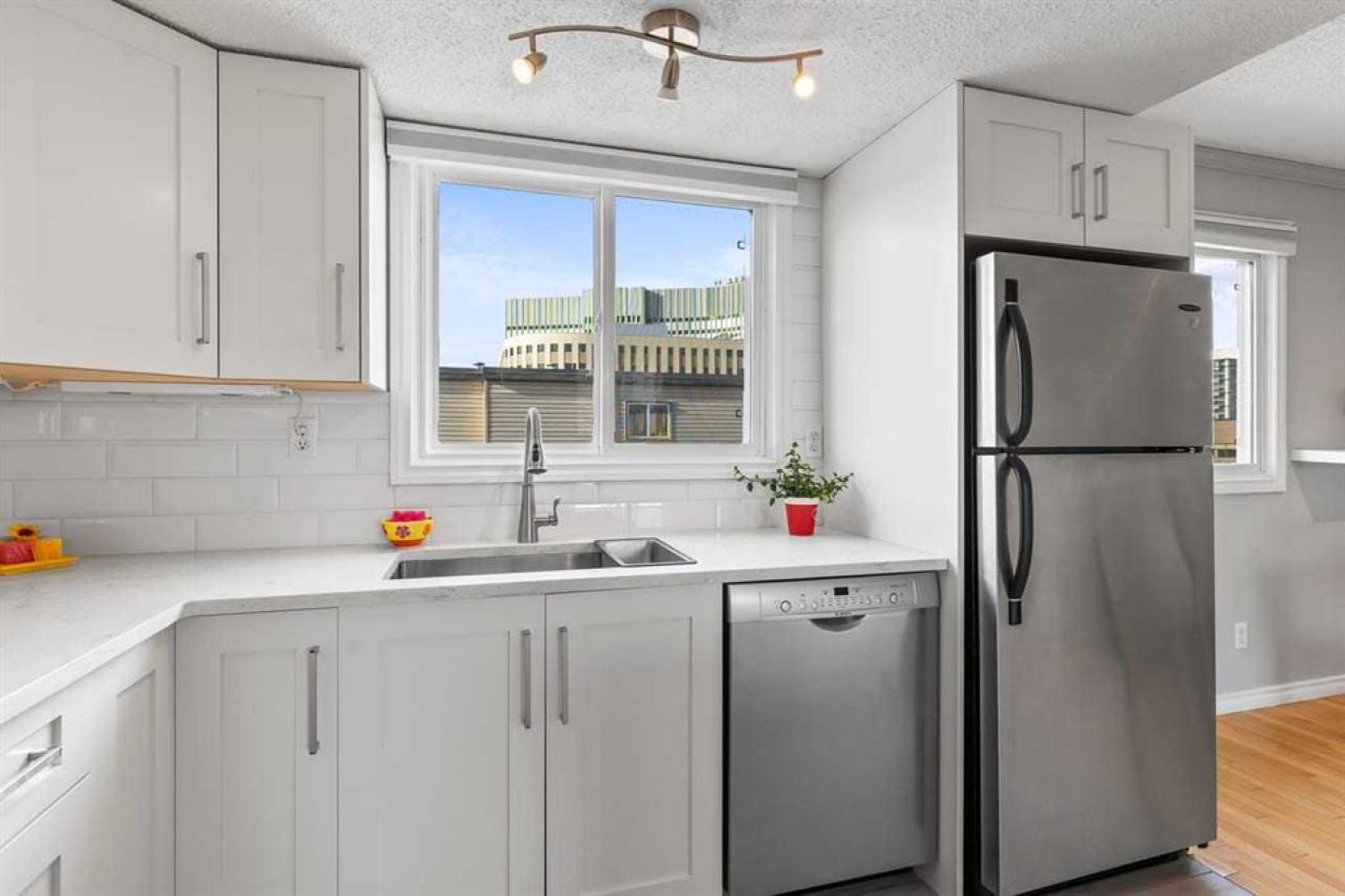 Gorgeous and spacious 3 bedroom home with no walls in common with neighbours. You will enjoy mealtime in the spotless open kitchen with white quartz counter top and island top , deep and wide undermount sink, white subway tile backsplash, shaker cabinets, stainless steel appliances including a brand new stove. The 331 sq.ft. living room (new ceiling fan) is open to the kitchen and dining room and also opens onto a generous deck overlooking a common greenspace. Hardwood floors, crown mouldings, upgraded baseboards and casings. One of the three bedrooms has a triple wide closet. The large bathroom features a double sink vanity and a seamless tub-shower with dome light. The in suite storage room is big enough to be used as a den. In suite full size washer and dryer too. It's walking distance to the Foothills Hospital/ Arthur J.E. Child Centre. Close to the University, Children's Hospital and half a block to one of the best pizza's in town. Also included: sofa, bookcase, desk, bbq, 2 deck chairs with cushions and more.