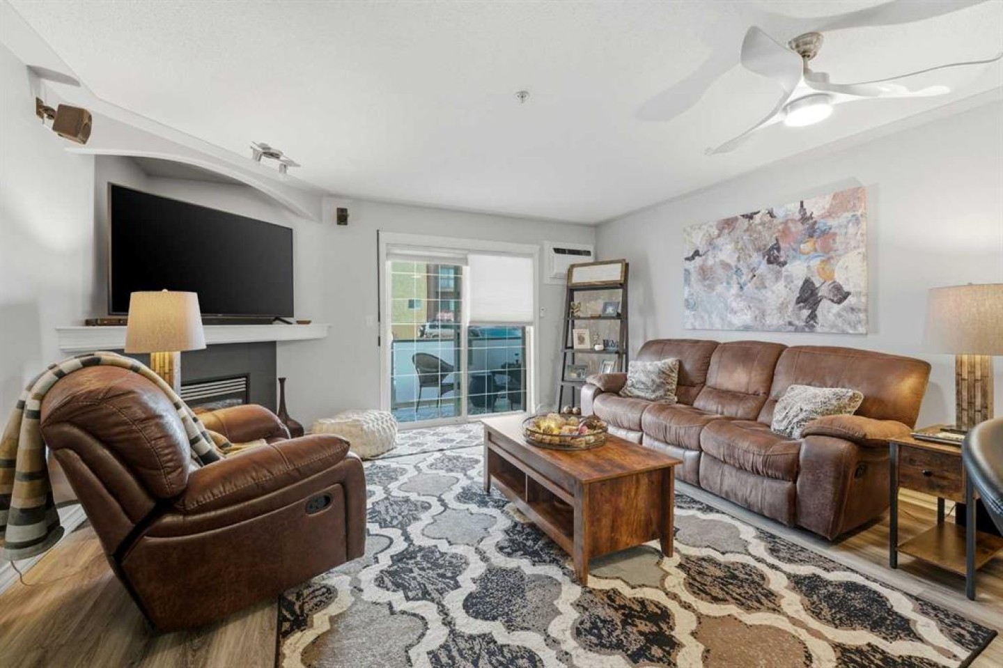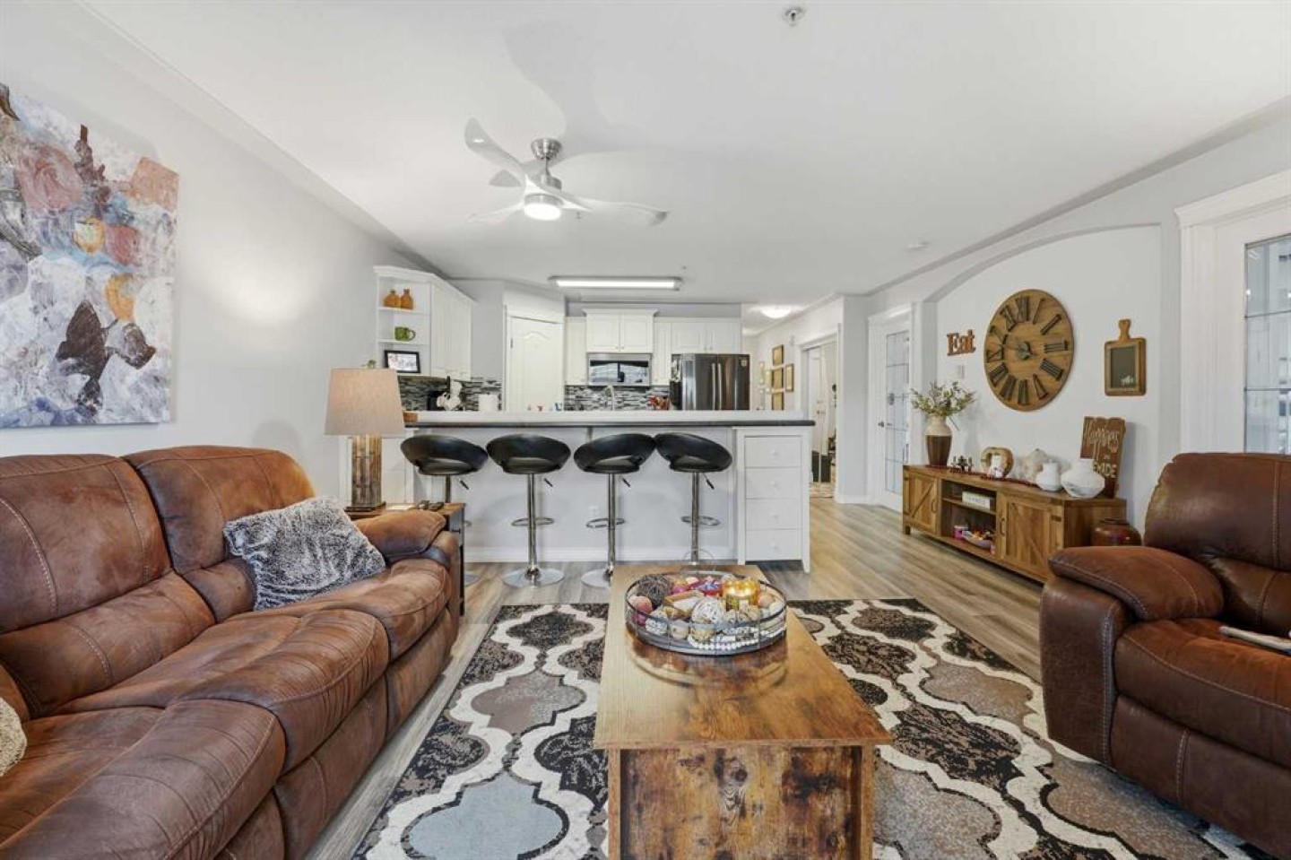 This bright open-concept unit features updated appliances, vinyl plank flooring, neutral paint, updated lighting, countertops, and an eat-up breakfast bar, corner pantry in kitchen. Thoughtful upgrades include: newer air- conditioner, gas fireplace, gas hook up for BBQ on balcony, high-mount toilets and grab bars for added comfort and safety. The spacious primary bedroom offers a walk-in closet and private 3pc ensuite, plus a second bedroom and full bath for guests or office space. Good- sized laundry room which has additional space for storage. Visitor parking just outside garden sliding doors for added convenience.