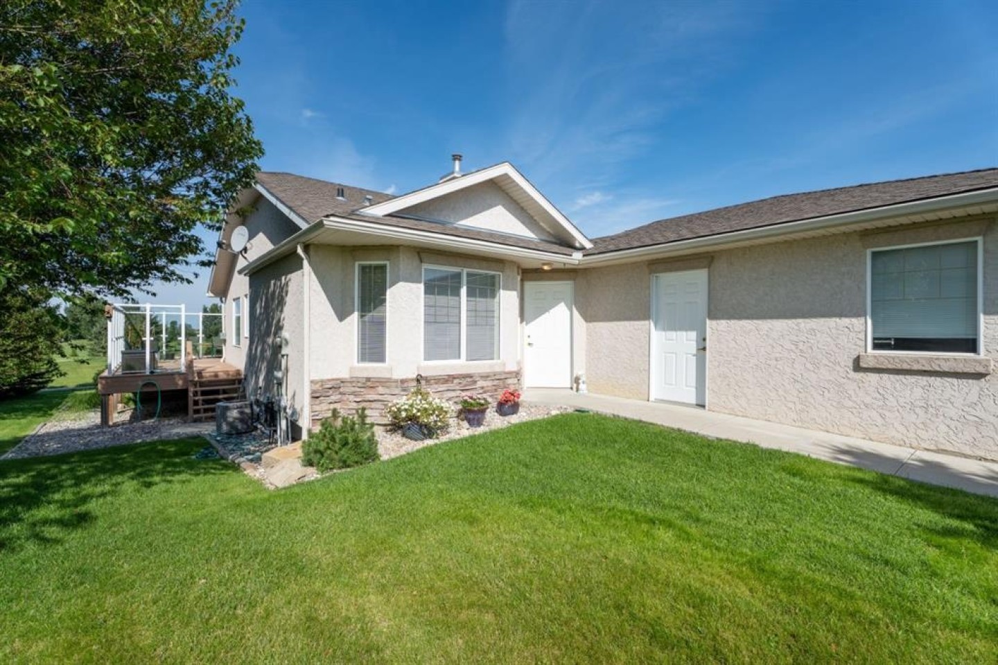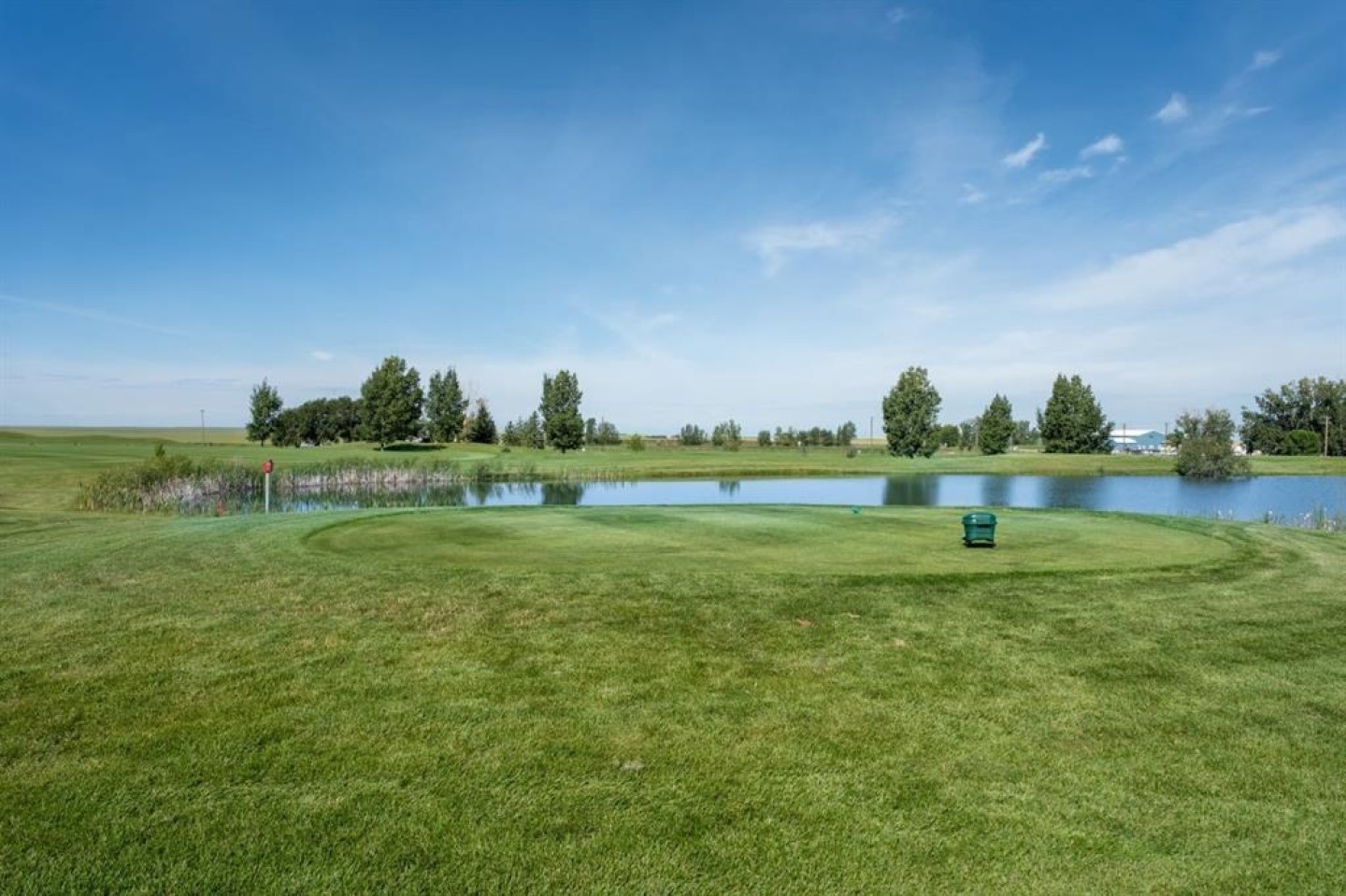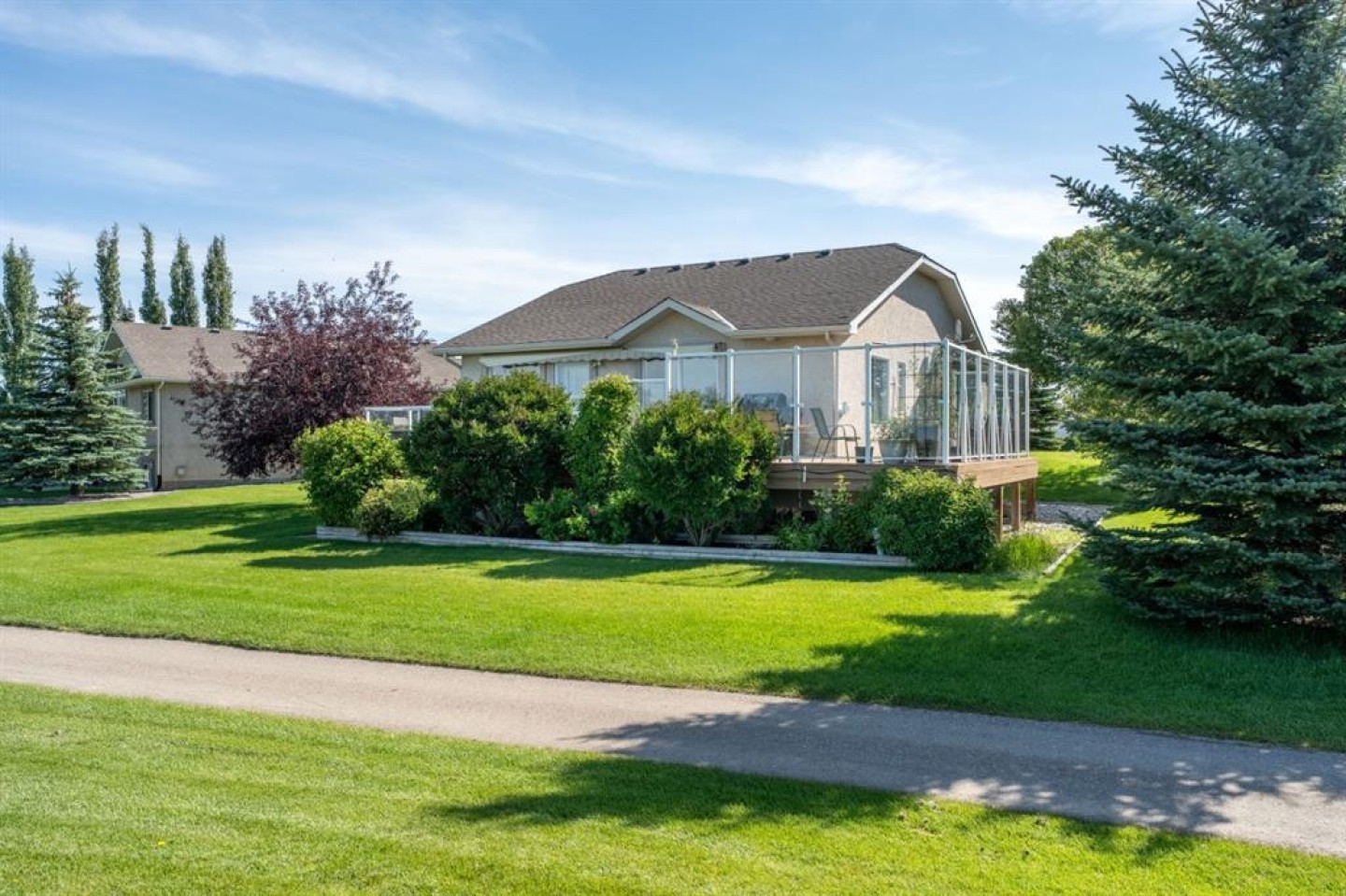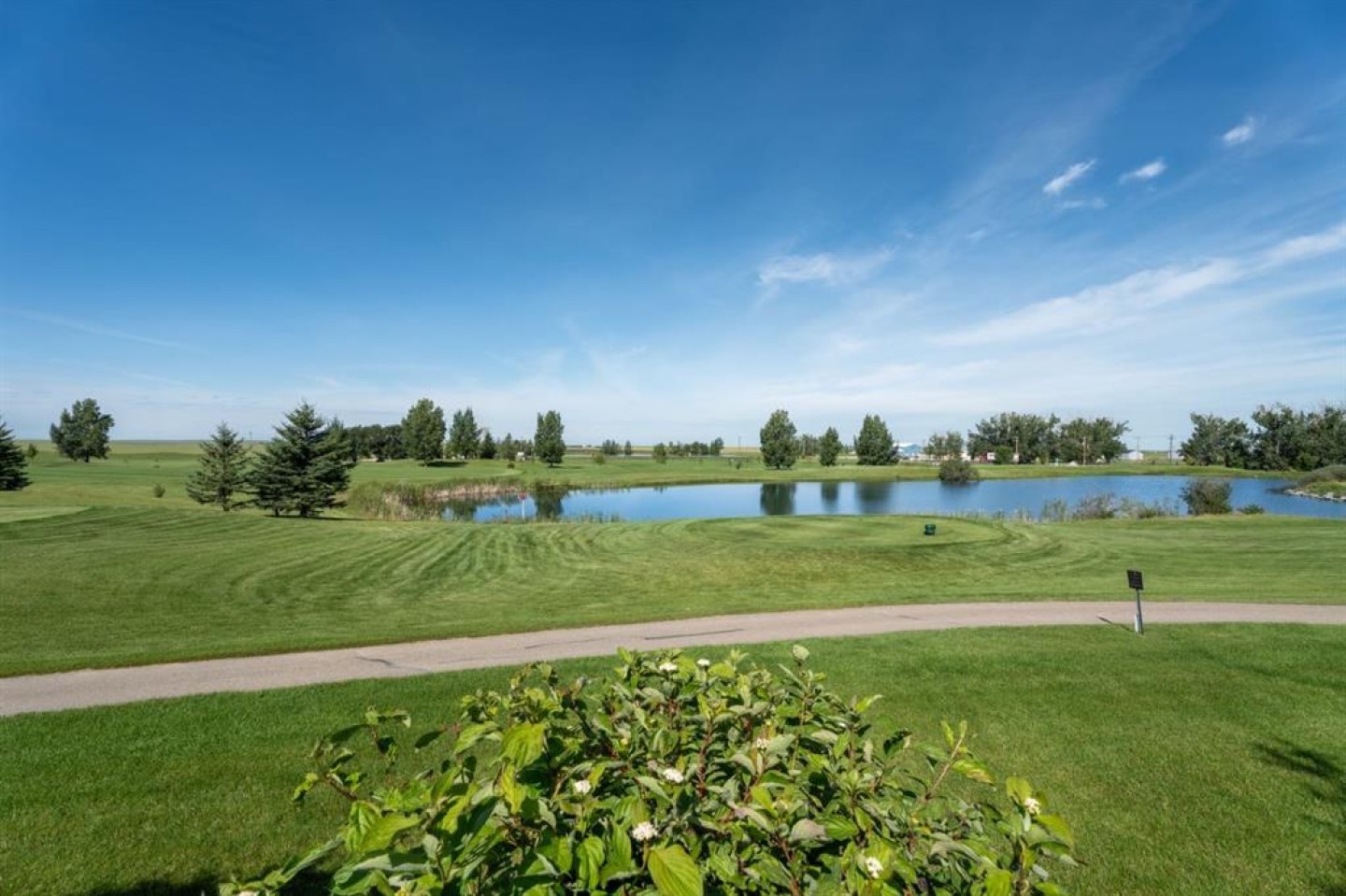 Welcome Home! Imagine life backing onto the 18th hole with a pond view, a view of the prairie fields and the mountains with a TRIPLE GARAGE for the Golf Cart or extra vehicle parking or storage! This well maintained charming bungalow has it all including a stucco exterior, air conditioning, a GAS FIREPLACE in the main floor living room and HEATED FLOORS in the fully finished basement! Retire or slow down your pace of life to the wonderful community of Vulcan, with a hospital, close to shopping, schools and so many things to get involved with year round. This home has a generously sized primary on the main floor with a fully accessible 3 piece ensuite and large walk-in closet. A large chef kitchen with a breakfast bar and dining room looking out at the western facing patio! The patio is equipped with a gas line for the BBQ and a large space to enjoy the outdoors with your own outside oasis! A cozy living room with a gas fireplace and a large gathering area to relax and slow down with a glass of wine after a day on the Greens! The laundry room is also on the main floor as well as a bright secondary bedroom. Downstairs is fully finished with in floor heat, a large recreation room, a wet bar as well a bedroom, and a 4 piece bathroom! There is tons of space for storage downstairs as well as a hobby room! Vacuflo is throughout the main floor and basement and even in the garage. Outside you have Underground Sprinklers and automatic watering for the flower beds to enjoy maintenance free yard in the summer months!! Come see this beautiful home today backing onto the Greens today in Whispering Creek Vulcan!