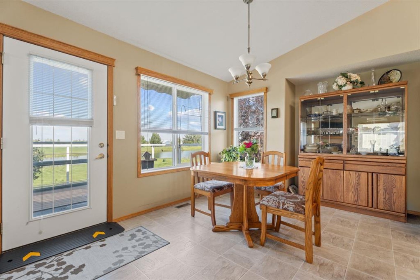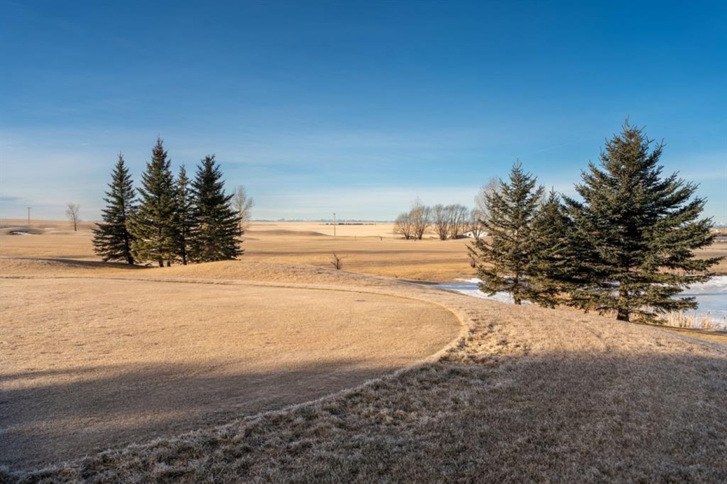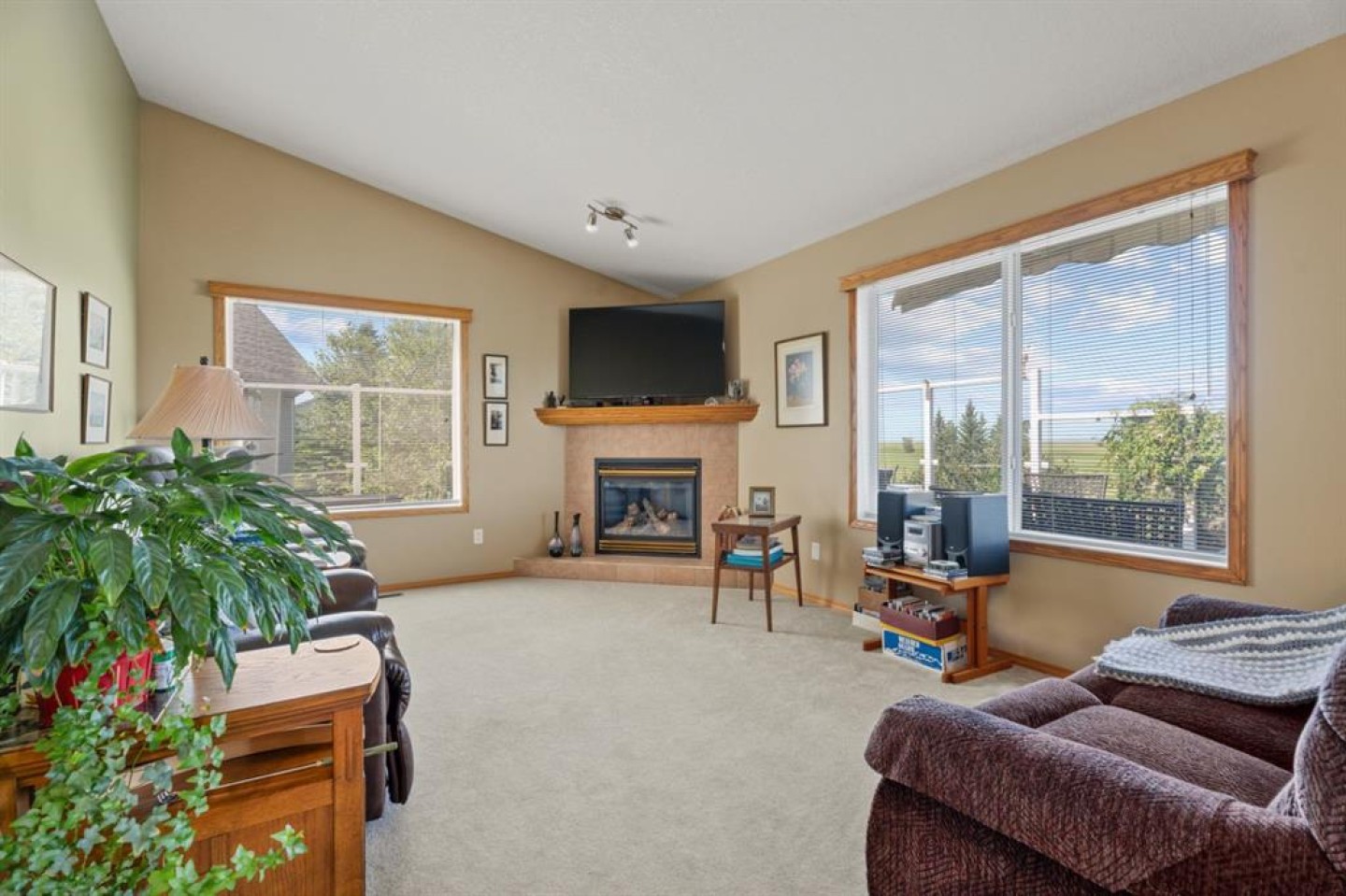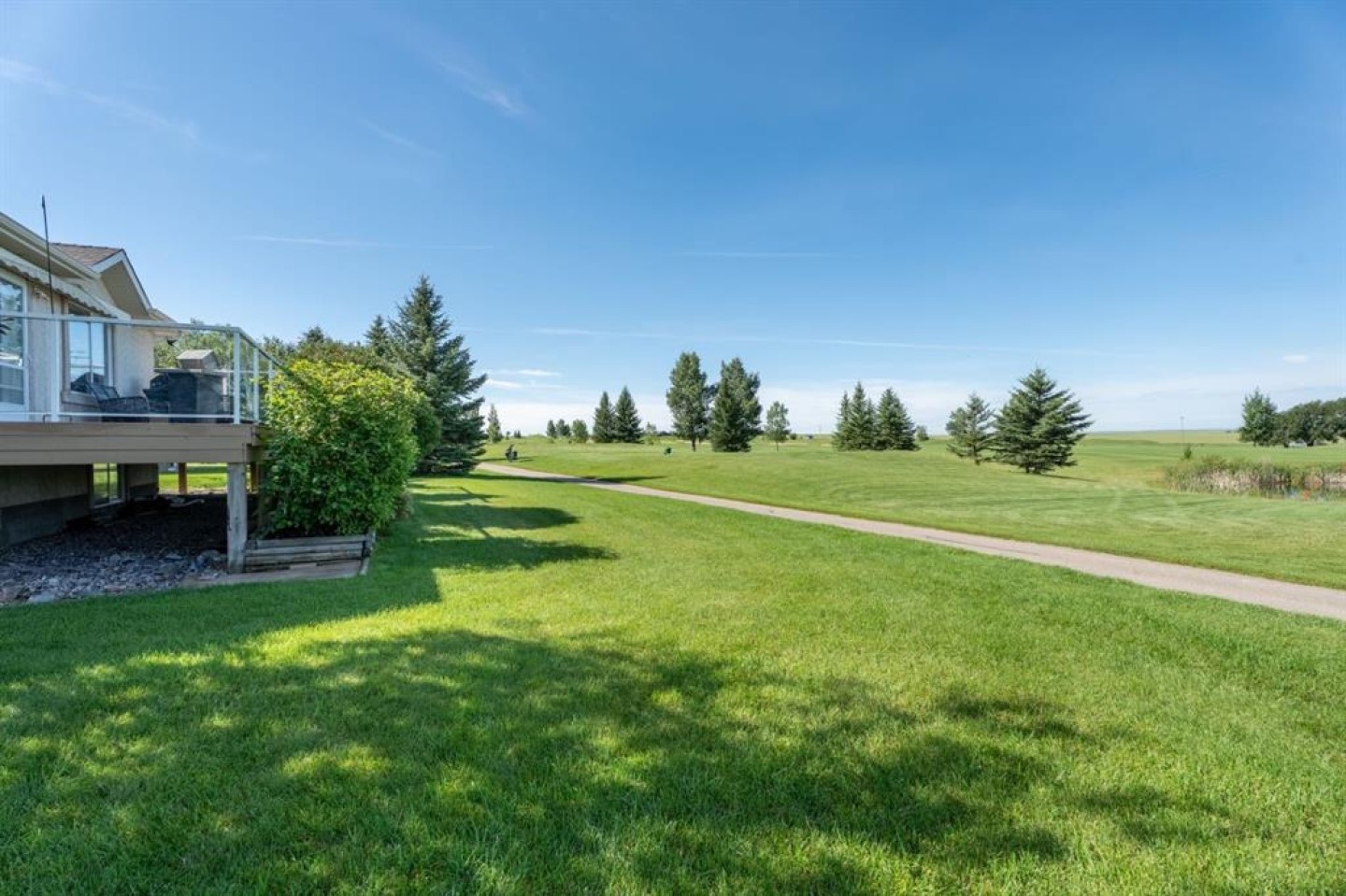 Welcome Home! Imagine life backing onto the 18th hole with a pond view, a view of the prairie fields and the mountains with a TRIPLE GARAGE for the Golf Cart or extra vehicle parking or storage! This well maintained charming bungalow has it all including a stucco exterior, air conditioning, a GAS FIREPLACE in the main floor living room and HEATED FLOORS in the fully finished basement! Retire or slow down your pace of life to the wonderful community of Vulcan, with a hospital, close to shopping, schools and so many things to get involved with year round. This home has a generously sized primary on the main floor with a fully accessible 3 piece ensuite and large walk-in closet. A large chef kitchen with a breakfast bar and dining room looking out at the western facing patio! The patio is equipped with a gas line for the BBQ and a large space to enjoy the outdoors with your own outside oasis! A cozy living room with a gas fireplace and a large gathering area to relax and slow down with a glass of wine after a day on the Greens! The laundry room is also on the main floor as well as a bright secondary bedroom. Downstairs is fully finished with in floor heat, a large recreation room, a wet bar as well a bedroom, and a 4 piece bathroom! There is tons of space for storage downstairs as well as a hobby room! Vacuflo is throughout the main floor and basement and even in the garage. Outside you have Underground Sprinklers and automatic watering for the flower beds to enjoy maintenance free yard in the summer months!! Come see this beautiful home today backing onto the Greens today in Whispering Creek Vulcan!