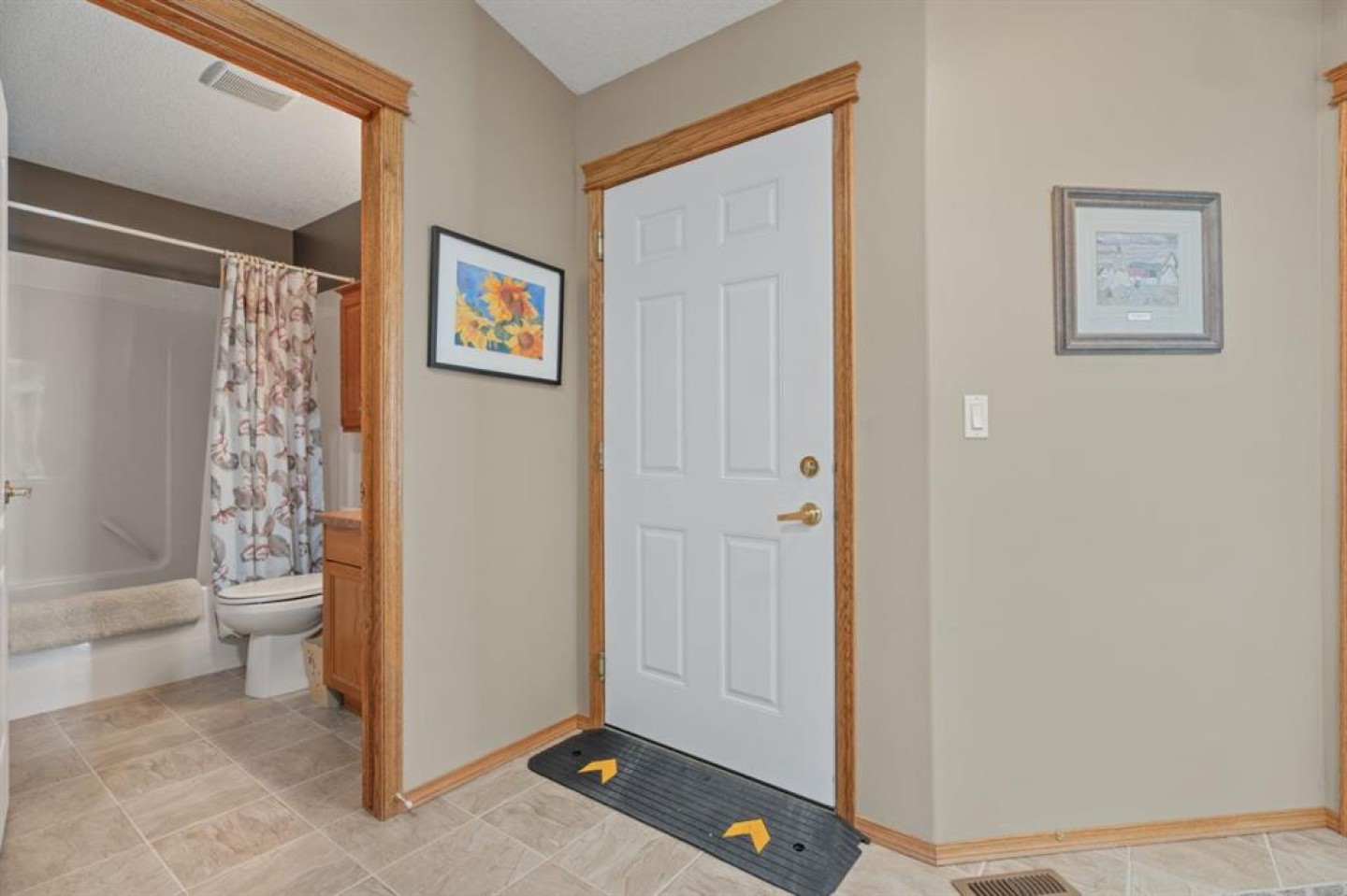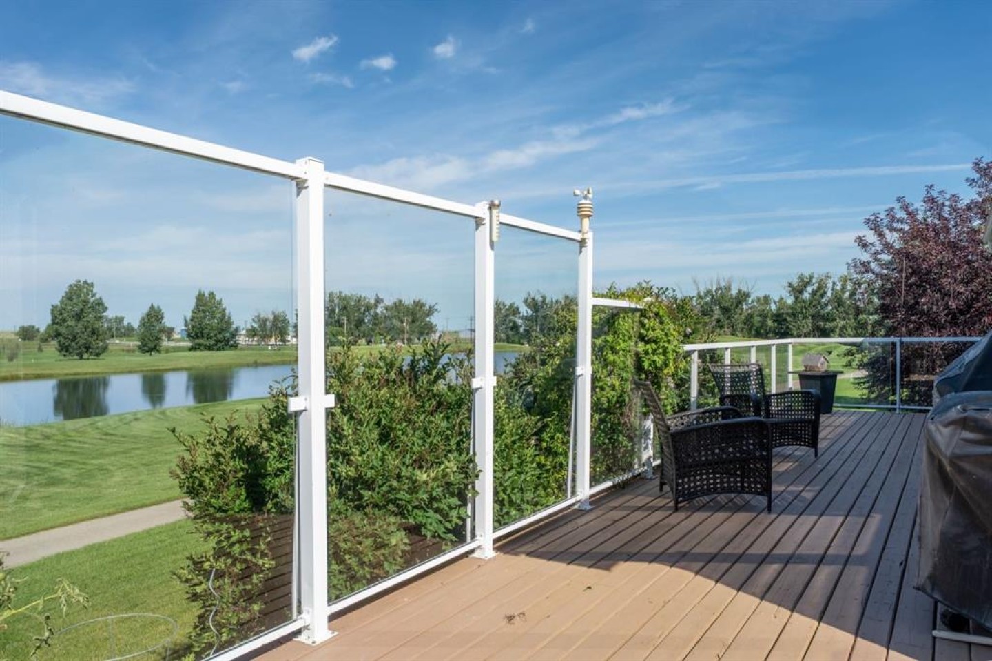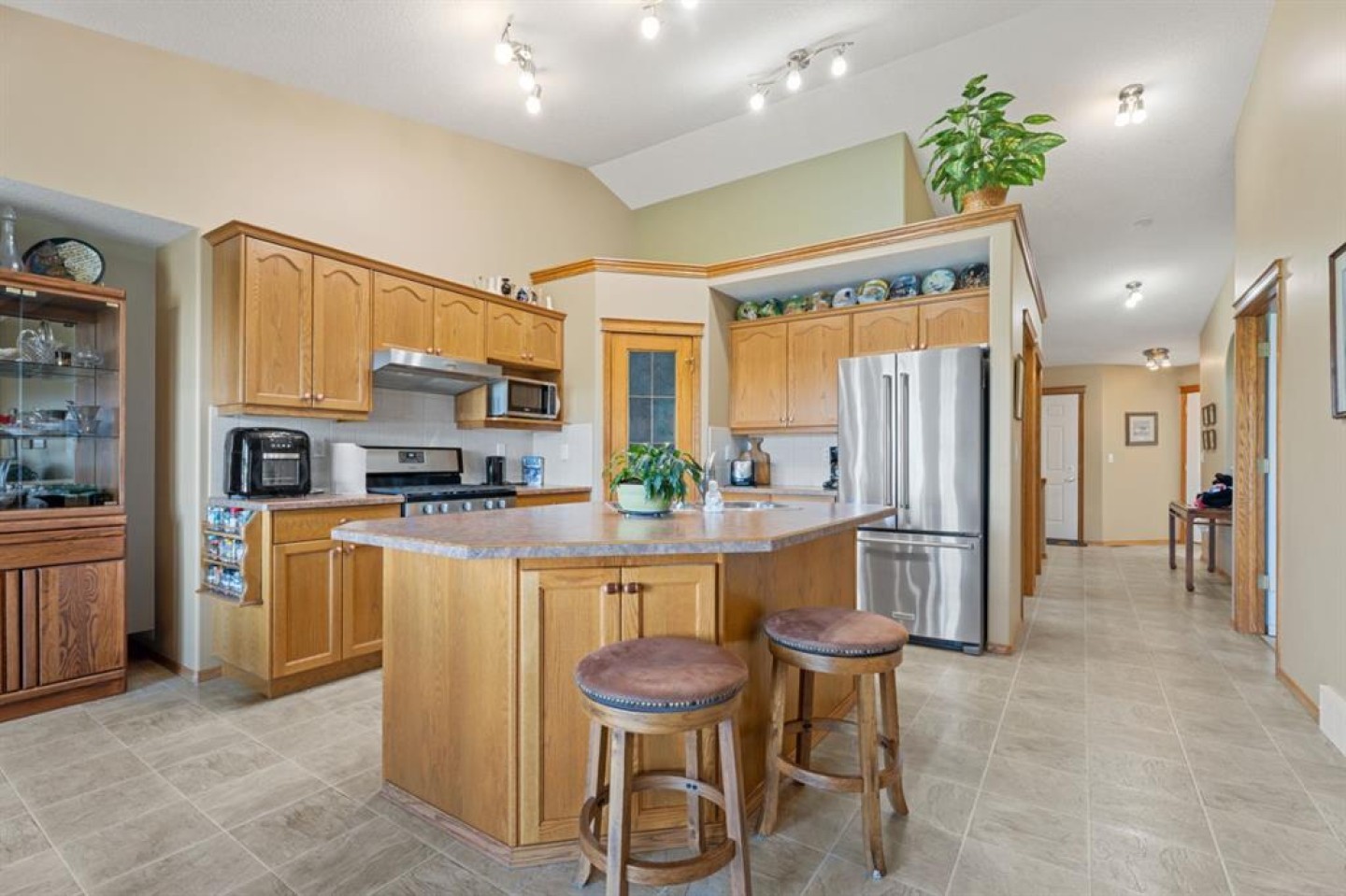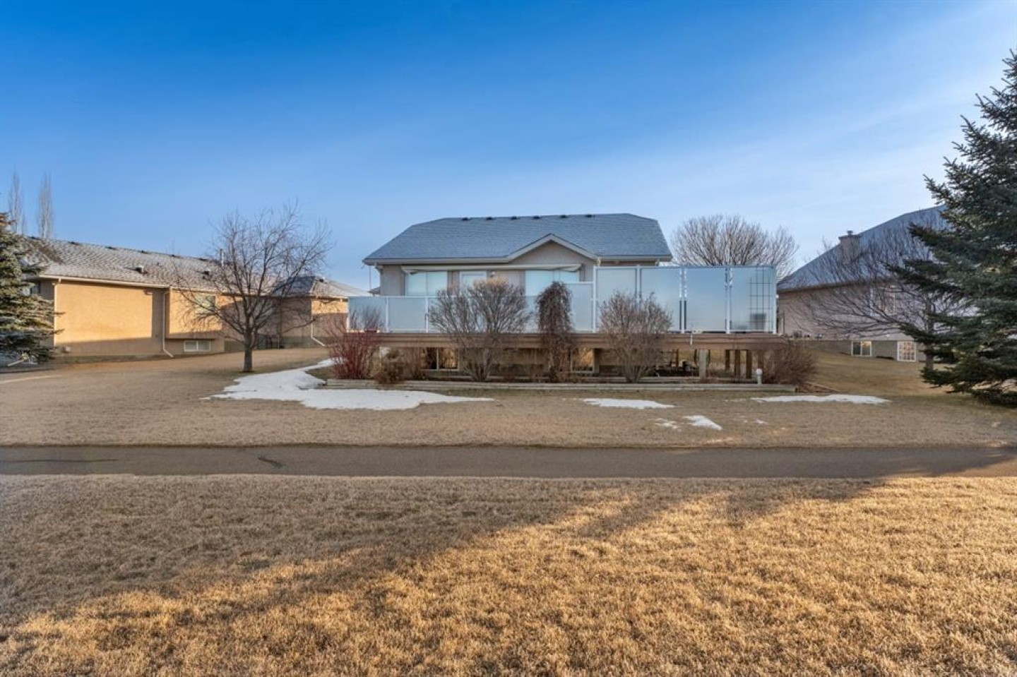 Welcome Home! Imagine life backing onto the 18th hole with a pond view, a view of the prairie fields and the mountains with a TRIPLE GARAGE for the Golf Cart or extra vehicle parking or storage! This well maintained charming bungalow has it all including a stucco exterior, air conditioning, a GAS FIREPLACE in the main floor living room and HEATED FLOORS in the fully finished basement! Retire or slow down your pace of life to the wonderful community of Vulcan, with a hospital, close to shopping, schools and so many things to get involved with year round. This home has a generously sized primary on the main floor with a fully accessible 3 piece ensuite and large walk-in closet. A large chef kitchen with a breakfast bar and dining room looking out at the western facing patio! The patio is equipped with a gas line for the BBQ and a large space to enjoy the outdoors with your own outside oasis! A cozy living room with a gas fireplace and a large gathering area to relax and slow down with a glass of wine after a day on the Greens! The laundry room is also on the main floor as well as a bright secondary bedroom. Downstairs is fully finished with in floor heat, a large recreation room, a wet bar as well a bedroom, and a 4 piece bathroom! There is tons of space for storage downstairs as well as a hobby room! Vacuflo is throughout the main floor and basement and even in the garage. Outside you have Underground Sprinklers and automatic watering for the flower beds to enjoy maintenance free yard in the summer months!! Come see this beautiful home today backing onto the Greens today in Whispering Creek Vulcan!