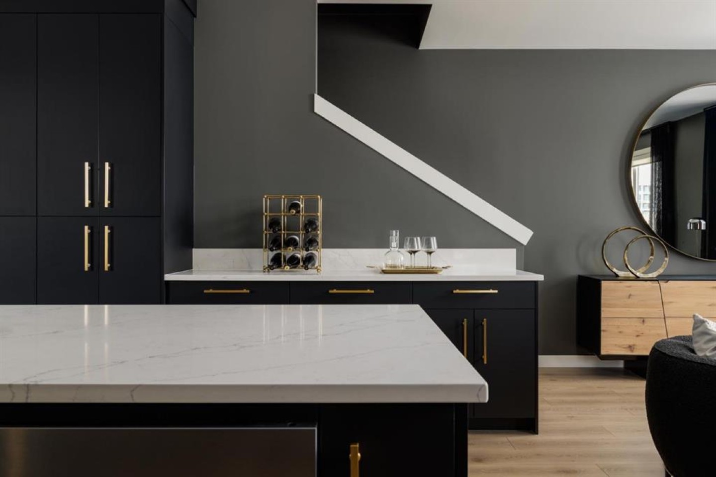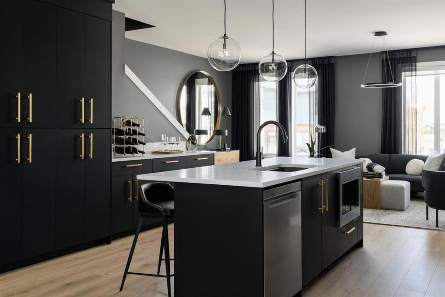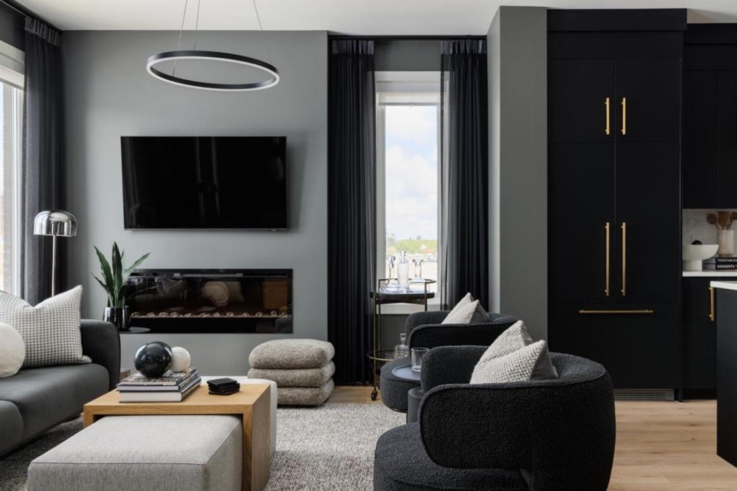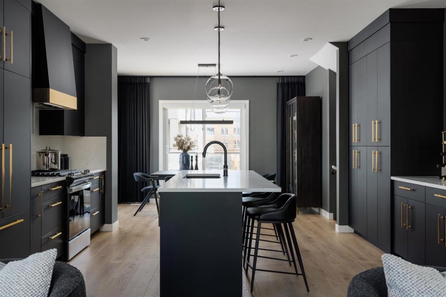 The main living level is bright and inviting, with soaring ceilings, wide-plank flooring, and an open-concept layout designed for modern living. The chef-inspired kitchen is a showpiece, featuring full-height cabinetry with soft-close doors, a gas range, integrated refrigerator, built-in microwave, and a spacious pantry. A large eat-up quartz island anchors the space—perfect for casual dining, hosting friends, or enjoying a quiet morning coffee.